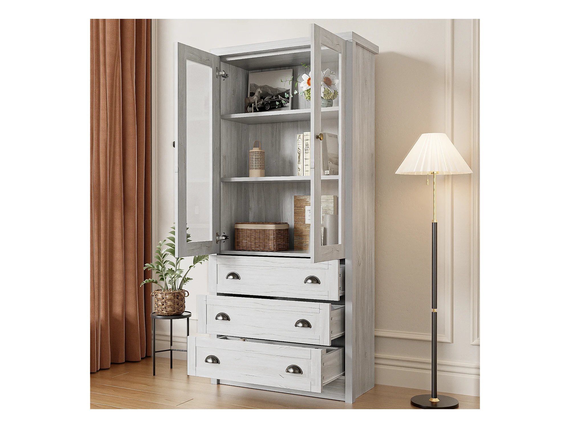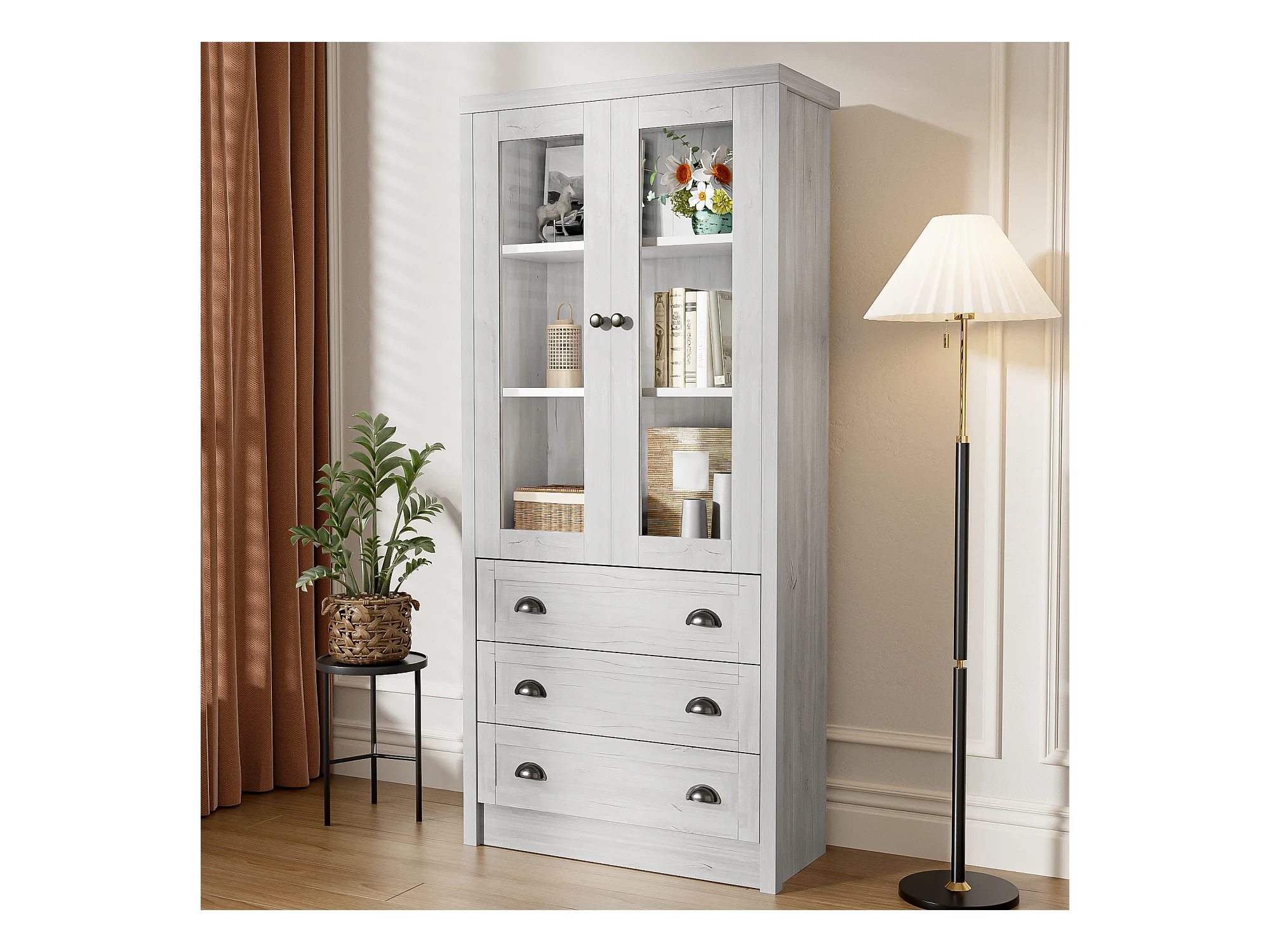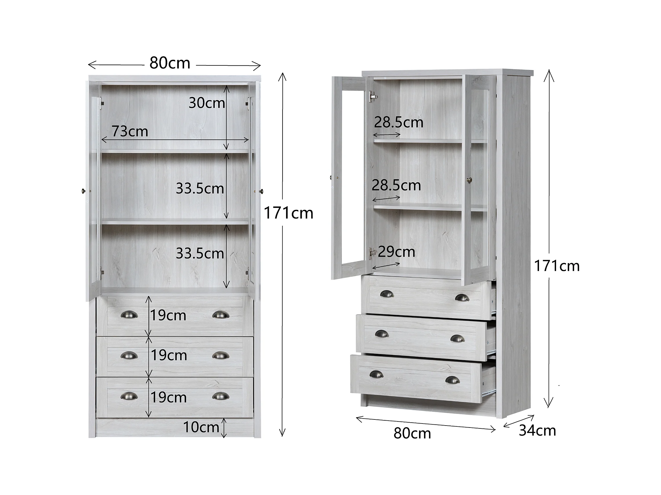 Buffet haut moderne - 80 x 34 x 171 cm – avec 2 portes vitrées + 3 tiroirs – aggloméré - naturel clair