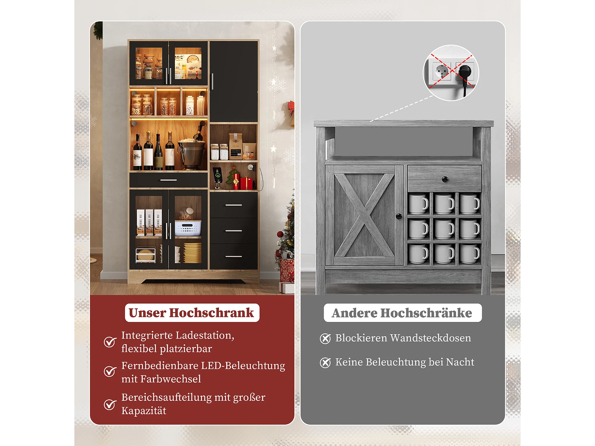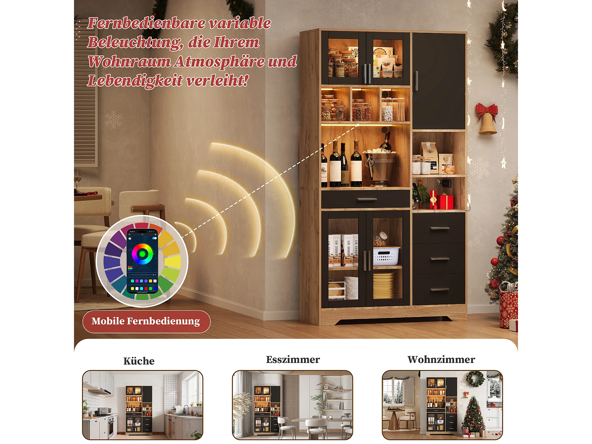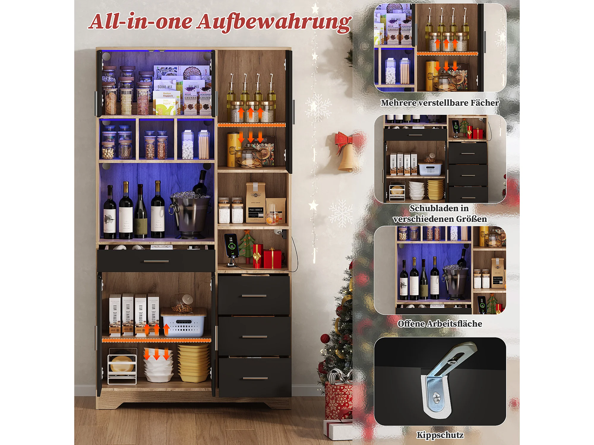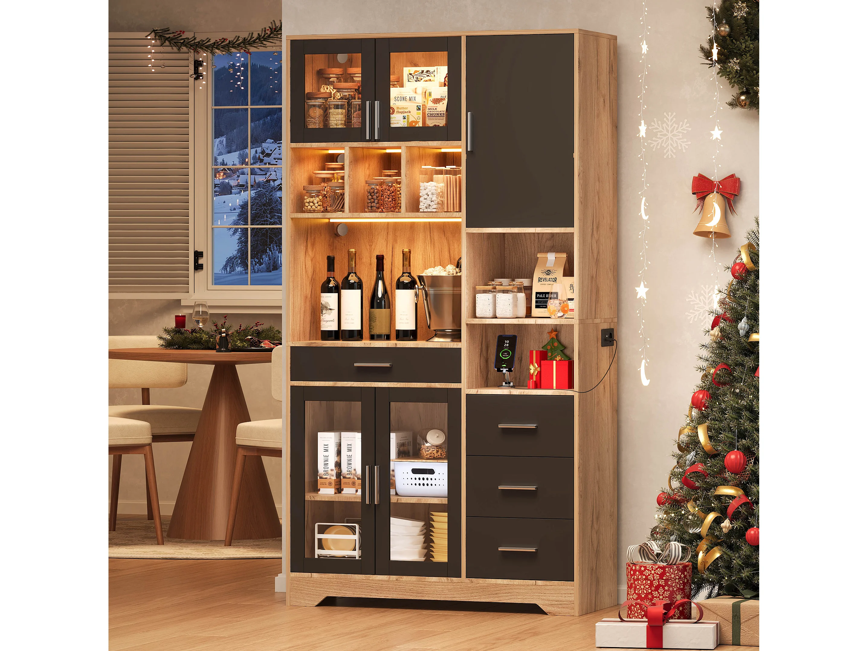 Buffet haute de cuisine - 100 x 40 x 185 cm - avec 4 tiroirs + Leds + portes + étagères - MDF - naturel + noir