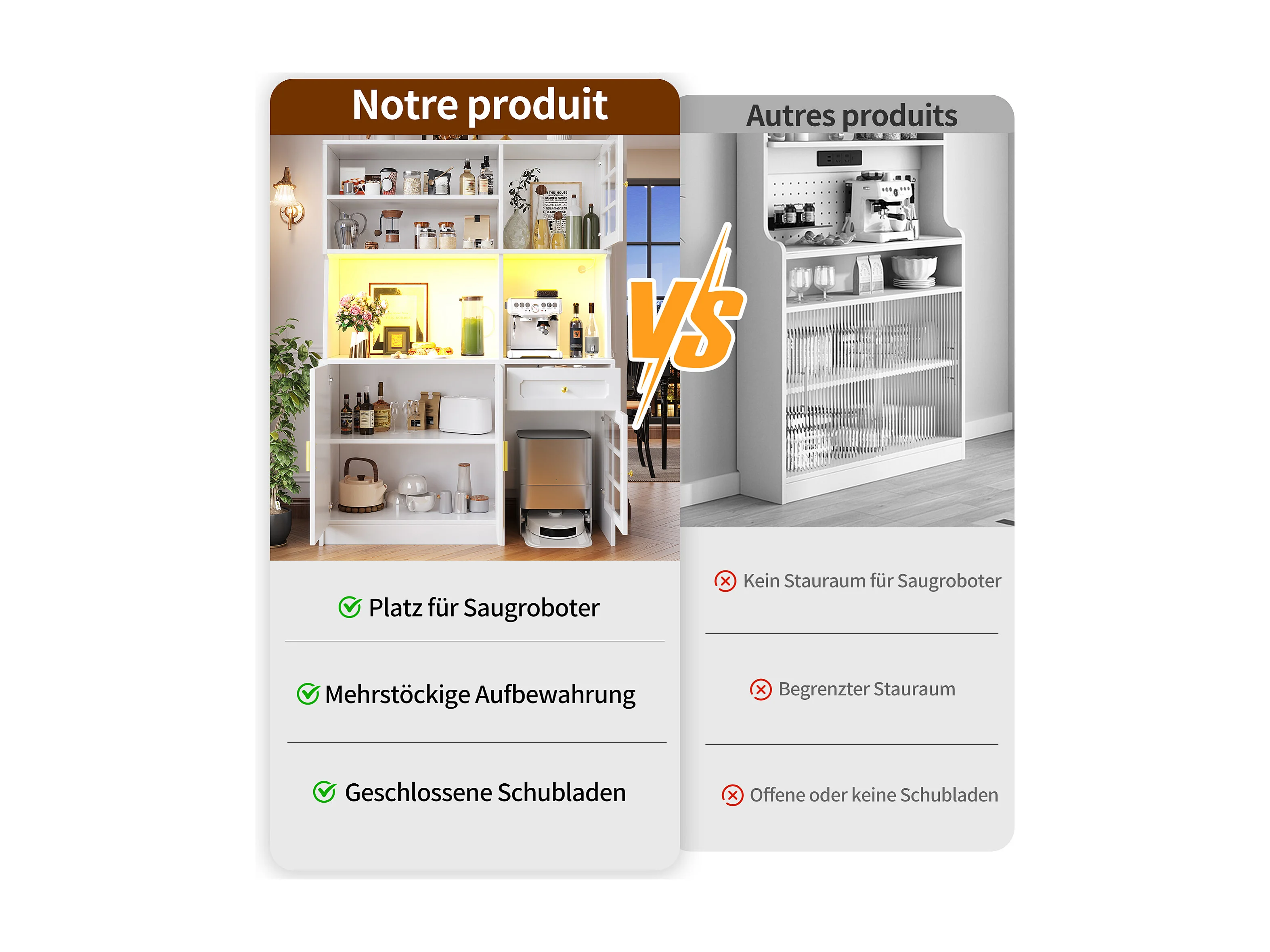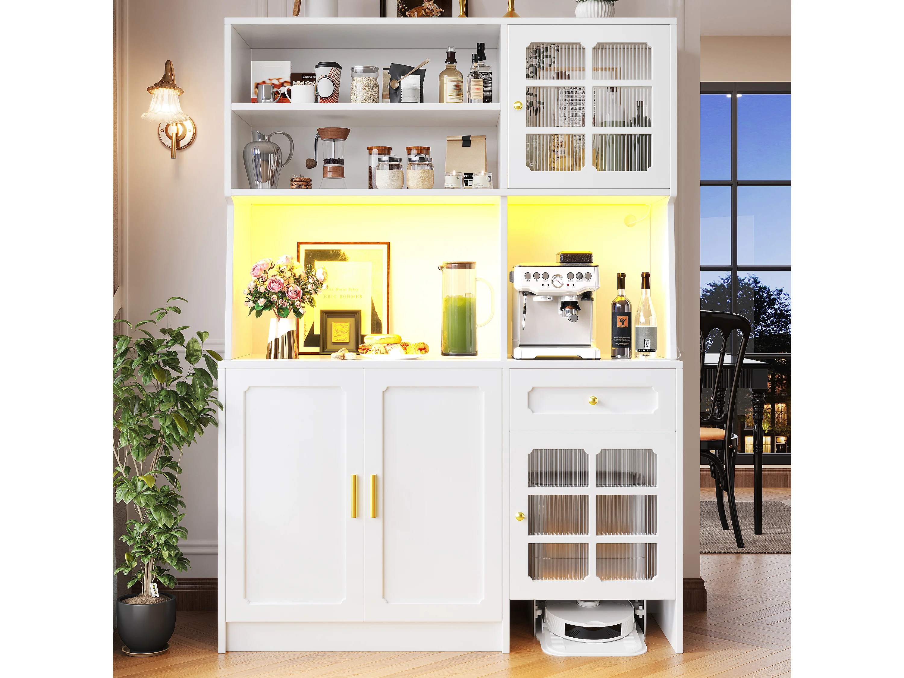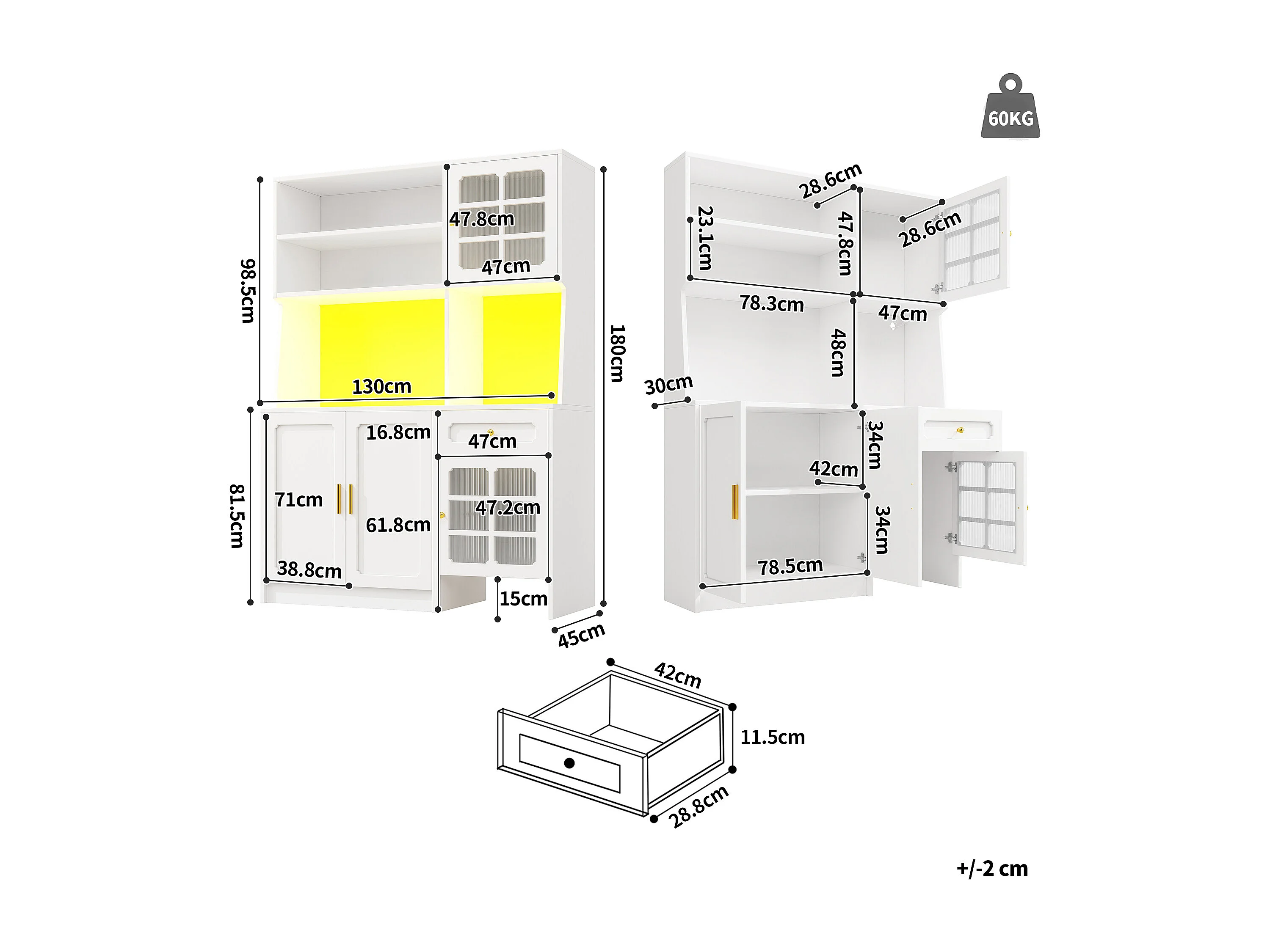 Buffet haute de cuisine - 130 x 45 x 180 cm - avec portes vitrées + Leds + tiroir + étagère - MDF - blanc
