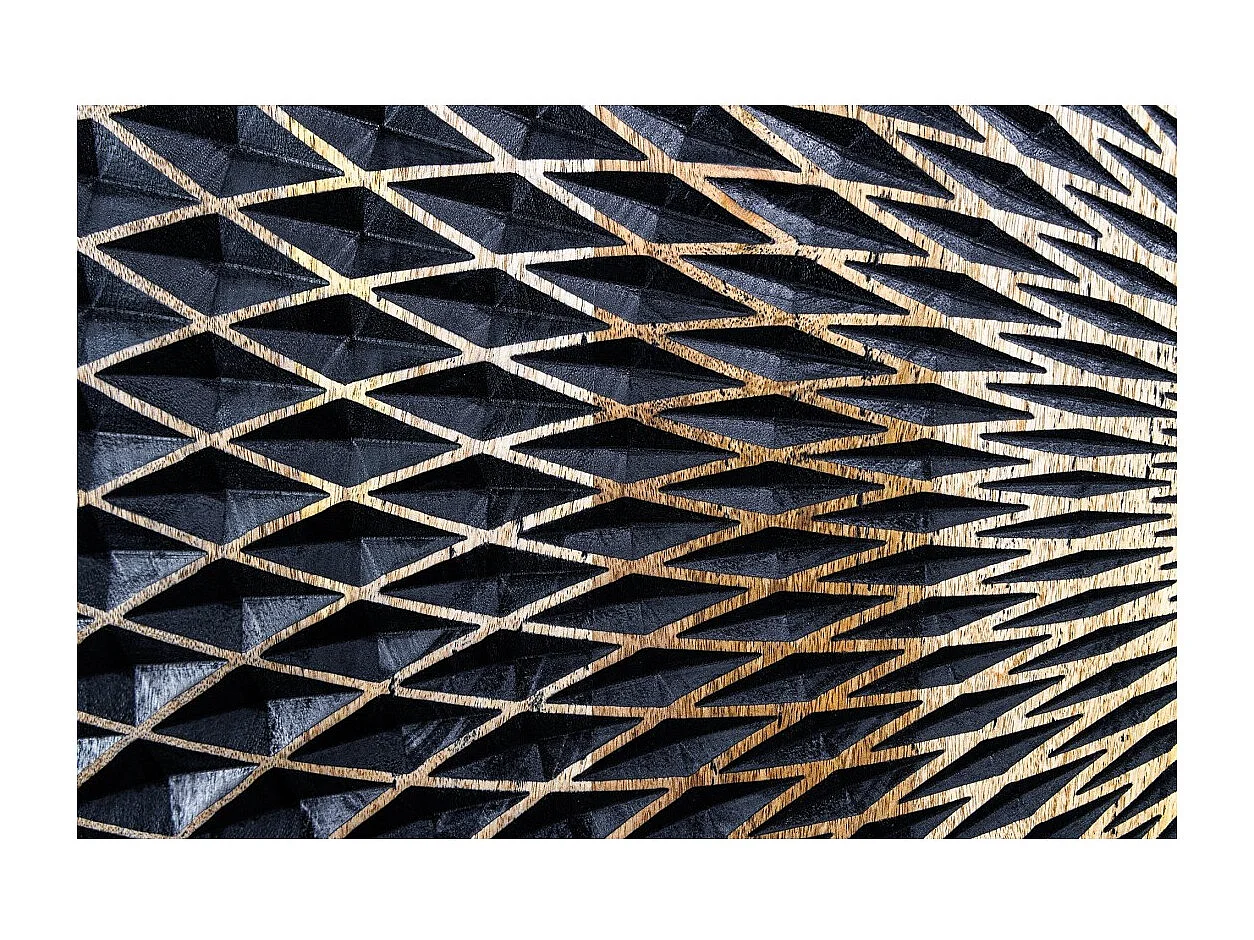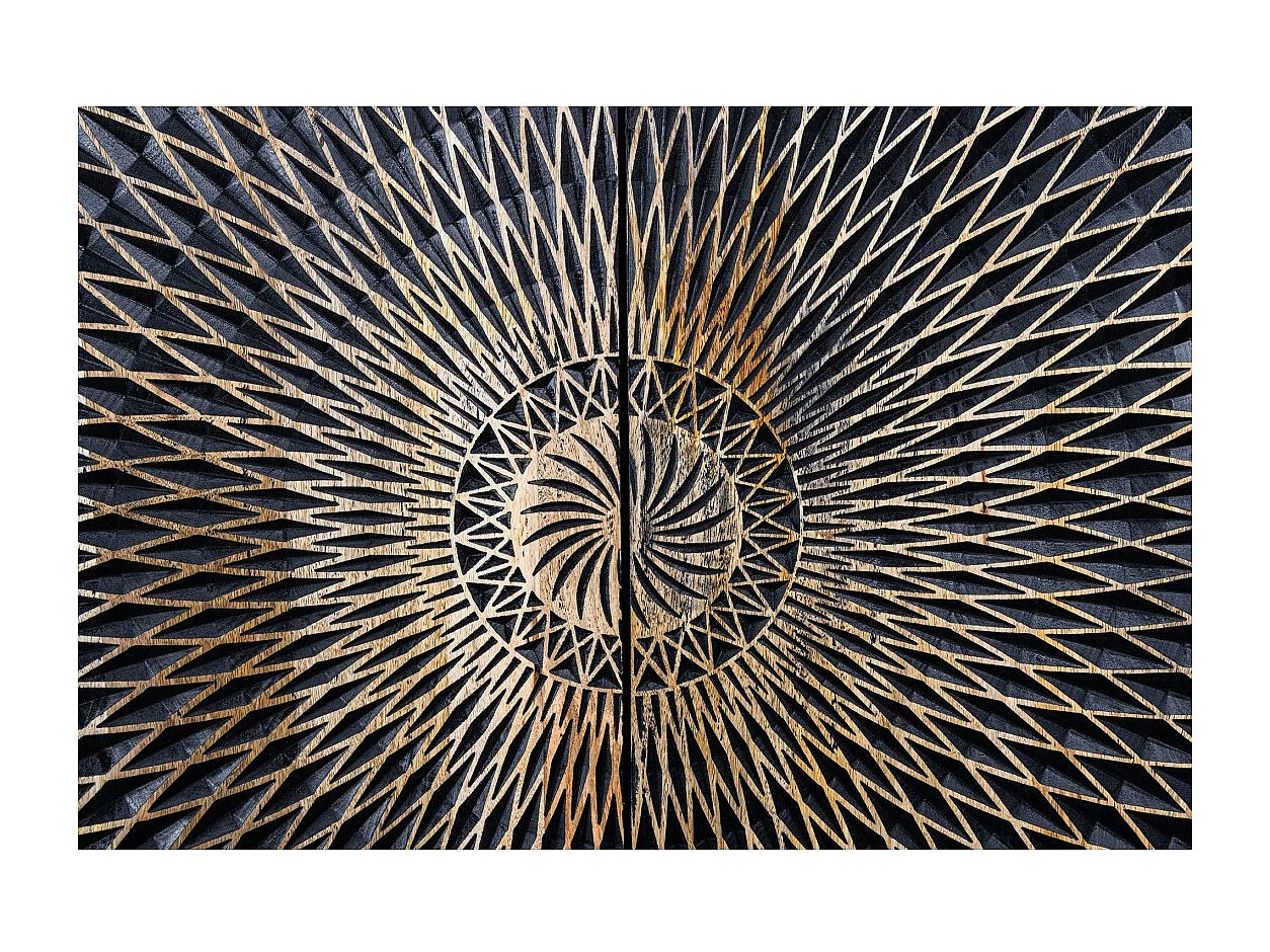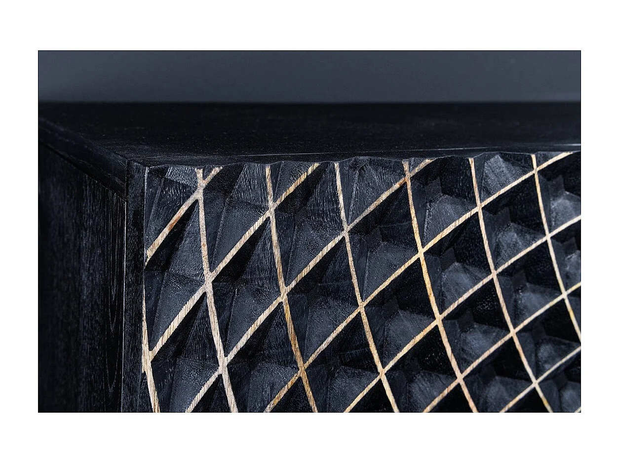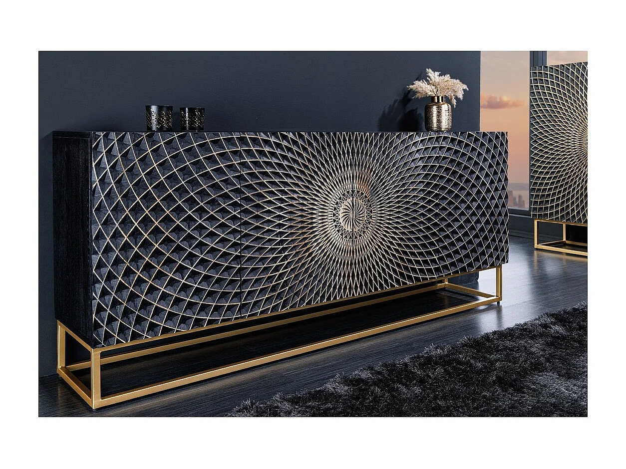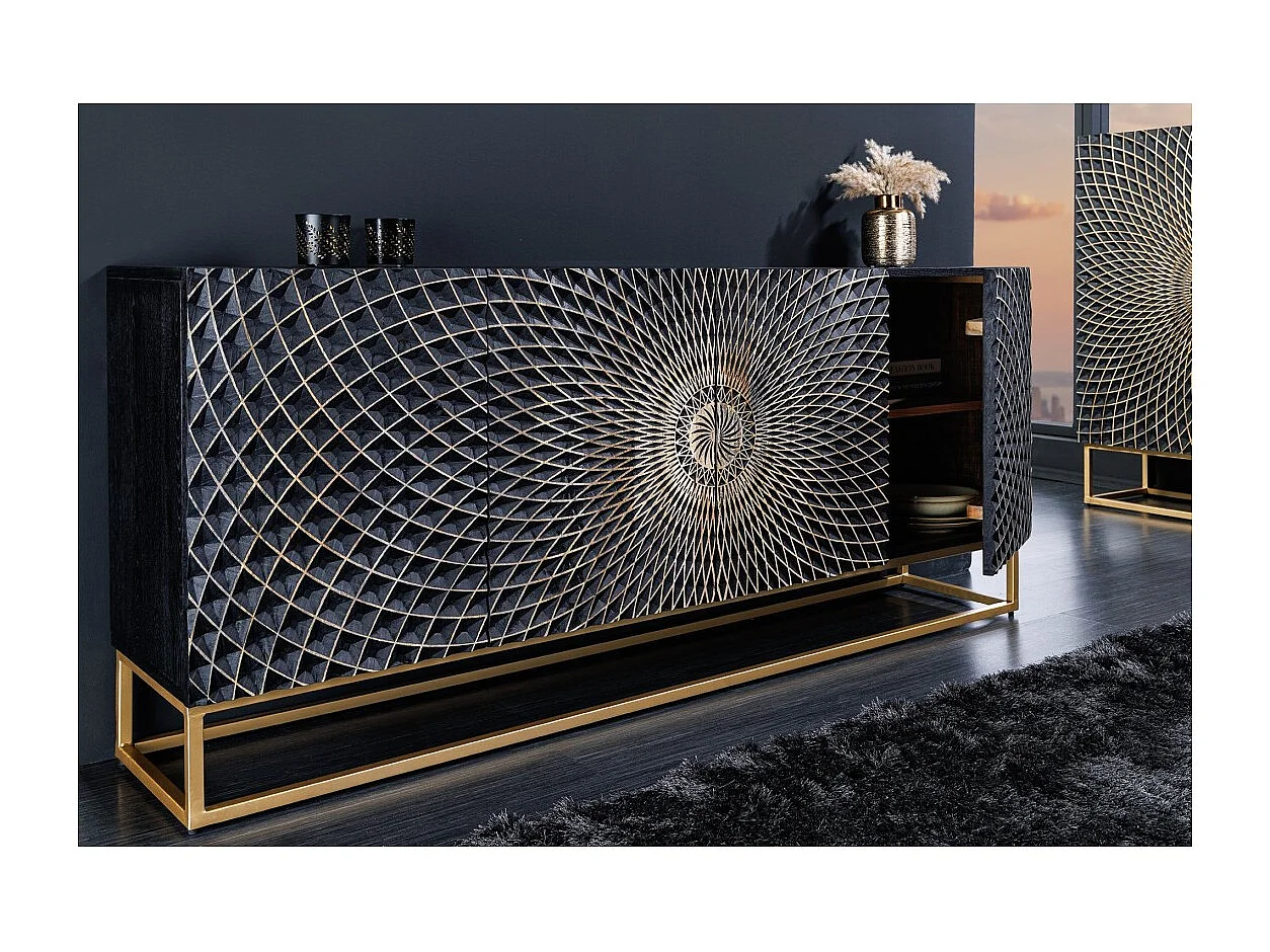 Buffet KOSMOS 180 cm – Bois massif noir sculpté 3D – Pieds métal doré