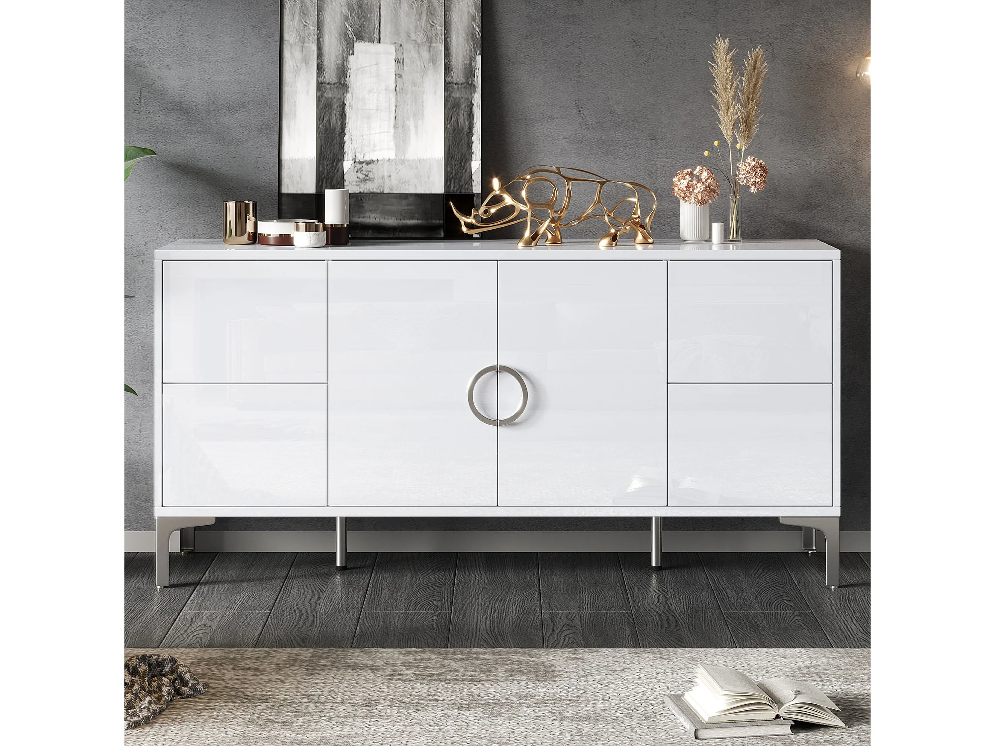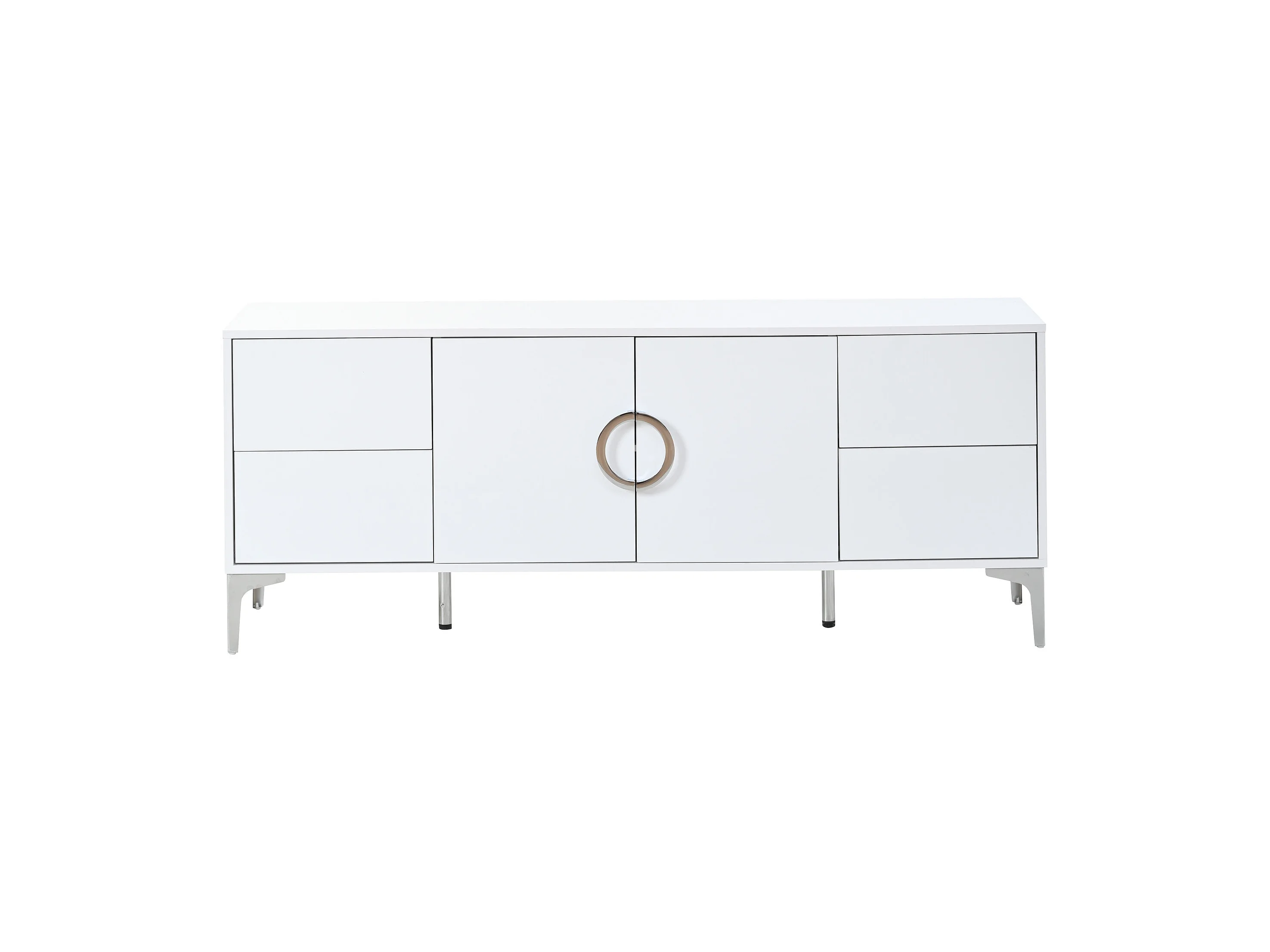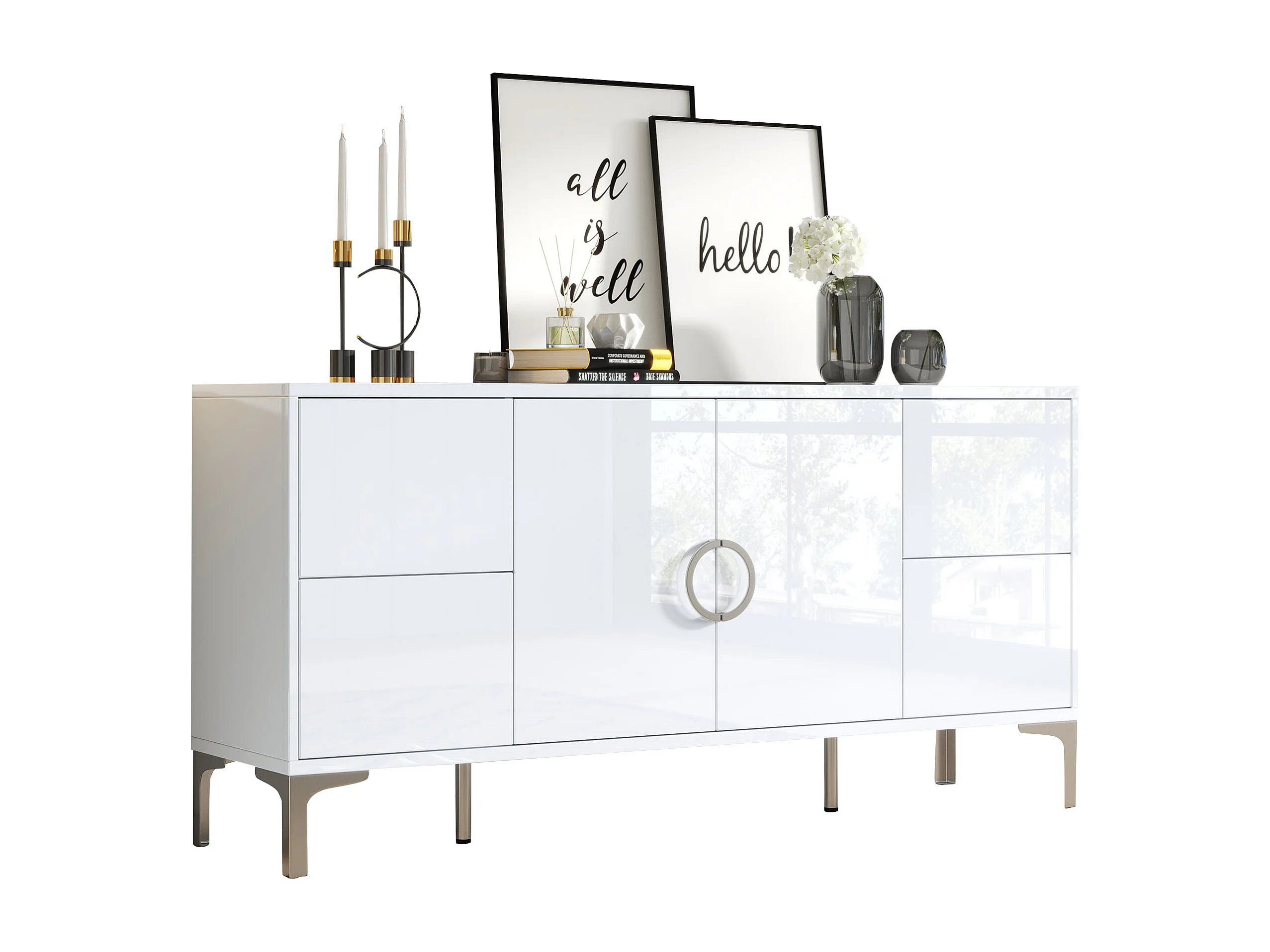 Buffet laqué brillant 150x38x59.5 cm - avec 4 tiroirs et 2 portes - Pieds en métal - MDF - Blanc