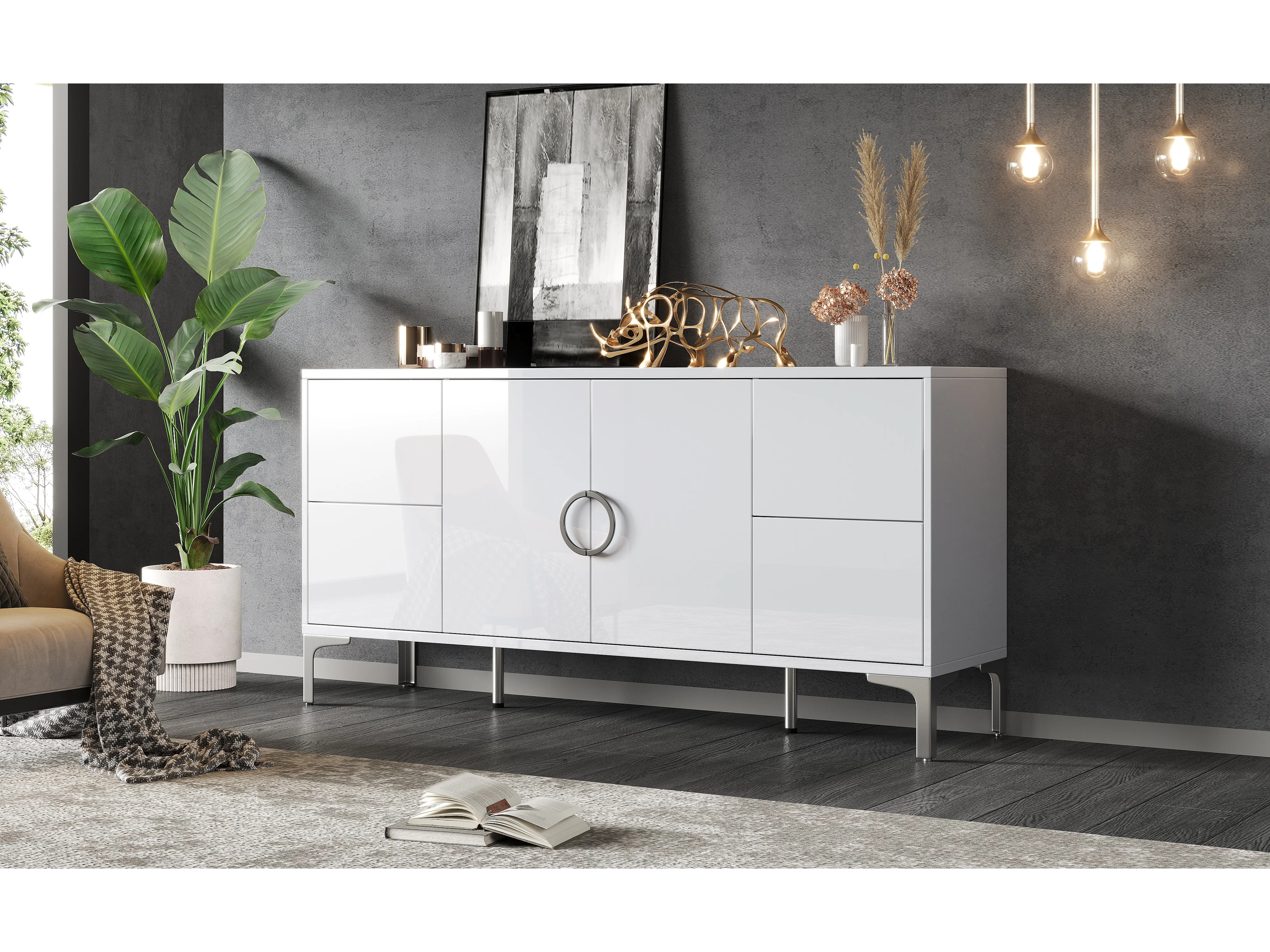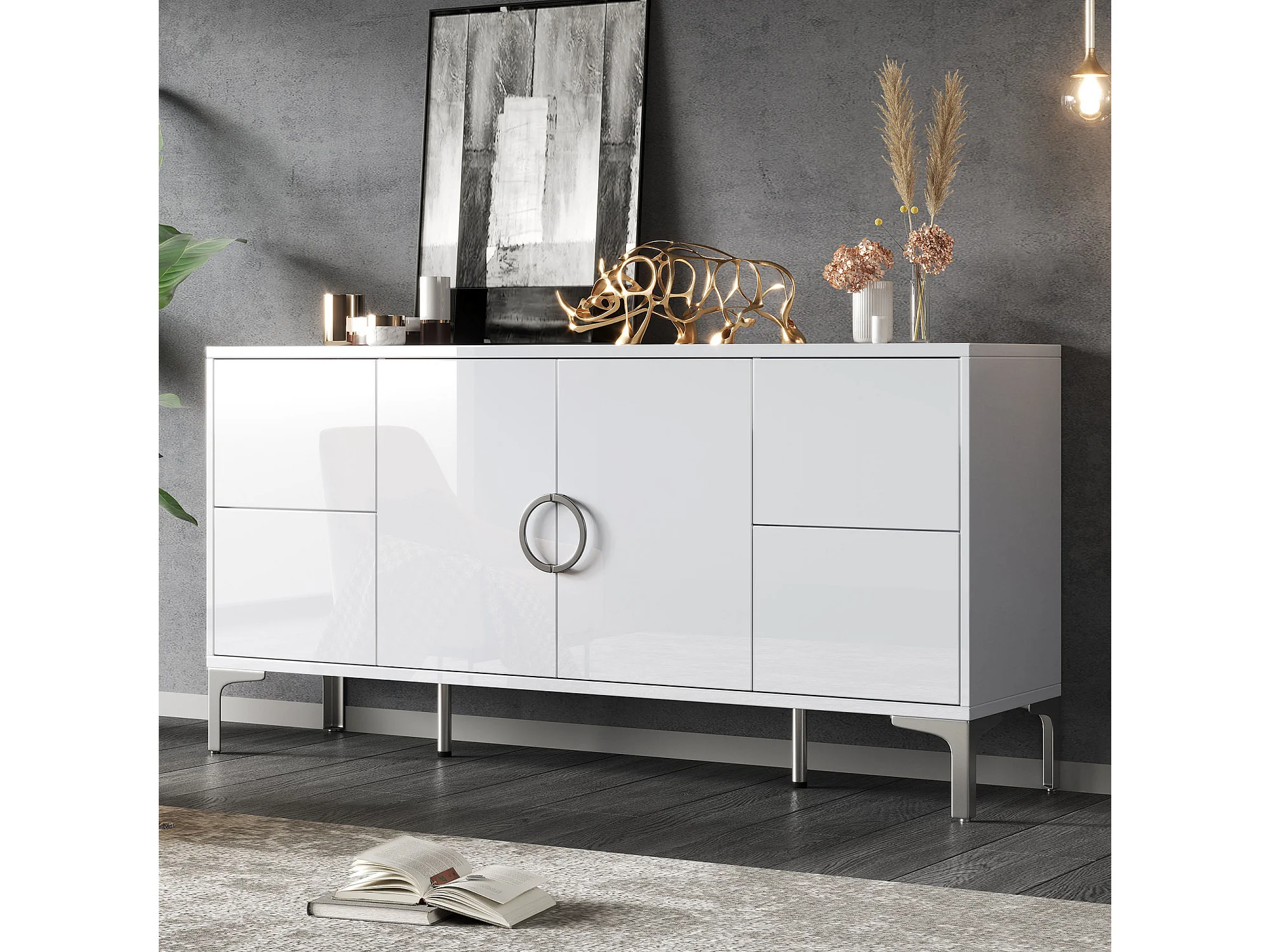 Buffet laqué brillant de salon - 150 x 38 x 59.5 cm - avec 4 tiroirs + 2 portes - pieds de support en métal - MDF - blanc