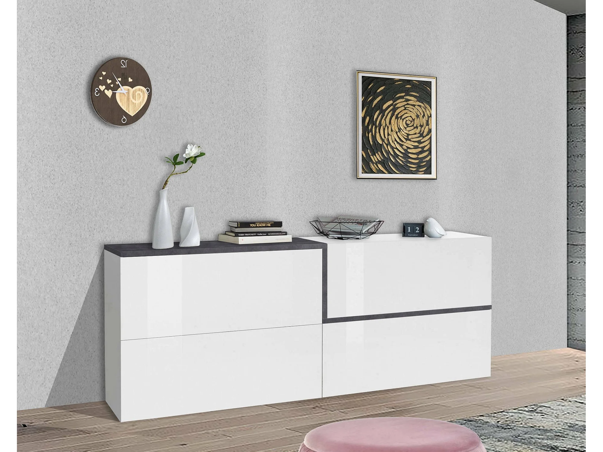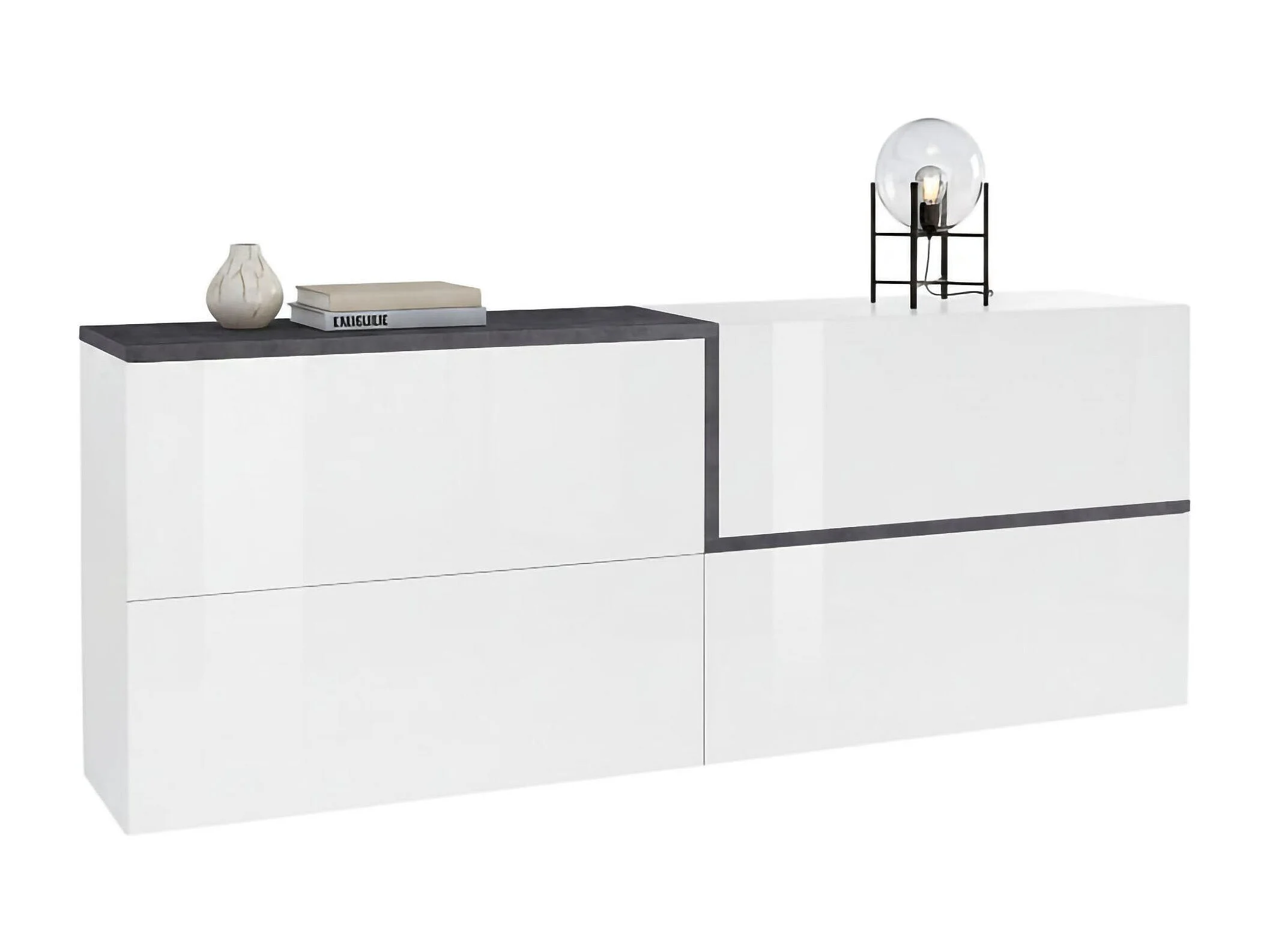 Buffet Livio, Buffet de cuisine, Buffet de salon, 100% Made in Italy, 210x40h80 cm, Blanc brillant et ardoise