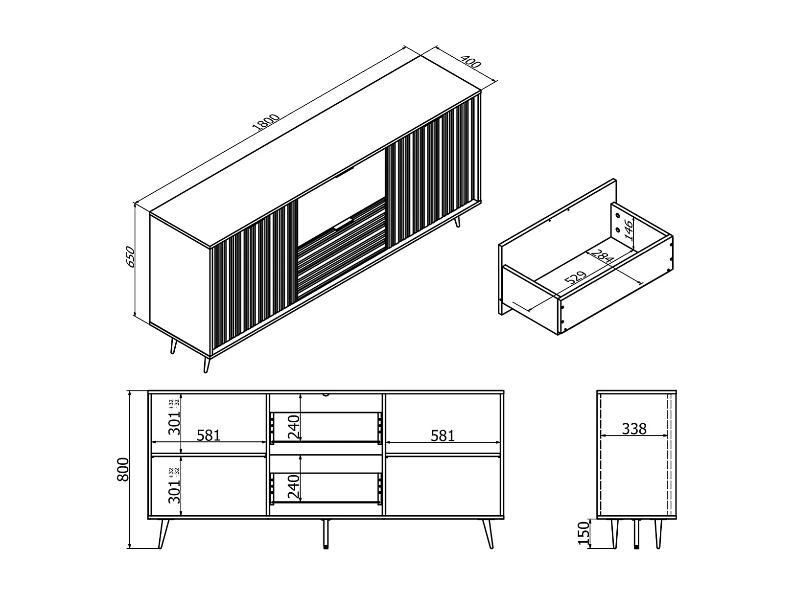 Buffet long 2 portes 2 tiroirs Luka Bois et Noir