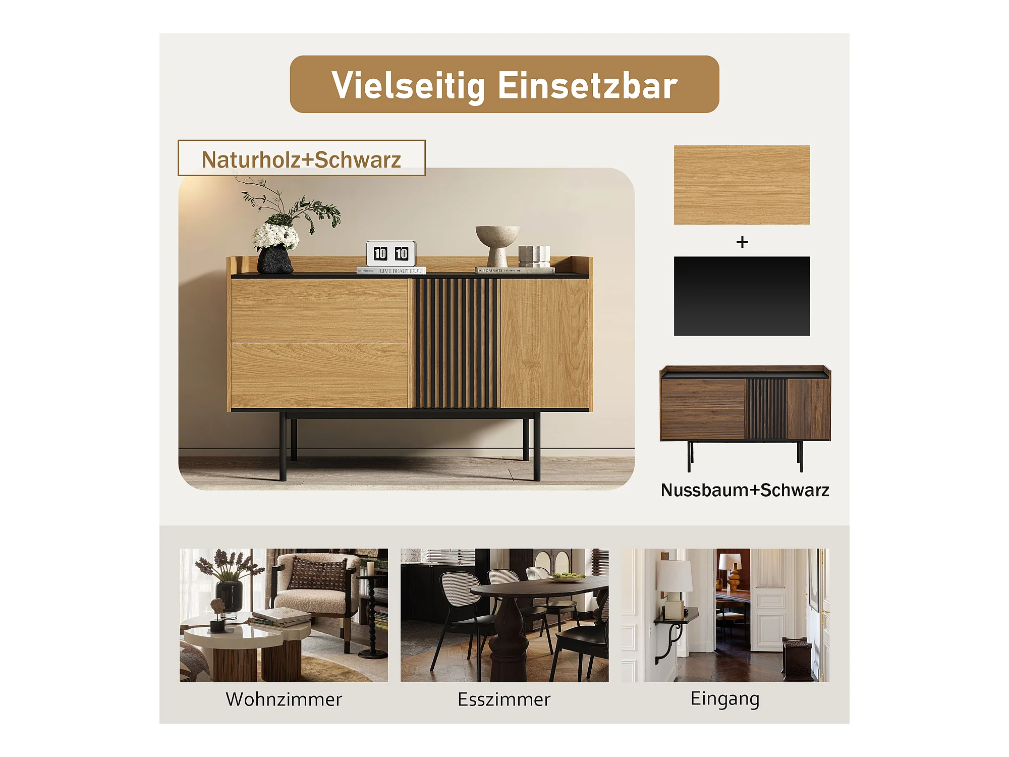 Buffet minimaliste moderne avec 2 tiroirs et étagère réglable, MDF, bois naturel et noir (141.61x46.99x12.07 cm)