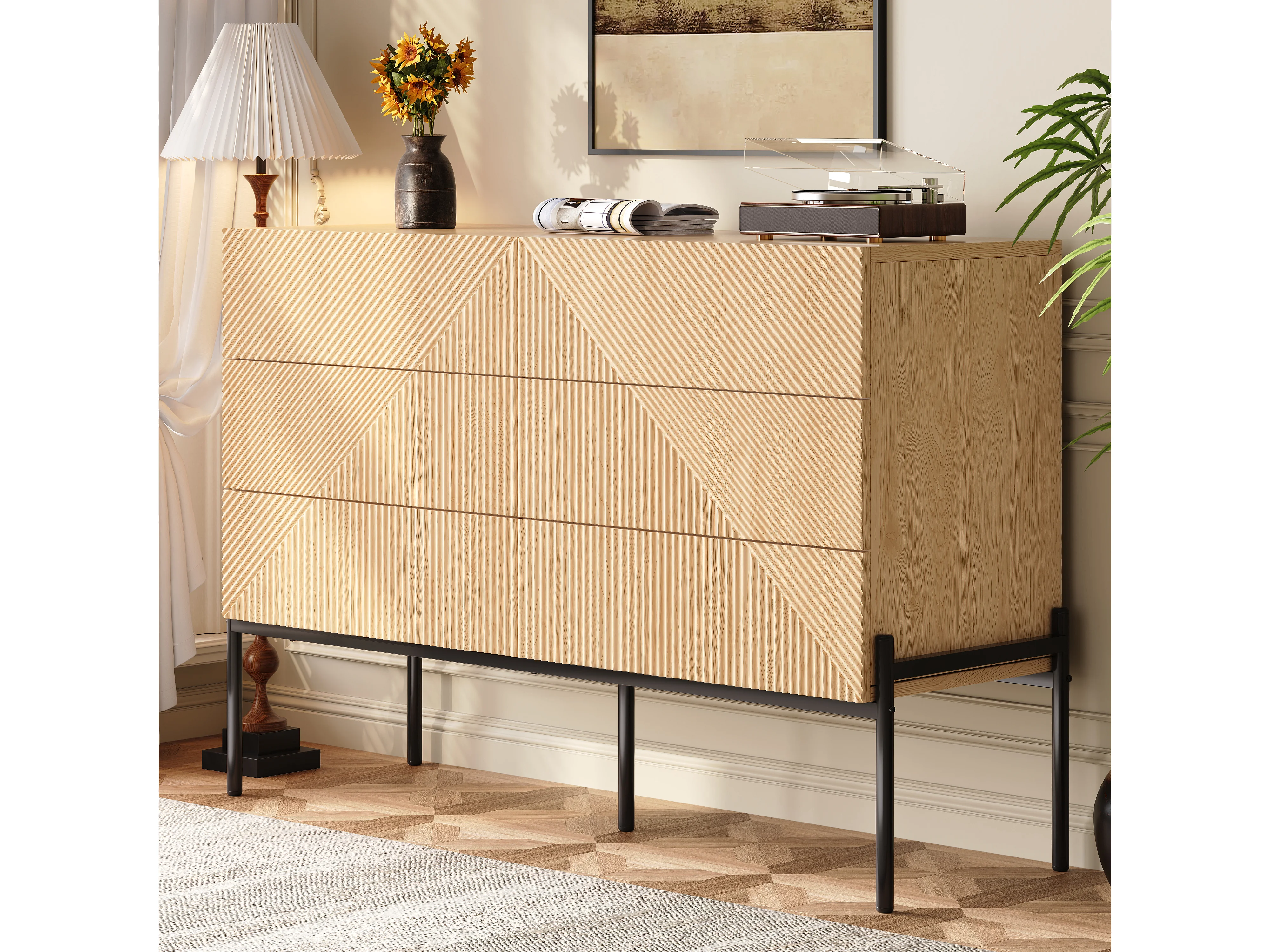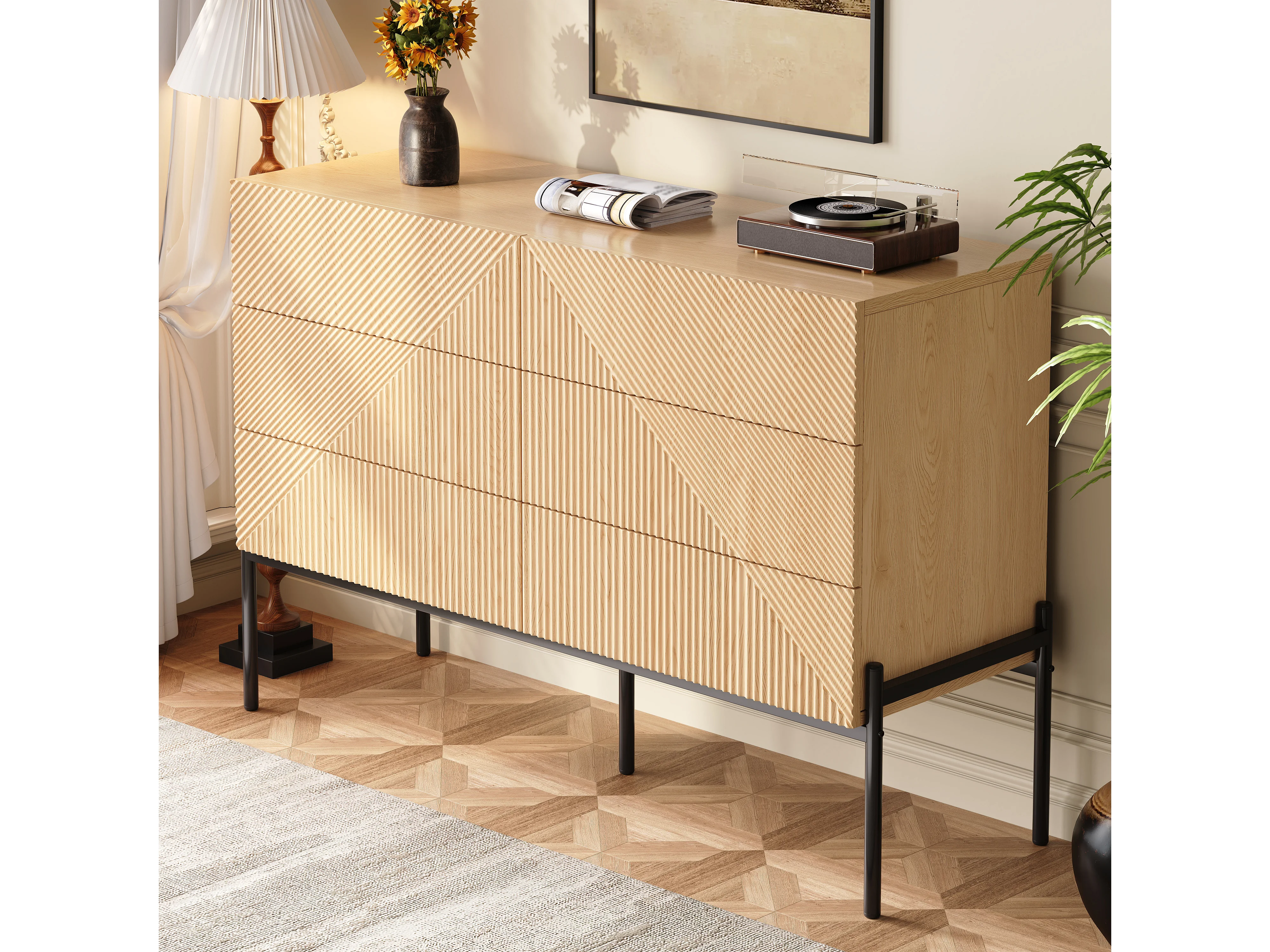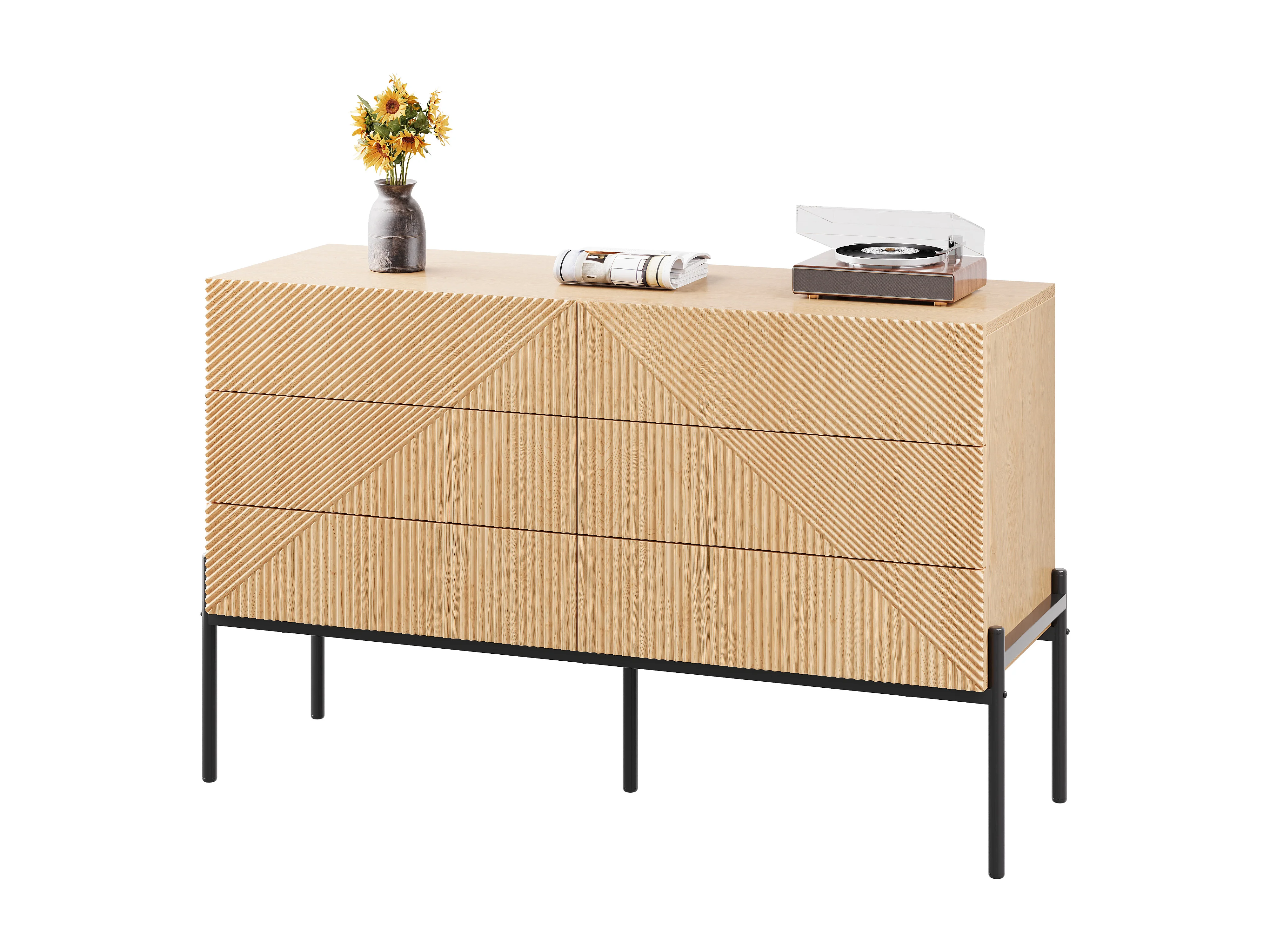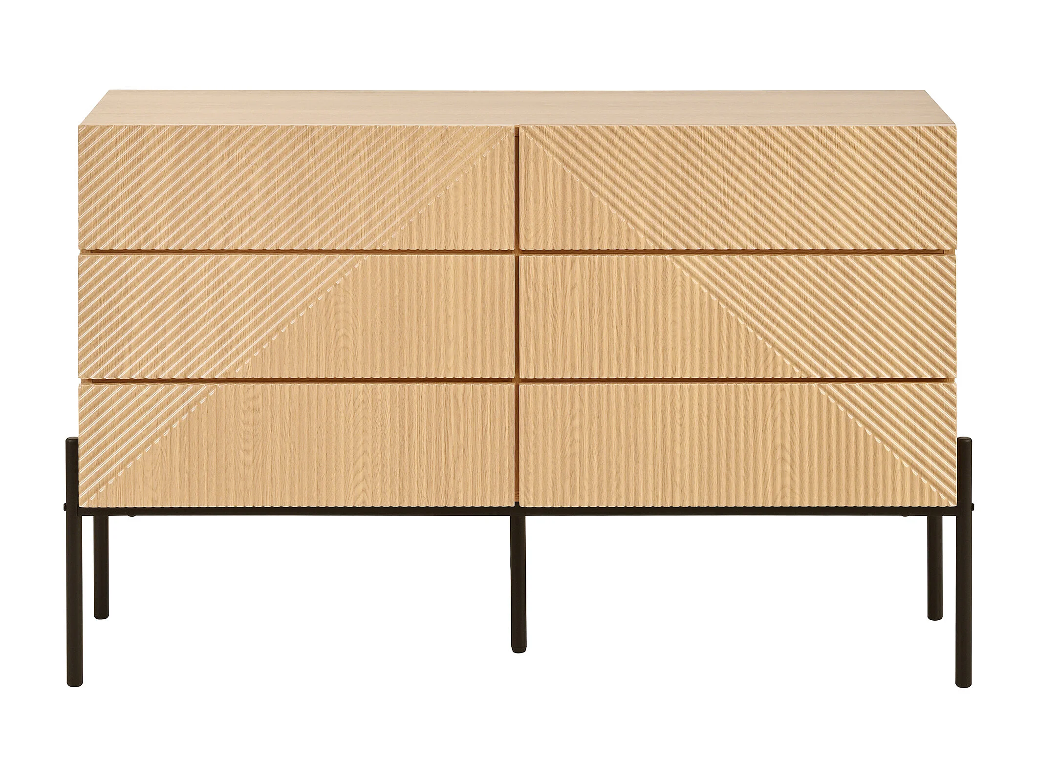 Buffet moderne 115.5 x 38 x 75 cm - avec 6 tiroirs - Texture 3D - Pieds en fer - MDF - Naturel