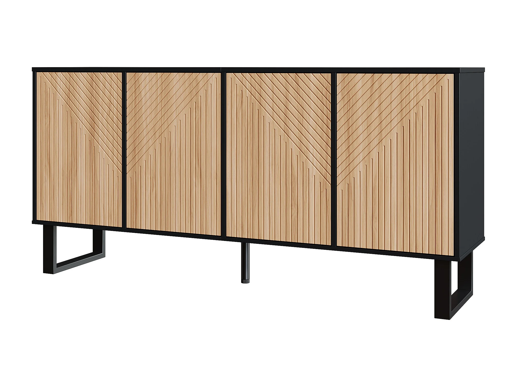Buffet moderne 160x38x75 cm - 4 portes - Motif rayé 3D - Structure en fer - Naturel et noir