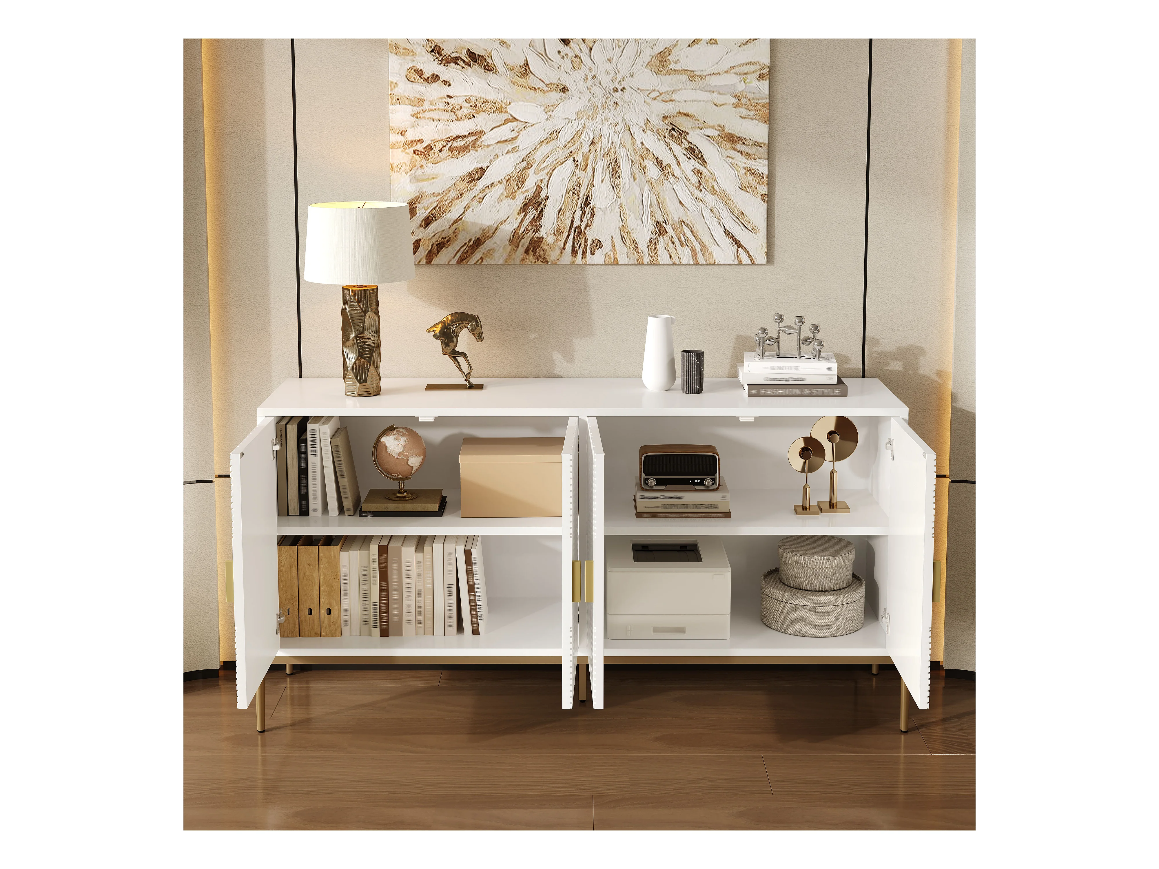 Buffet 140x40x80cm - 4 portes - avec étagères réglables - Blanc + Or