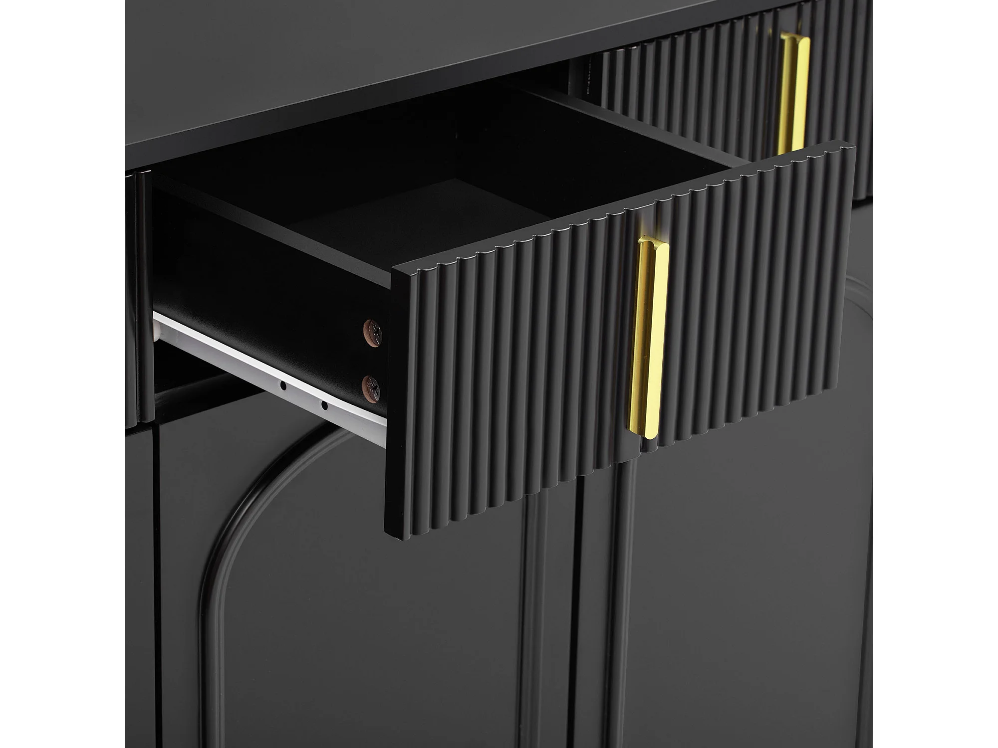 Buffet moderne, 4 portes, 4 tiroirs, finition bois et noir, avec détails dorés (140x37.8x82 cm)
