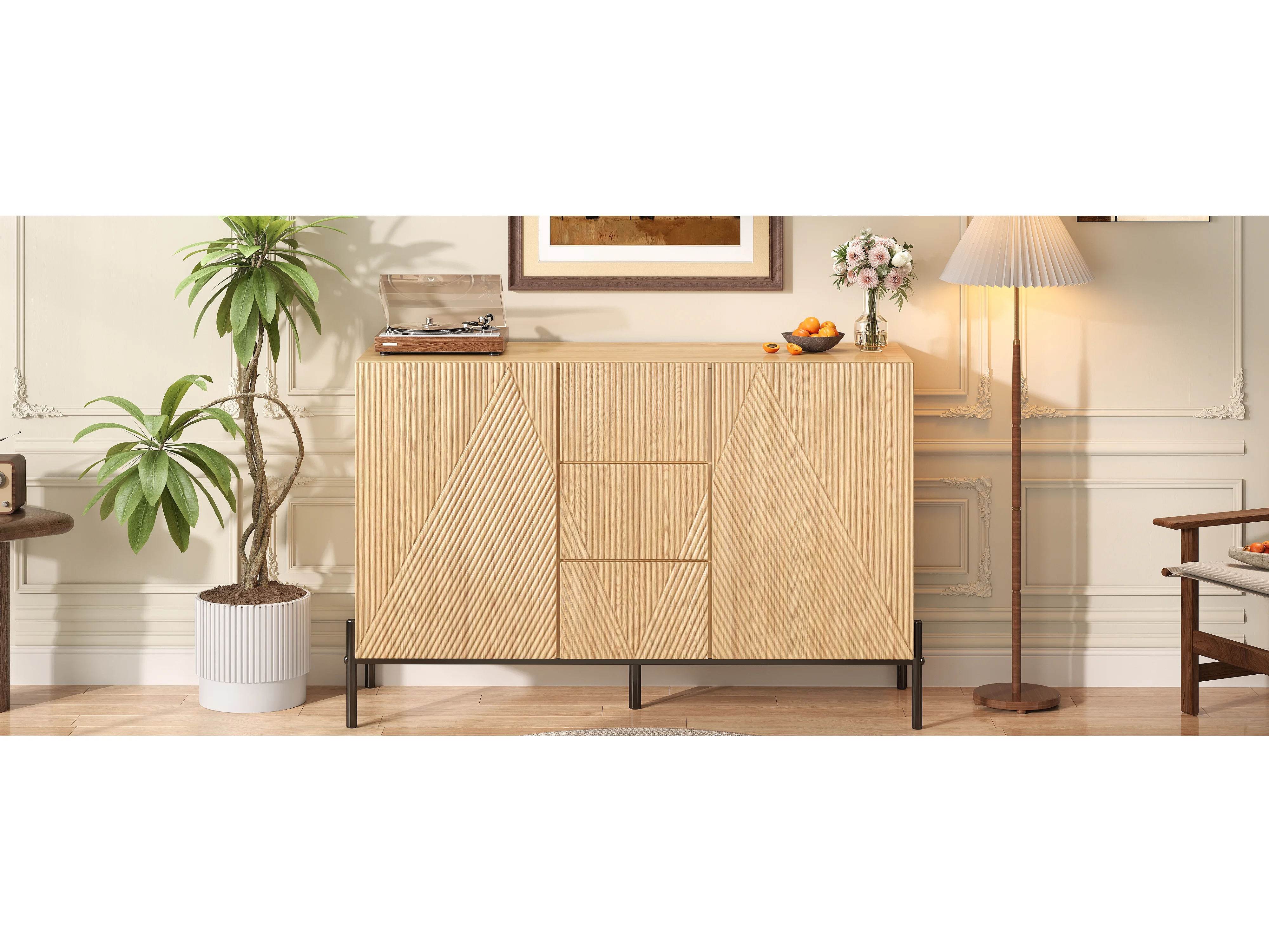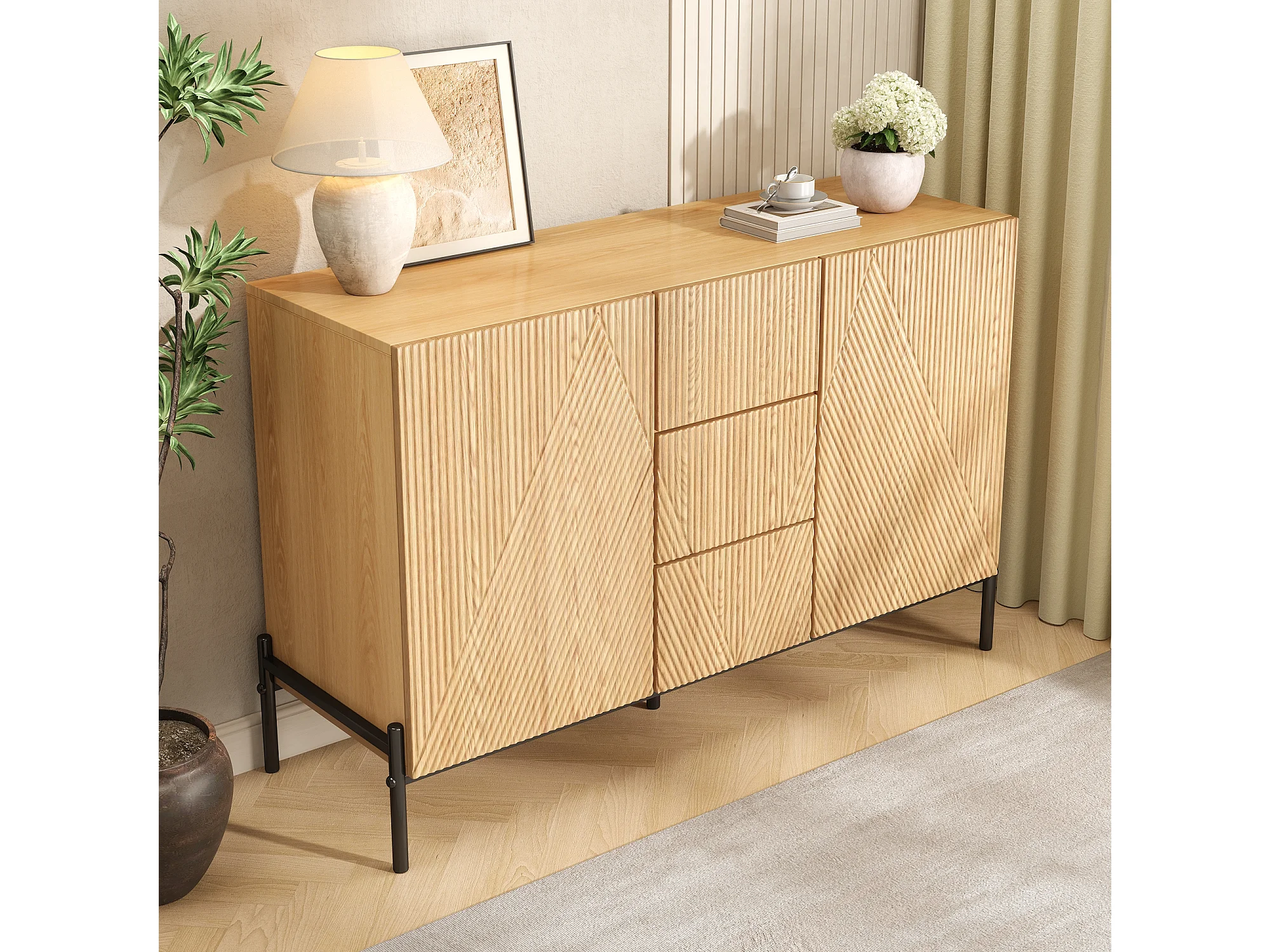 Buffet moderne à structure géométrique - 115.5 x 40 x 76 cm - avec 2 portes + 3 tiroirs - pour salon/salle à manger - MDF - naturel