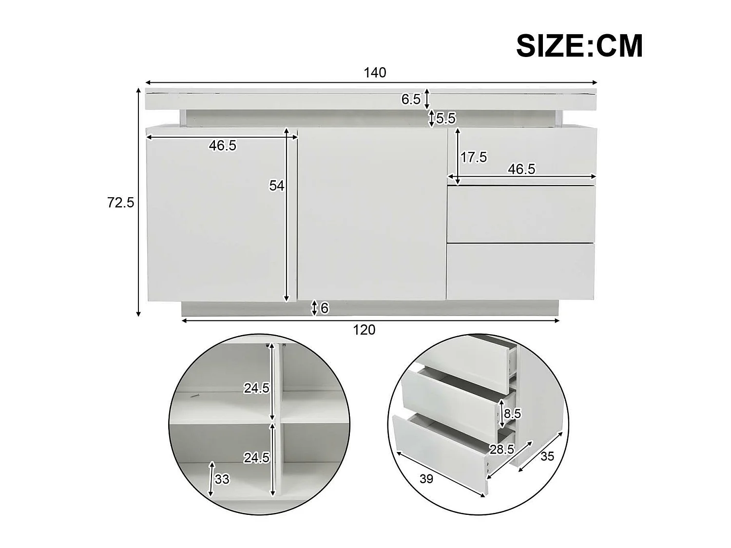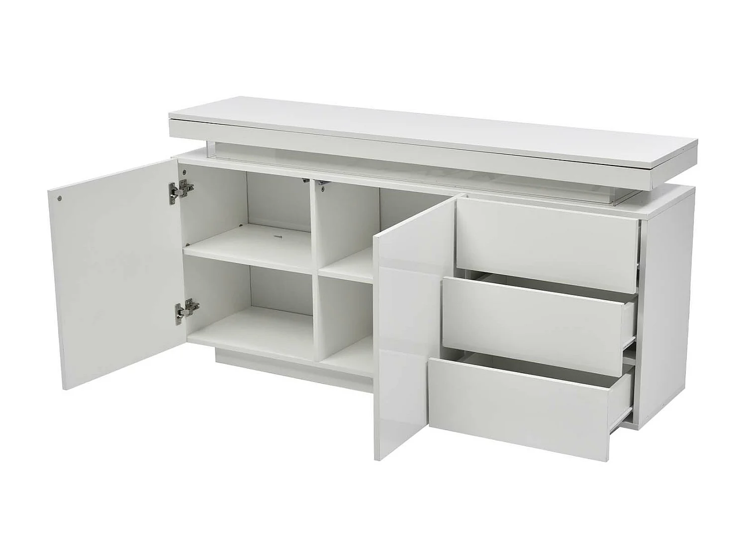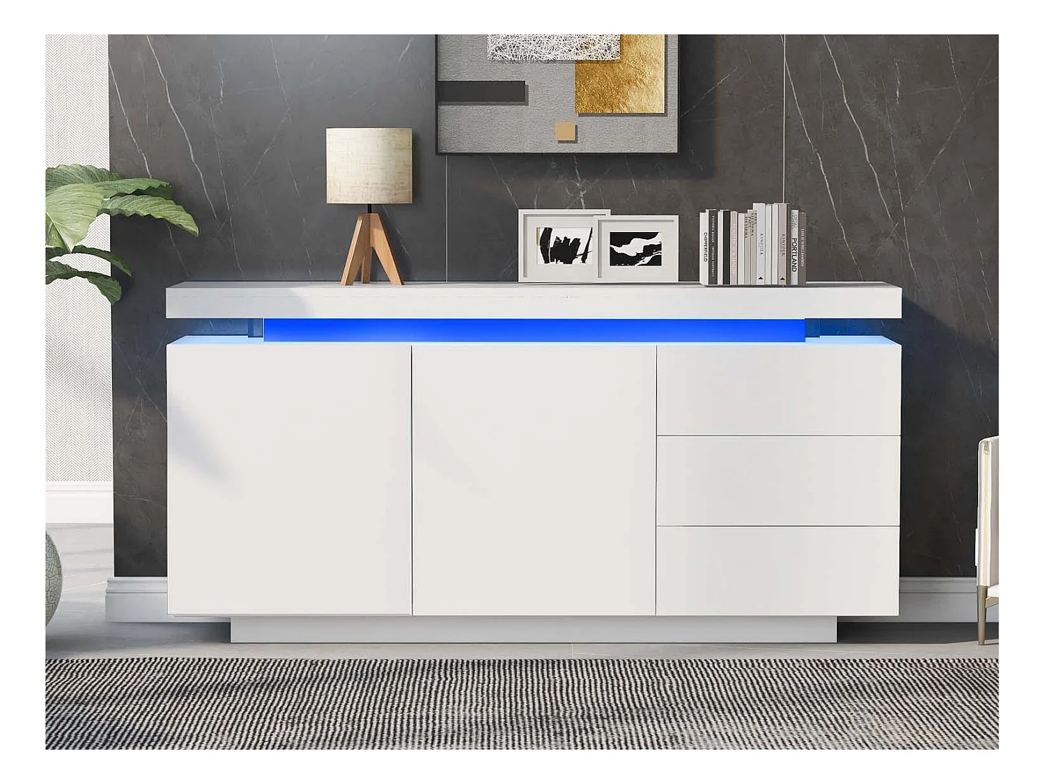 Buffet blanc brillant à 3 tiroirs - Buffet à 2 portes avec éclairage LED - etagères réglables