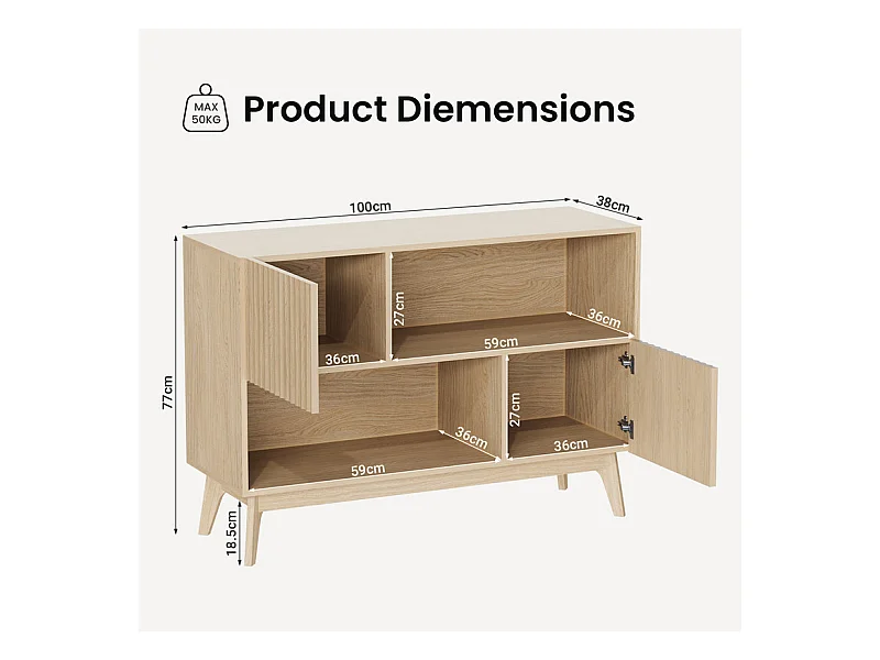 Buffet Moderne avec 2 portes et 2 niches, en Bois, charge max 50kg, Naturel clair, 100x38x77cm