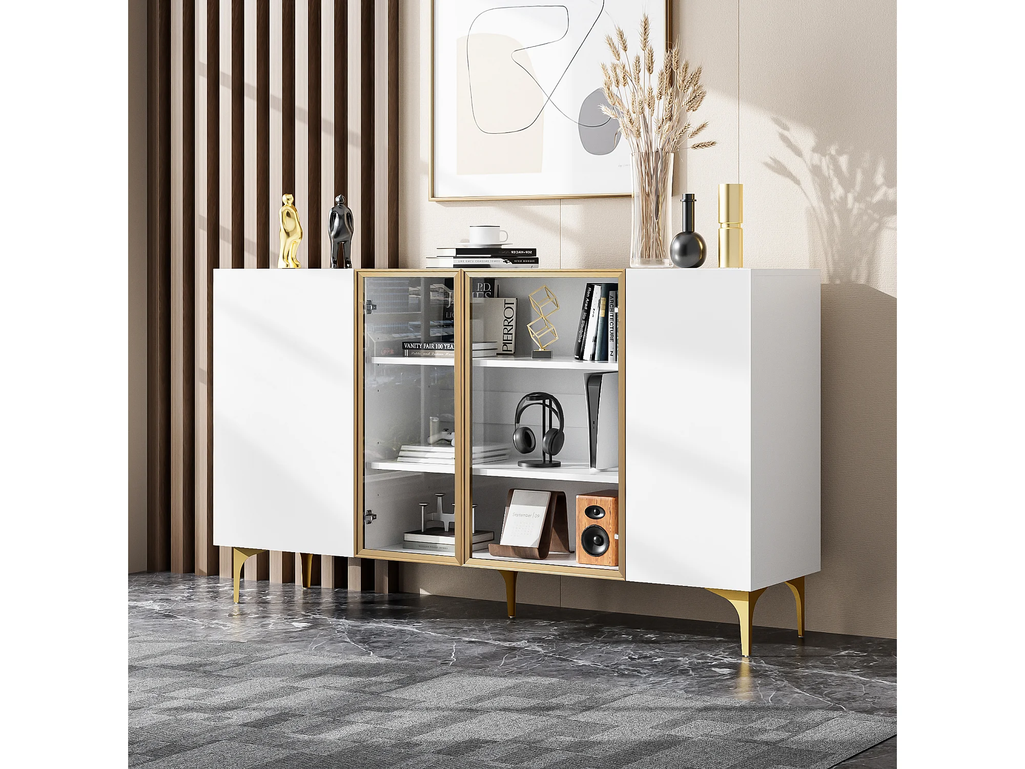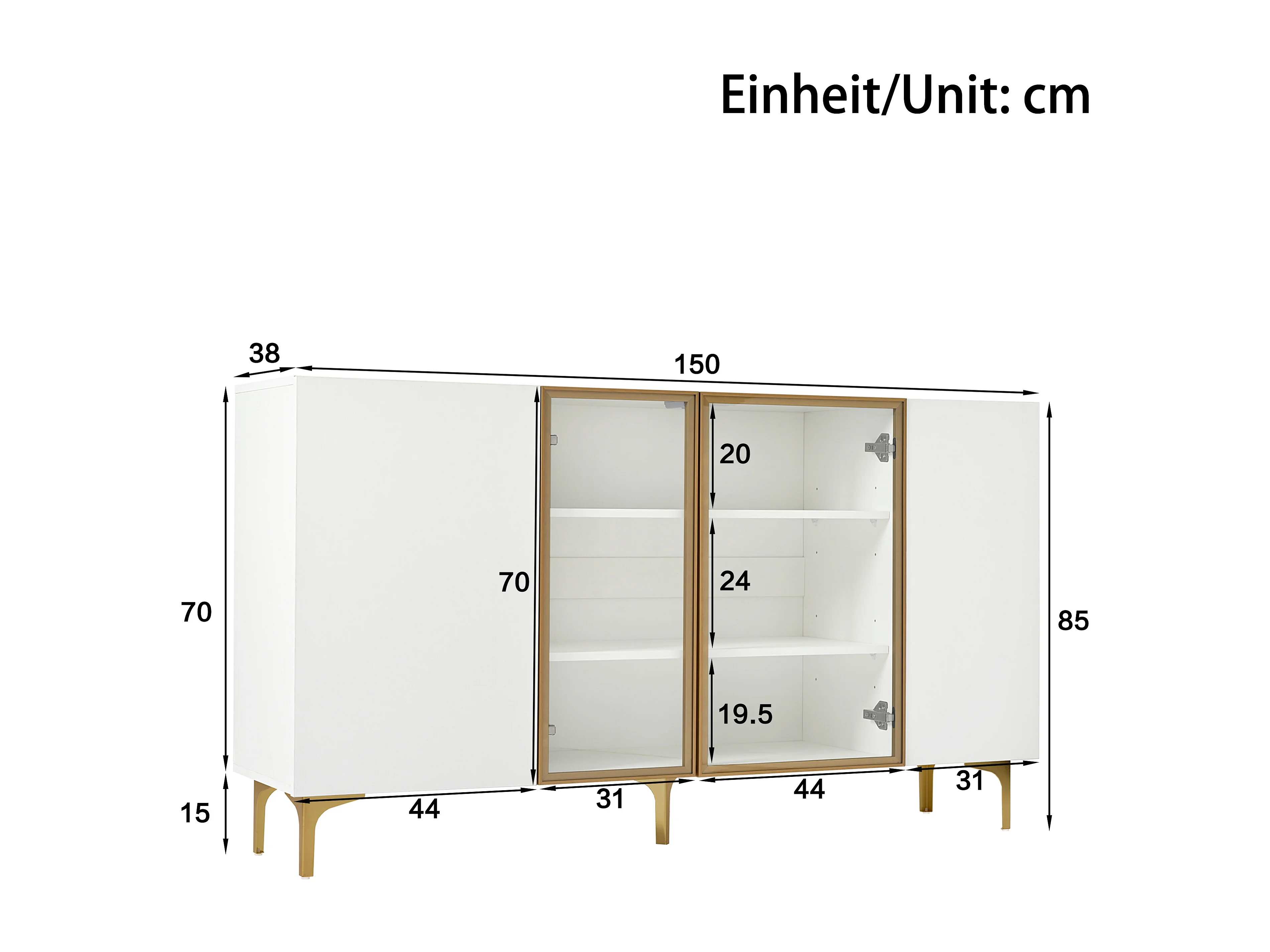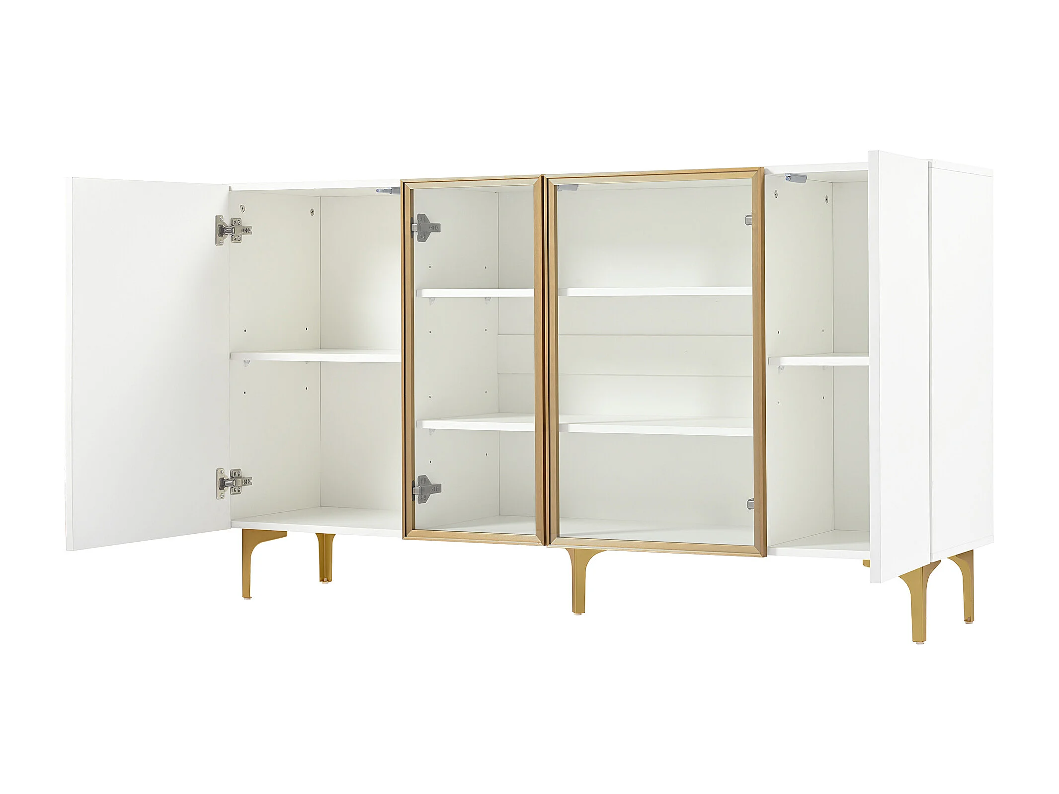 Buffet moderne avec 4 portes, MDF, blanc et verre, avec pieds métalliques, (150x38x85 cm)