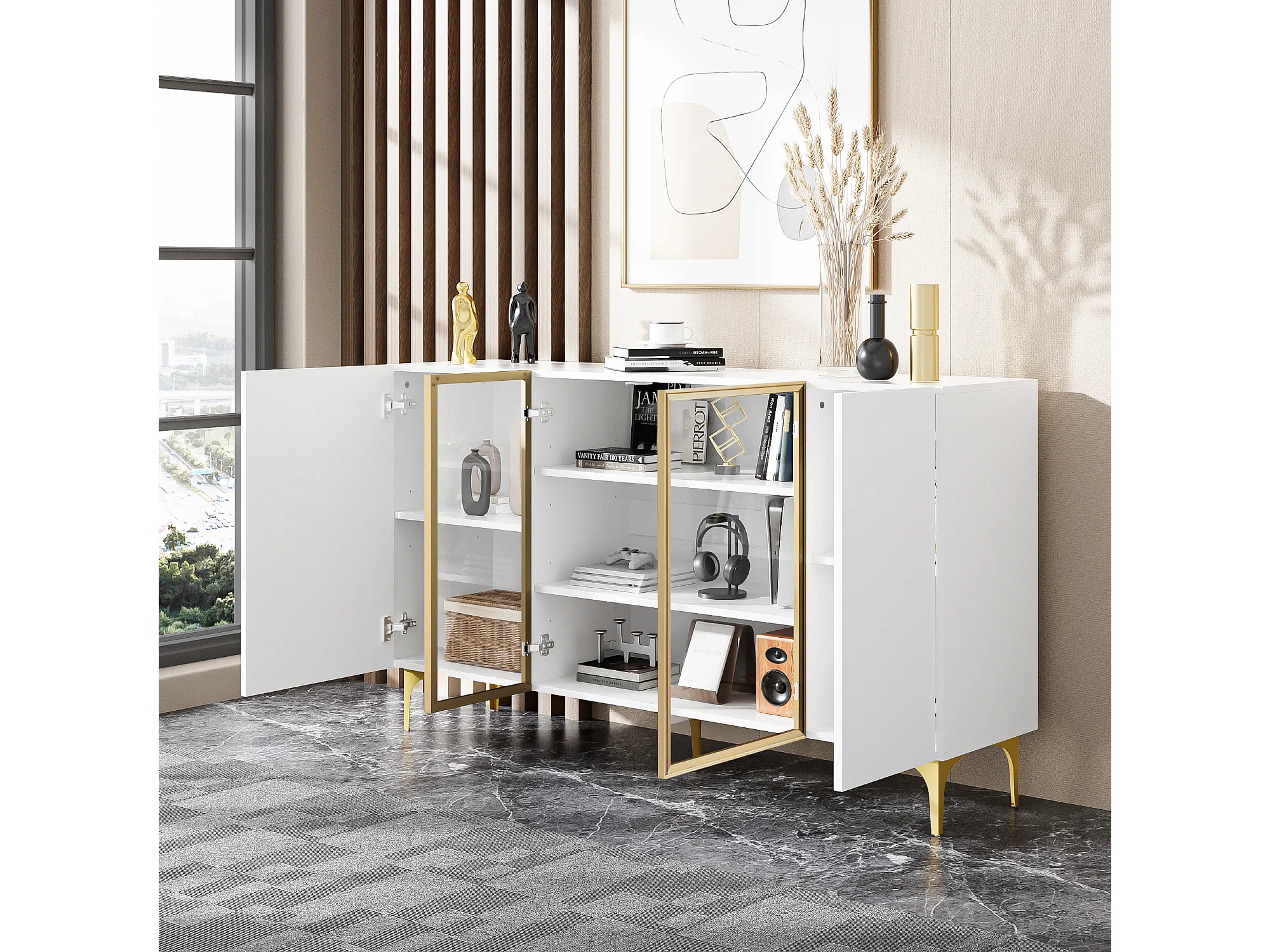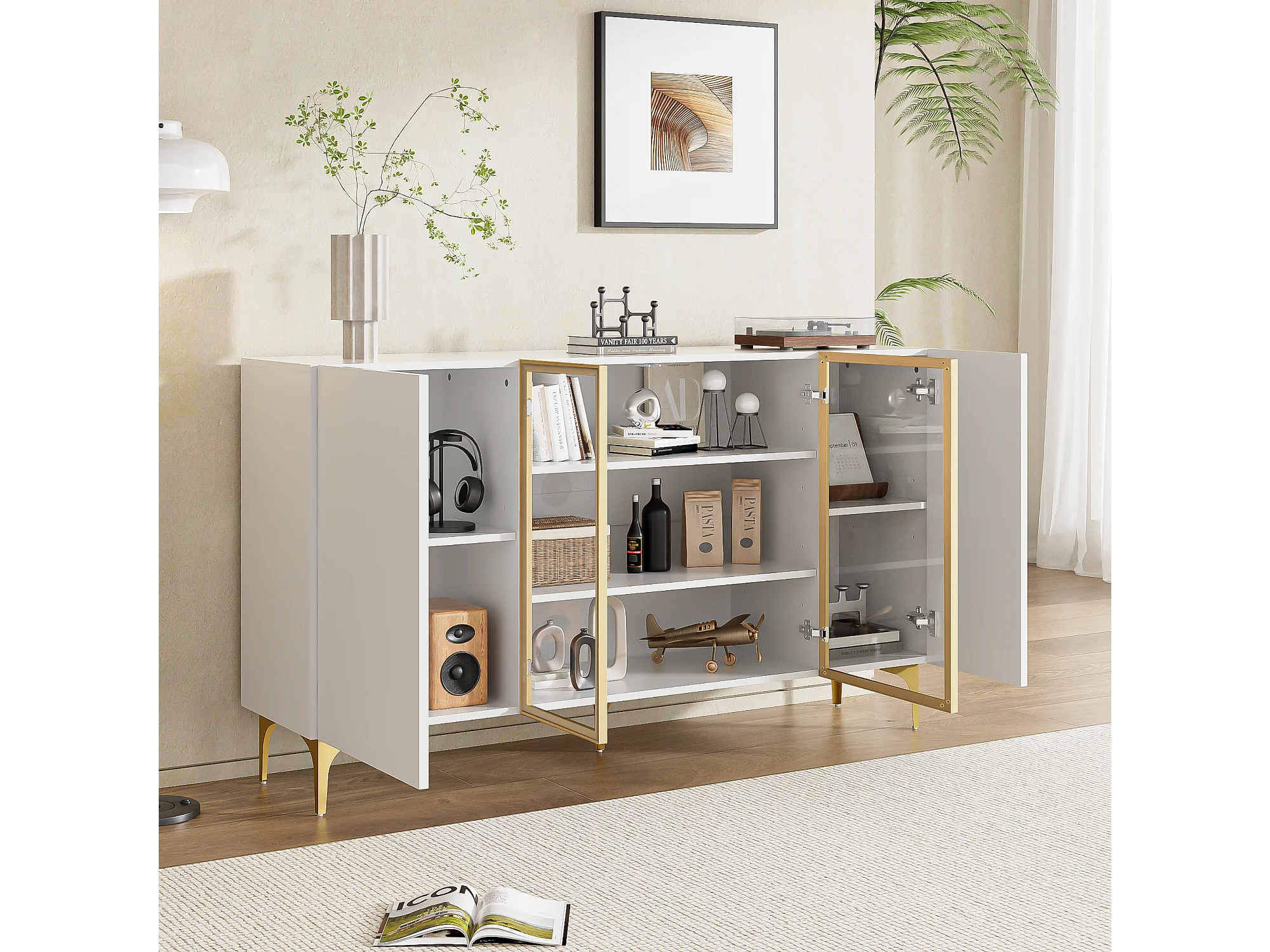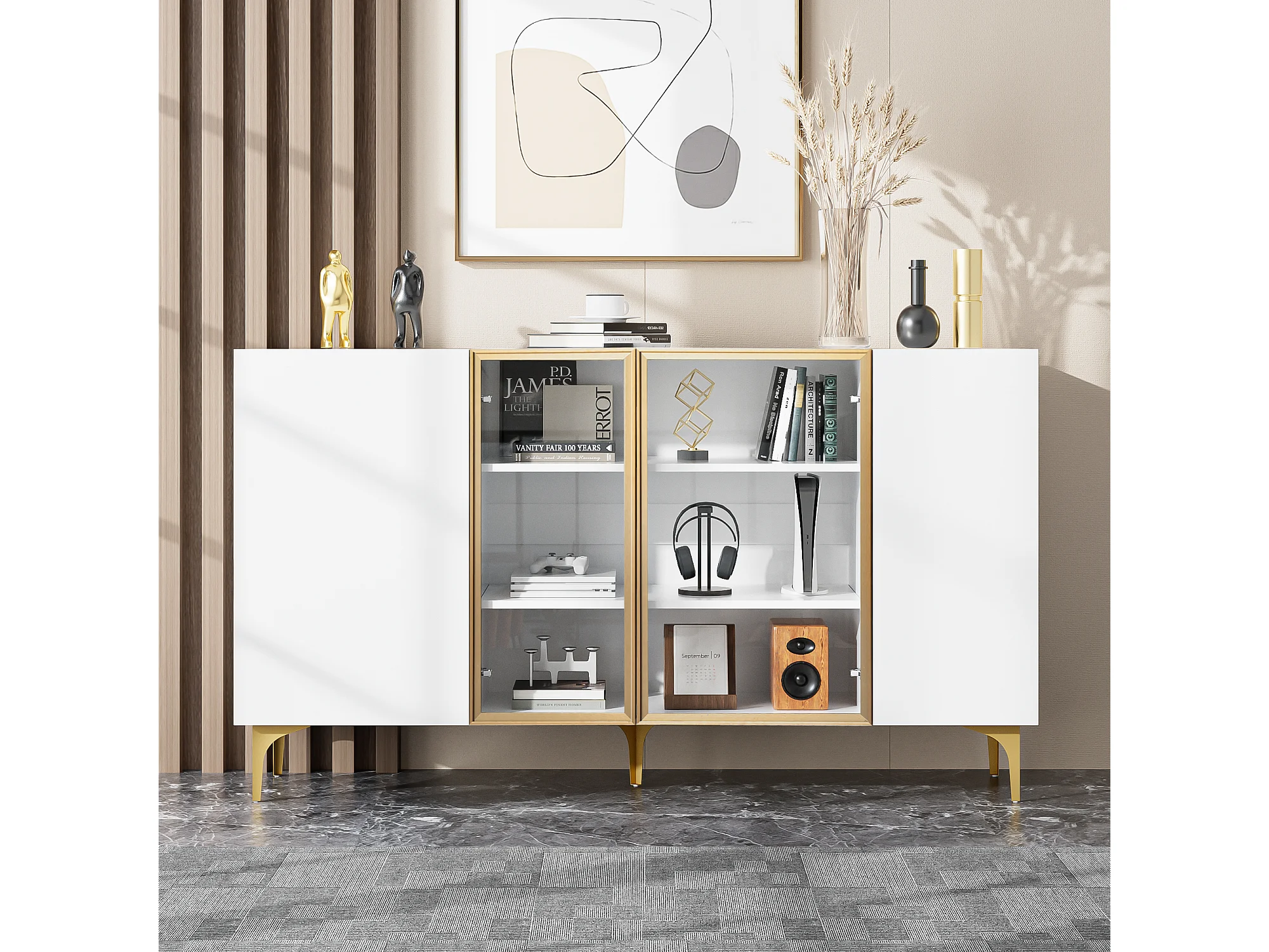 Buffet moderne avec 4 portes, MDF, blanc et verre, avec pieds métalliques, (150x38x85 cm)