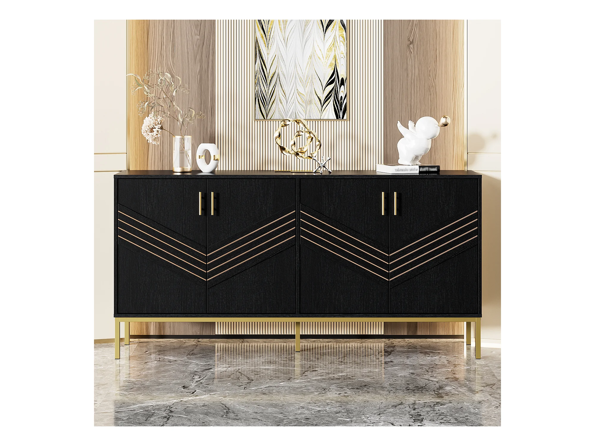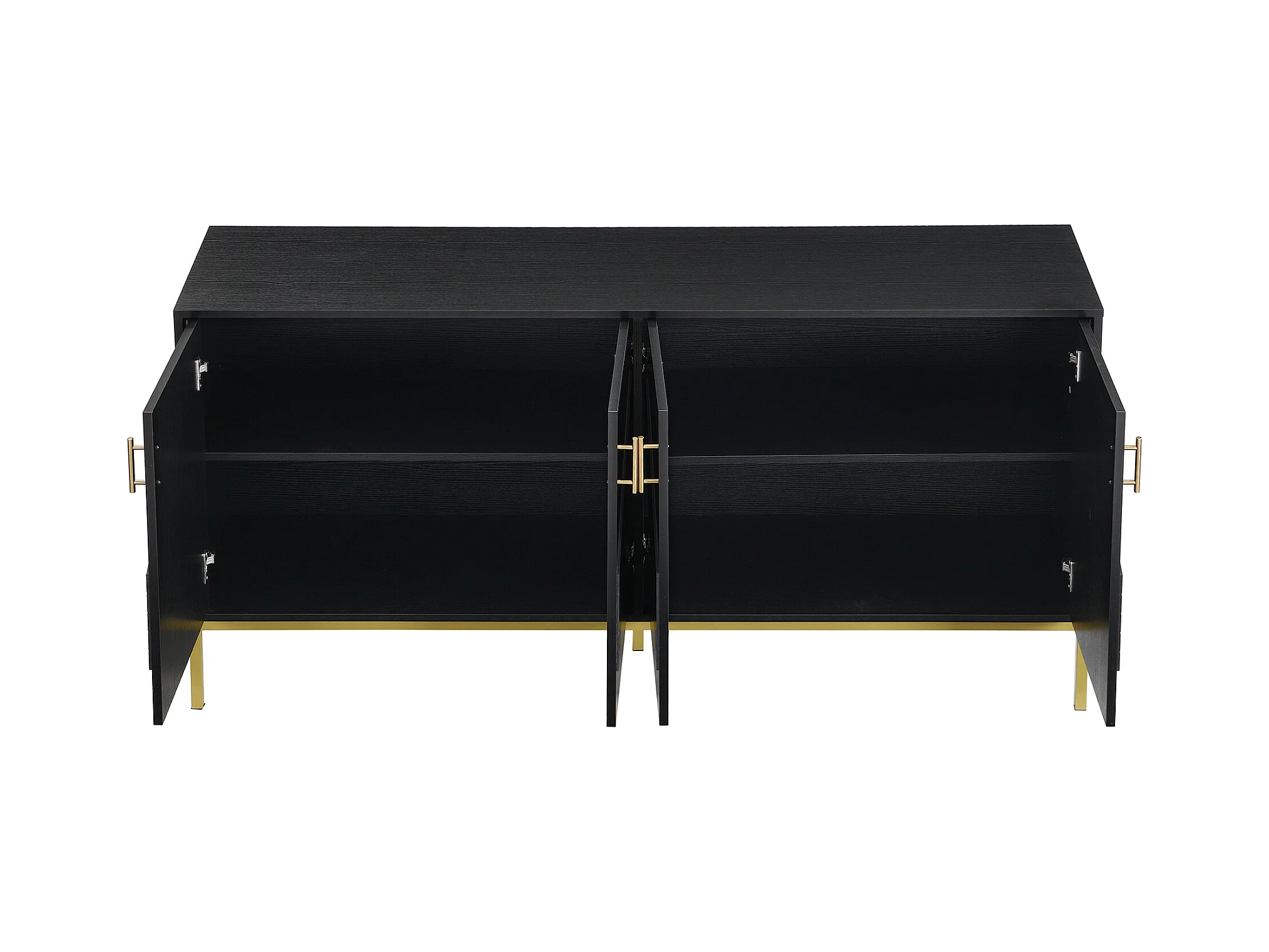 Buffet 4 portes, pieds en métal, MDF, noir+or (150x40x80 cm)