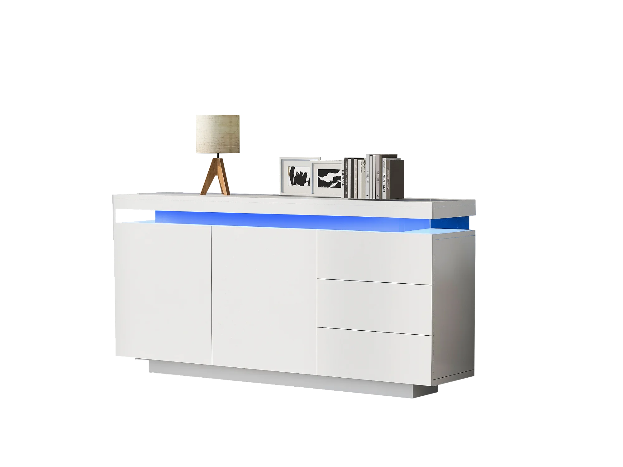 Buffet moderne avec LED, portes sans poignées, 2 portes, 3 tiroirs, panneau de particules, blanc, 140x35x72.5 cm