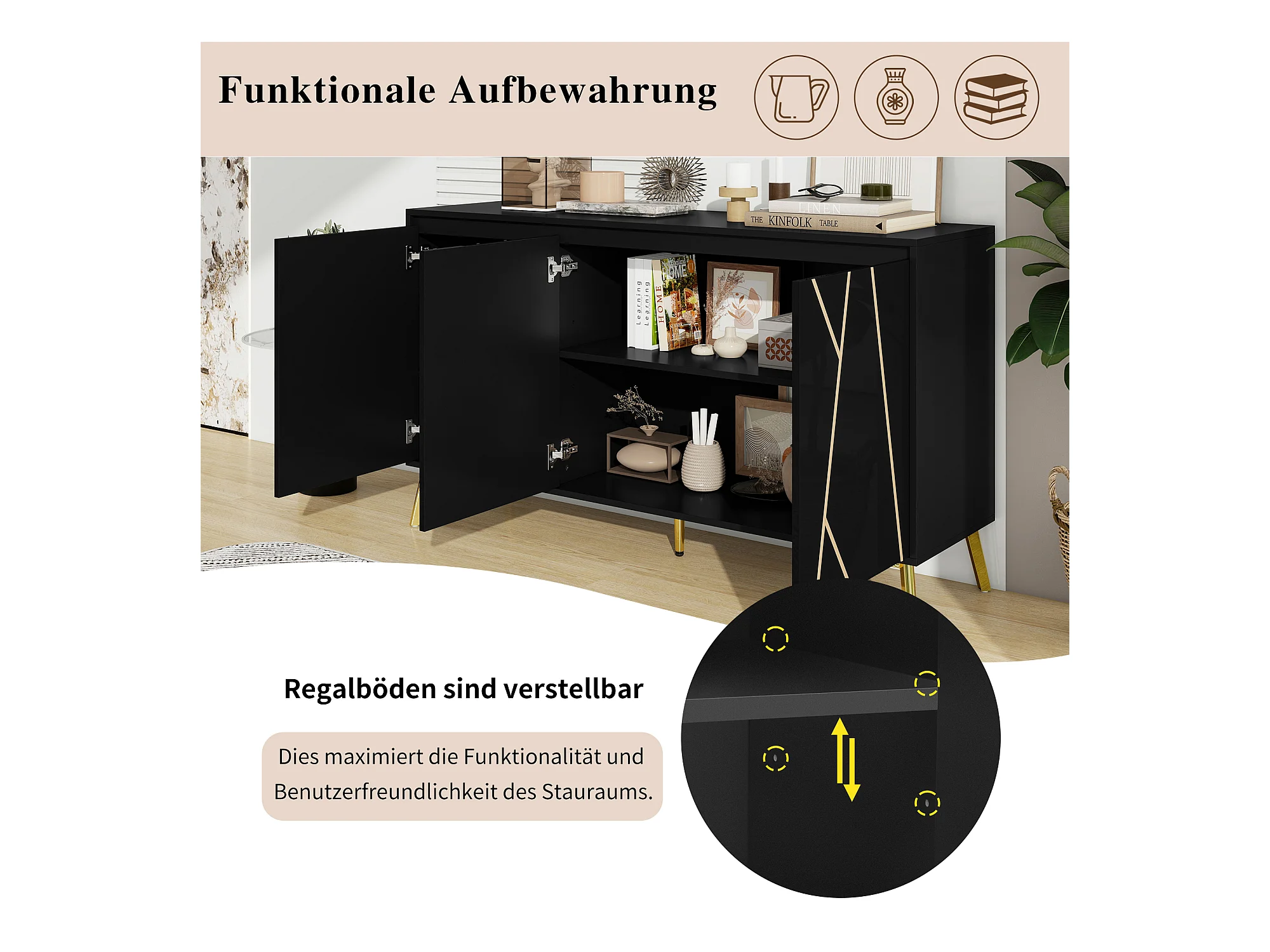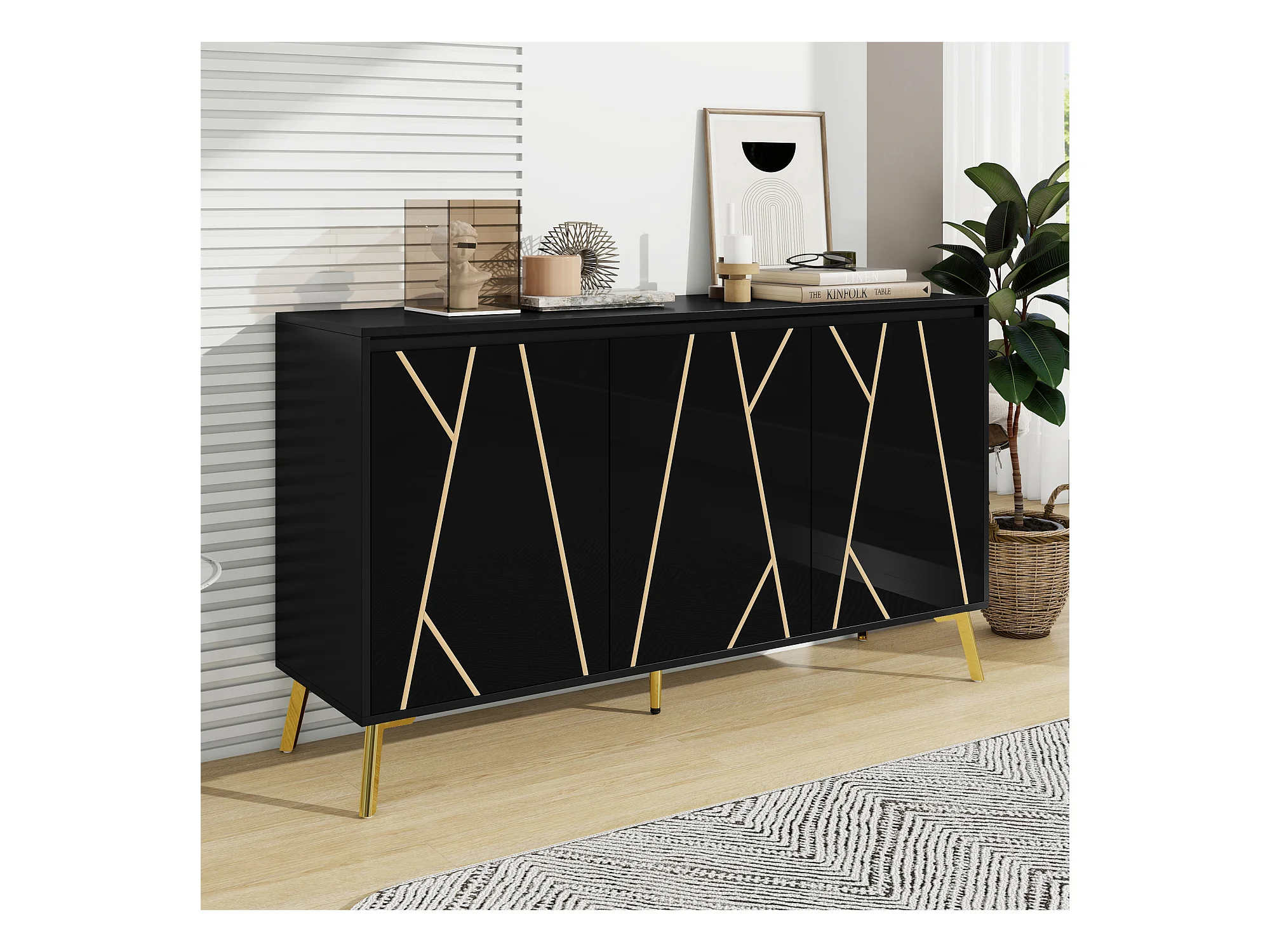 Buffet 4 portes, pieds en métal, MDF, noir+or (150x40x80 cm)
