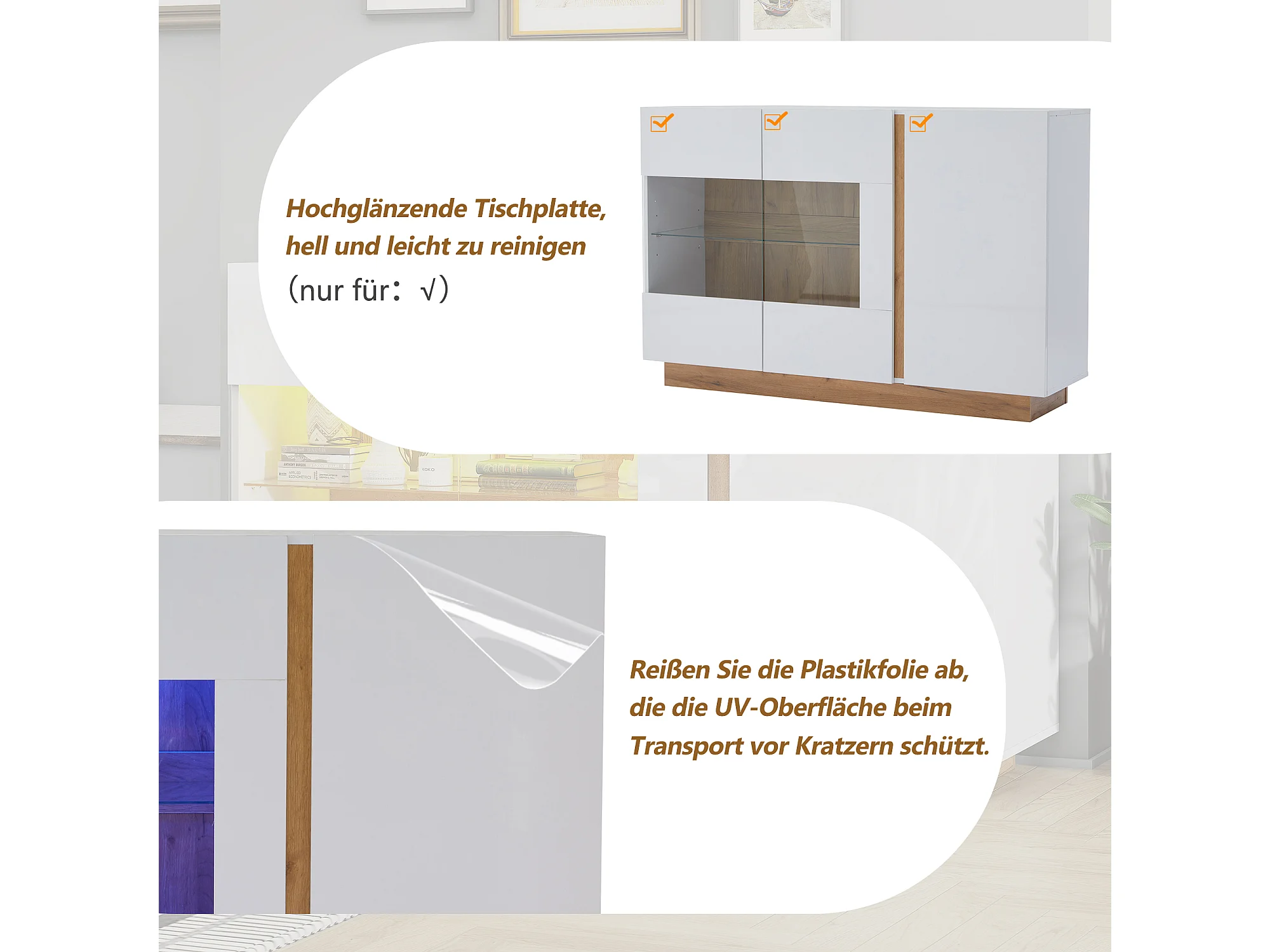 Buffet moderne, blanc laqué, avec verre trempé, bois, 3 portes et LED RGB (138x38x90.5 cm)