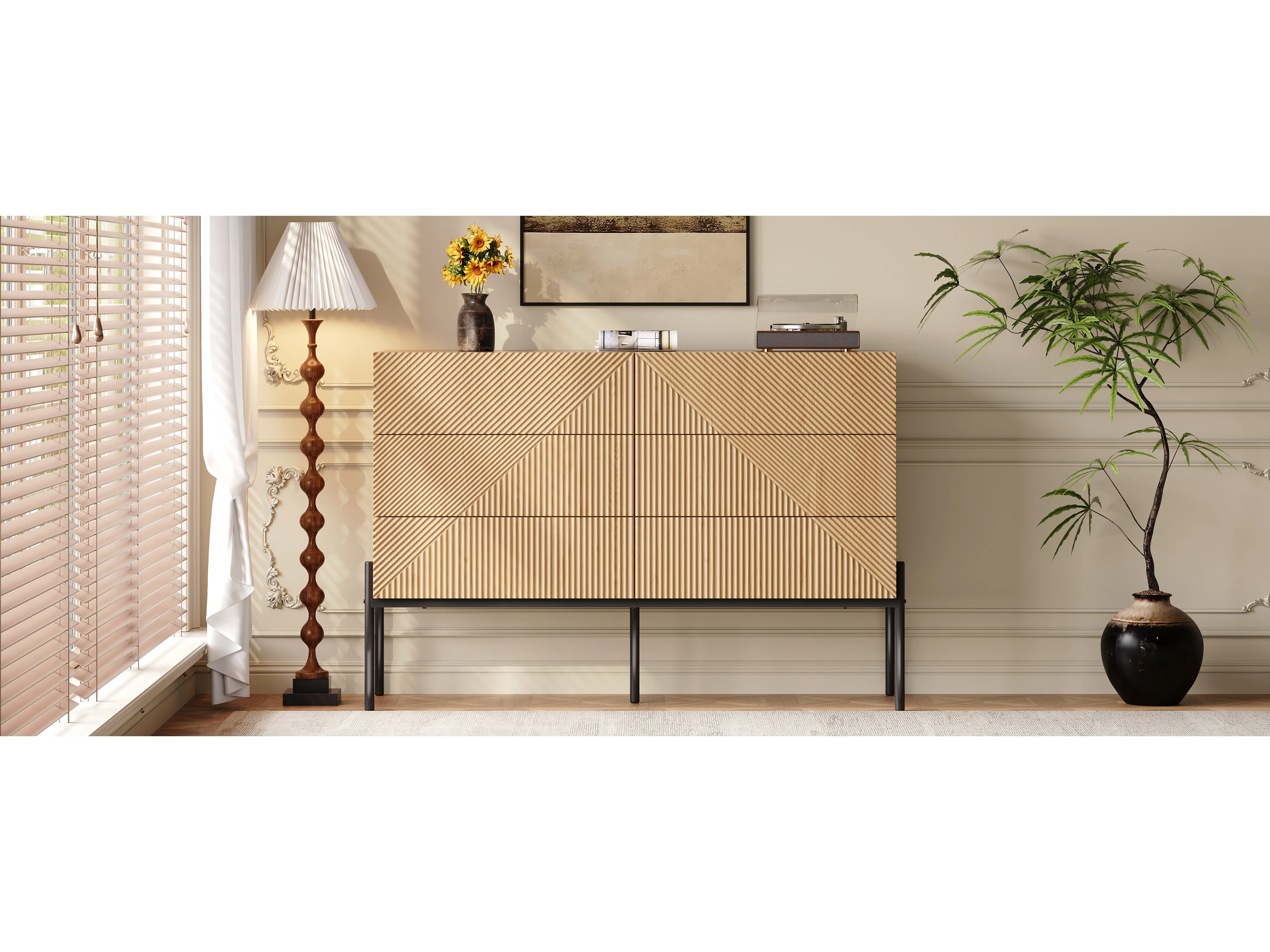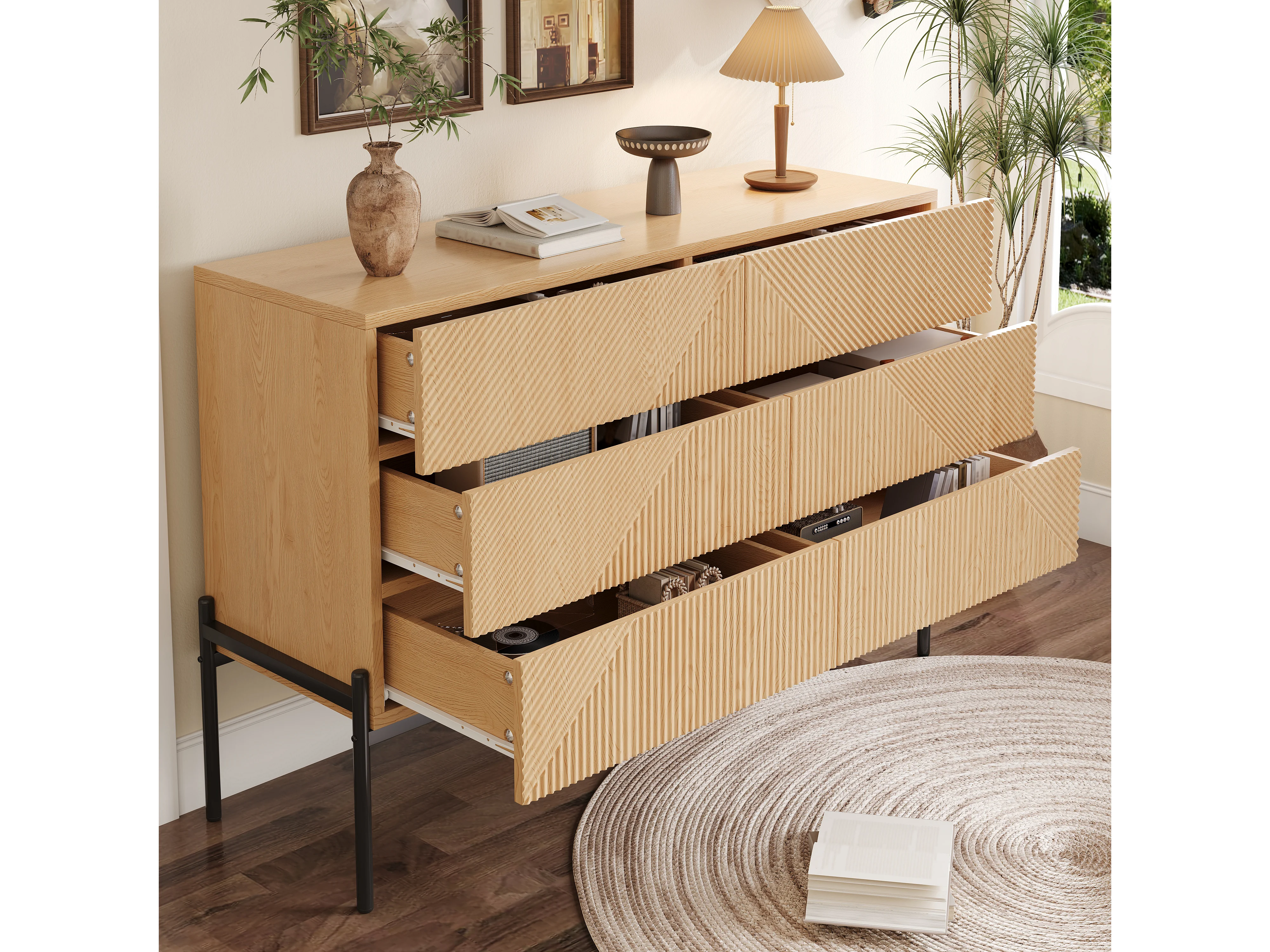 Buffet moderne de texture 3D - 115.5 x 38 x 75 cm - avec six tiroirs - pour salons et salles à manger - MDF - naturel clair