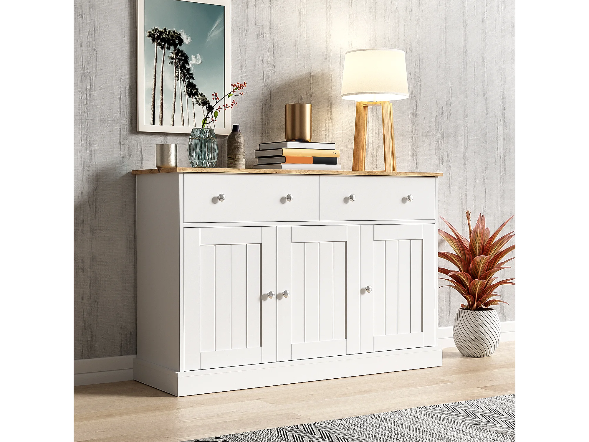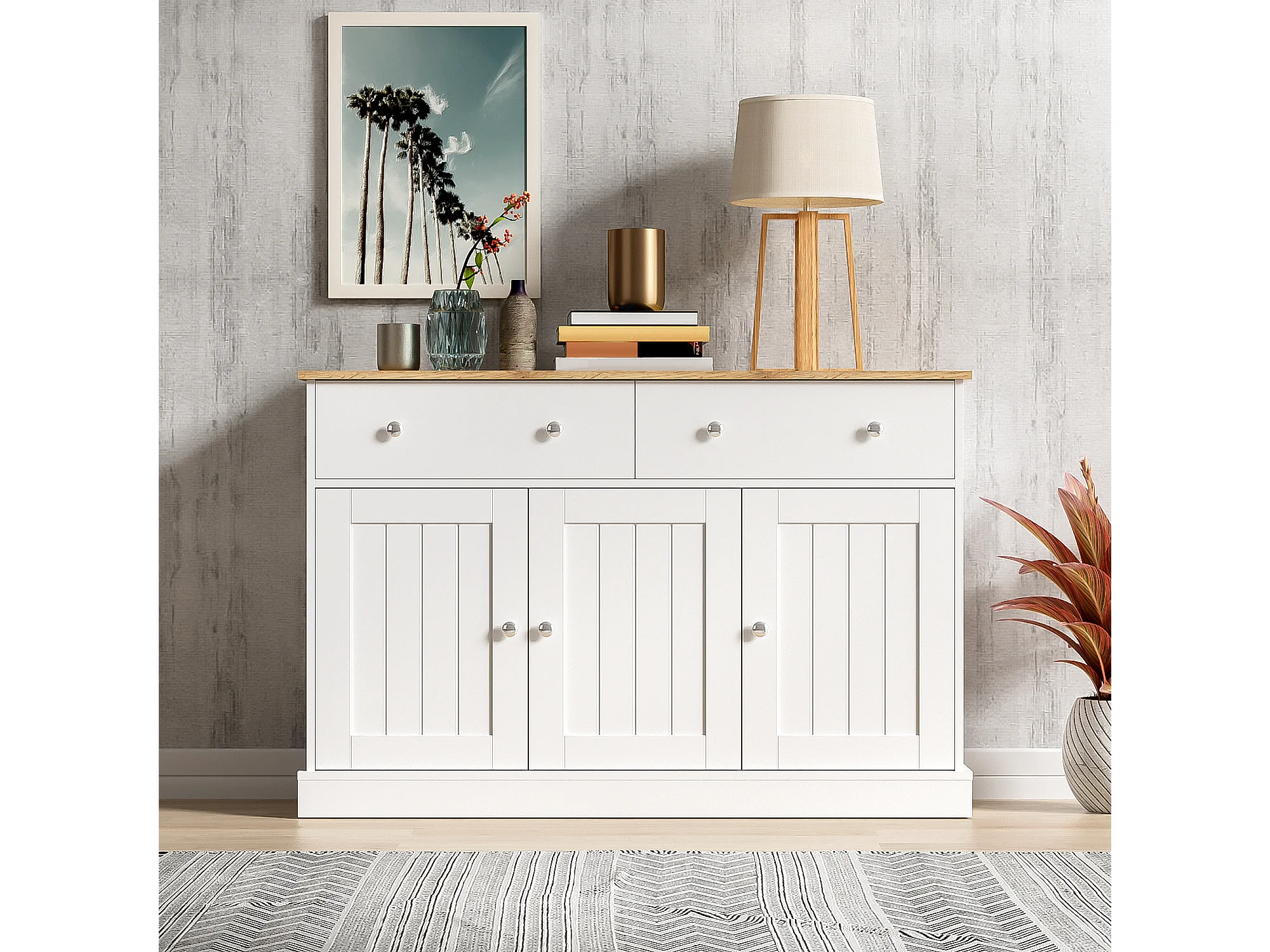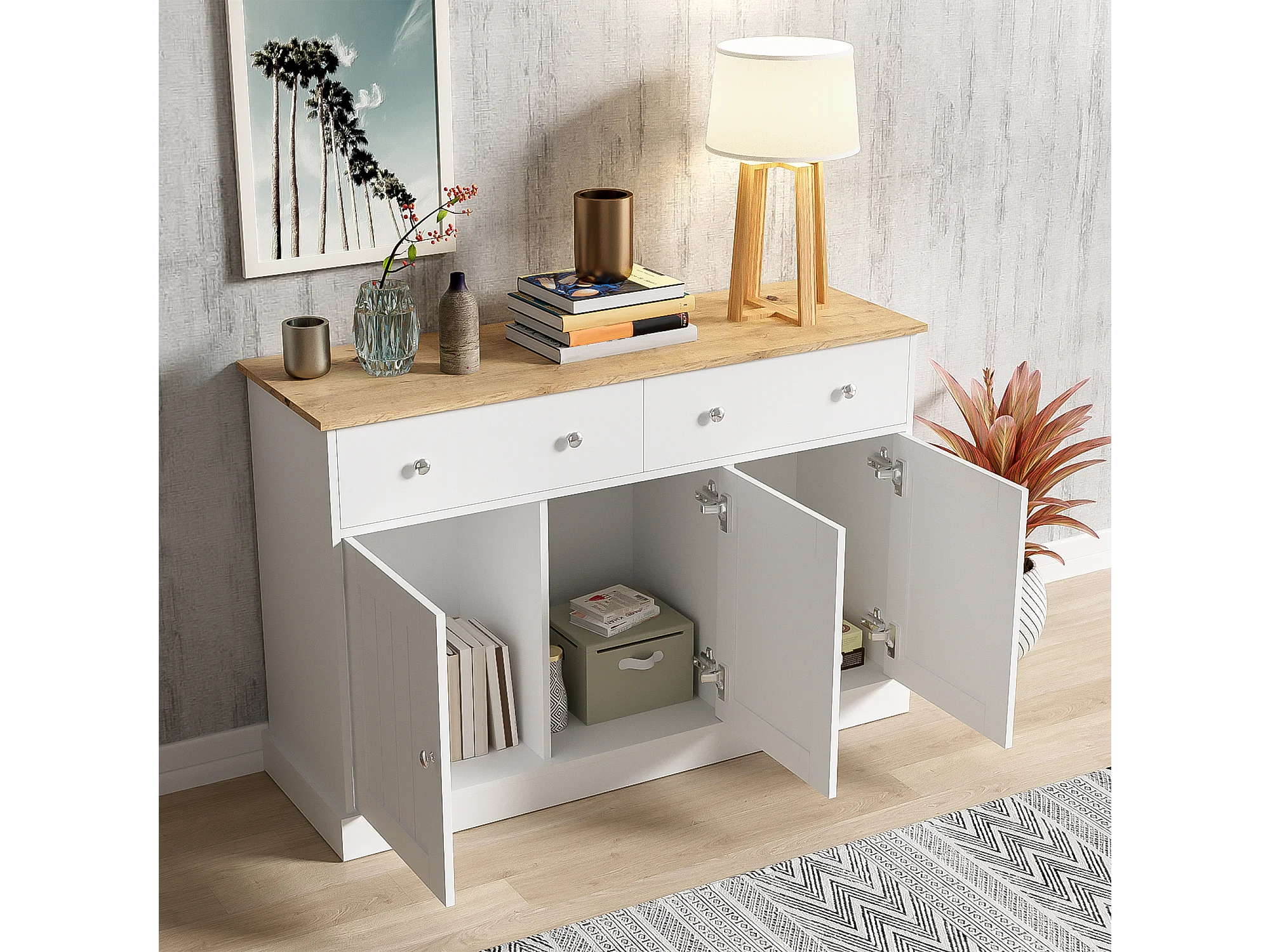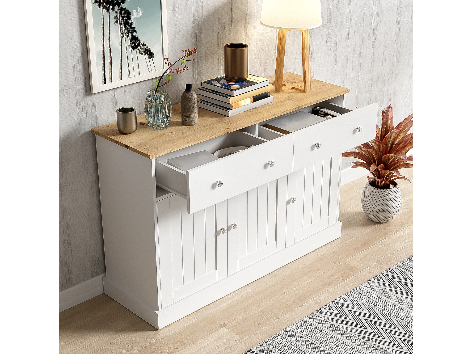 Buffet moderne, design épuré, MDF, blanc et bois, 4 portes et 2 tiroirs (120x36x80.5 cm)