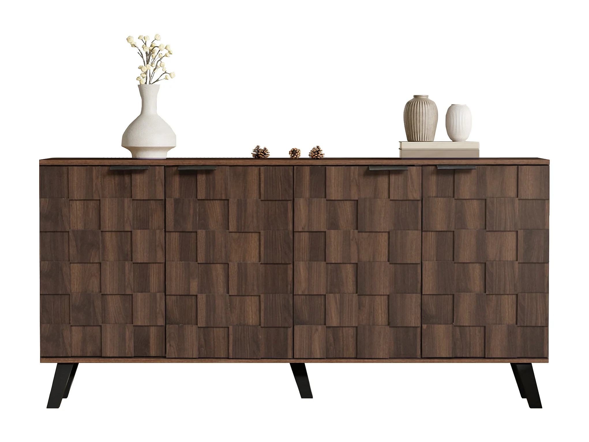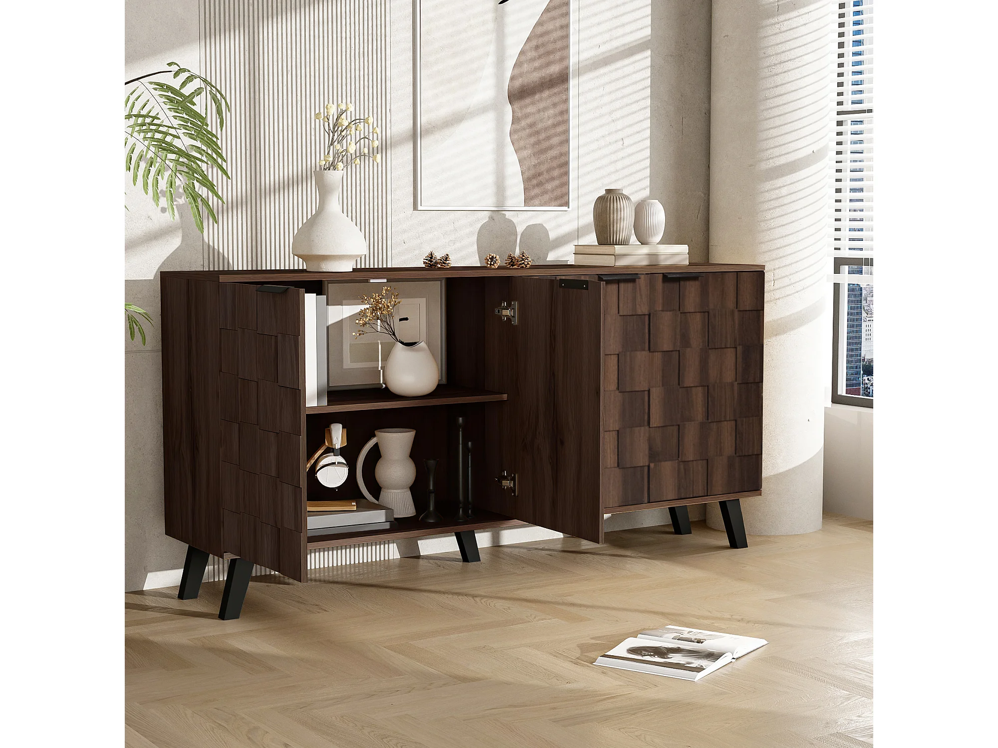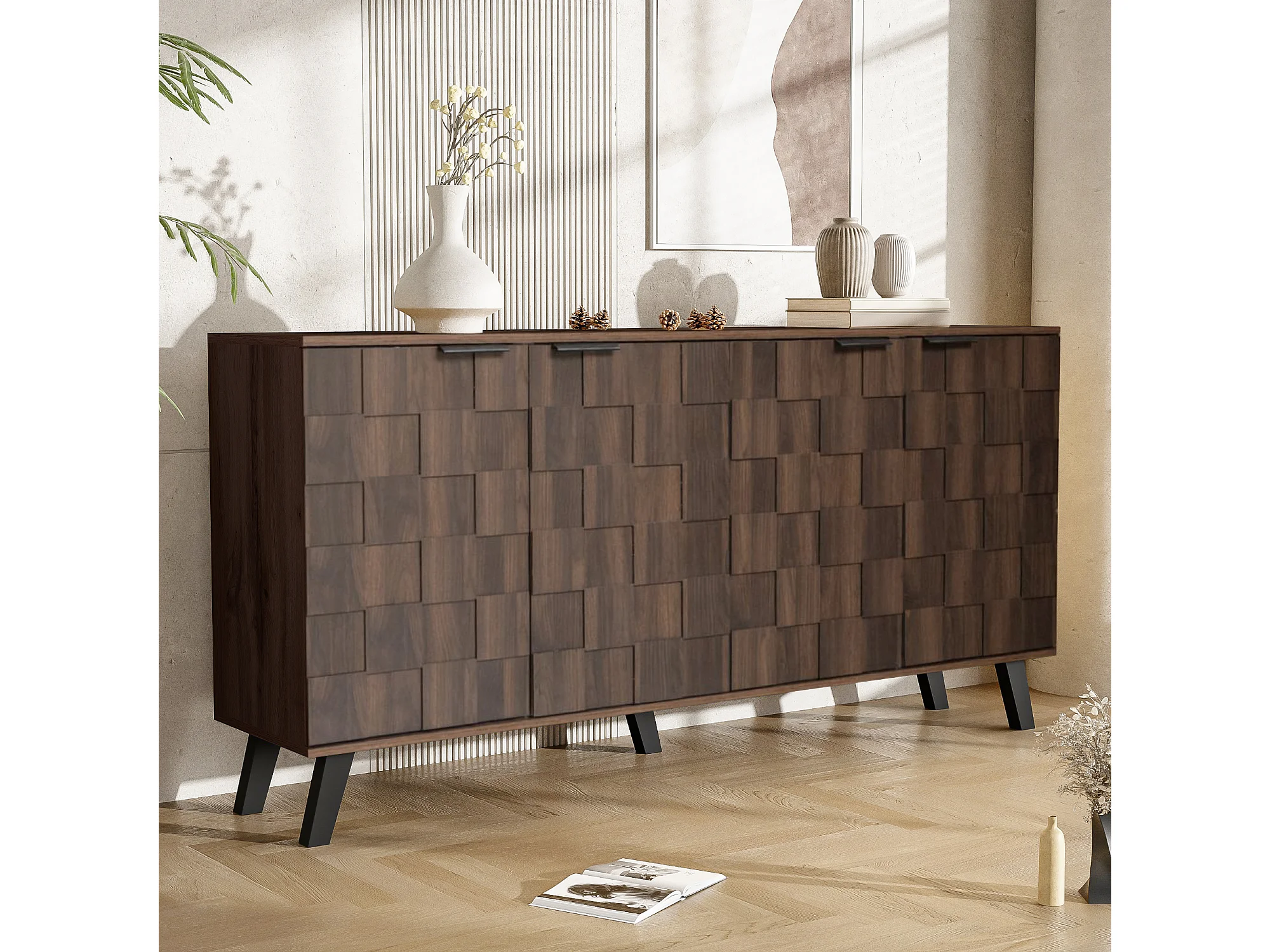 Buffet moderne en bois foncé - 160.5 x 35.5 x 78 cm - avec 4 portes - pour le salon + chambre - aggloméré - naturel foncé