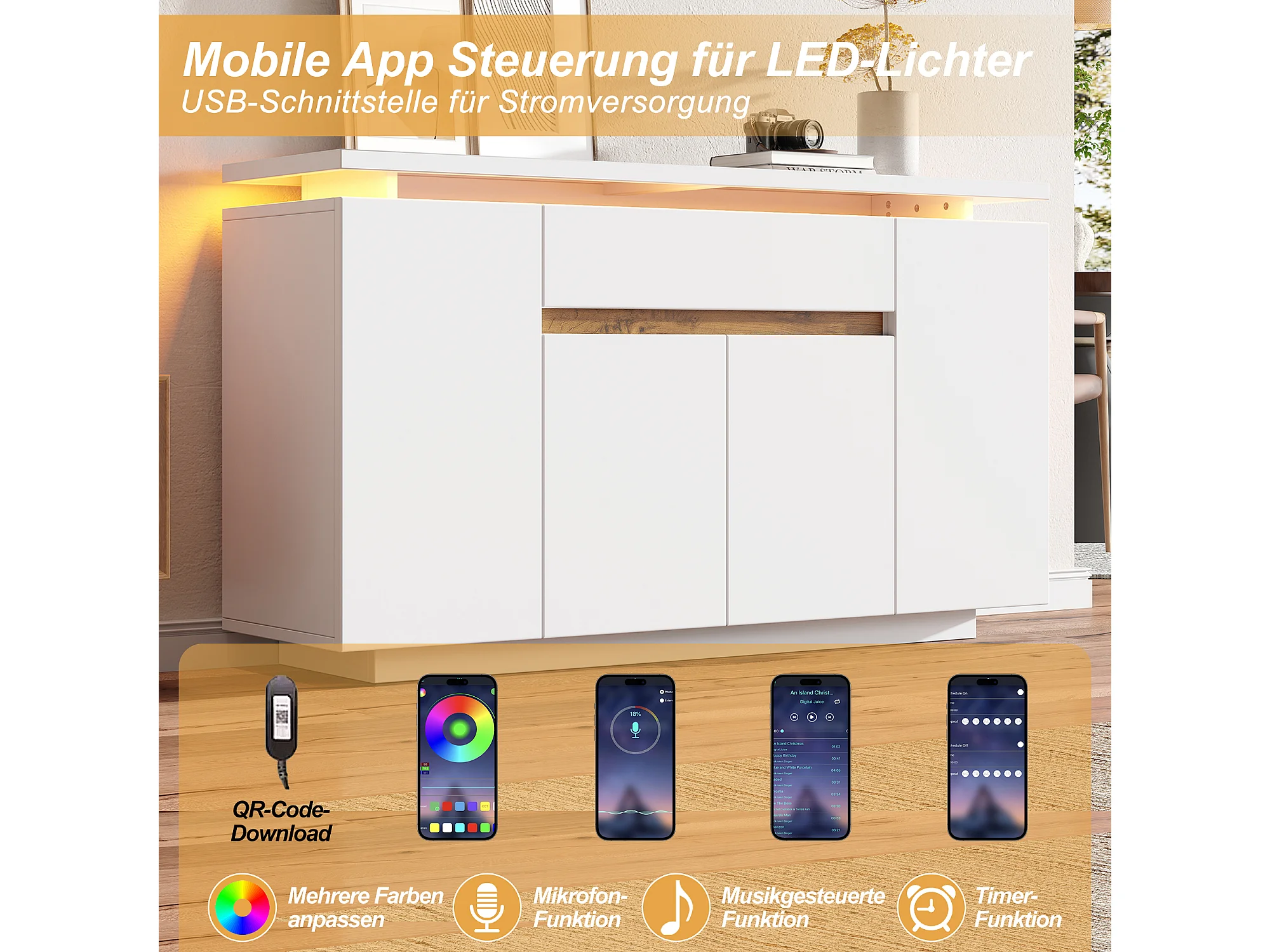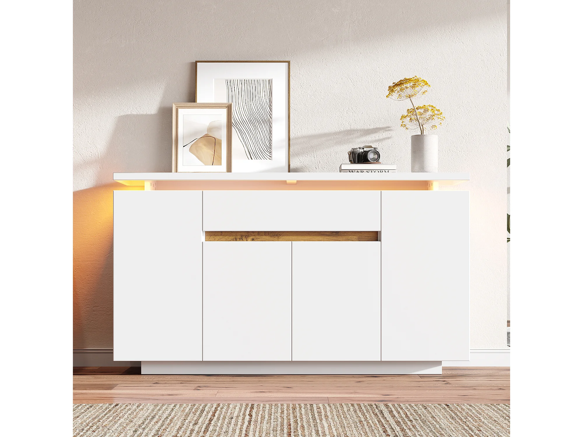Buffet moderne pour salon/entrée - 140 x 40 x 80 cm - avec Leds + tiroir + 4 portes - aggloméré - blanc