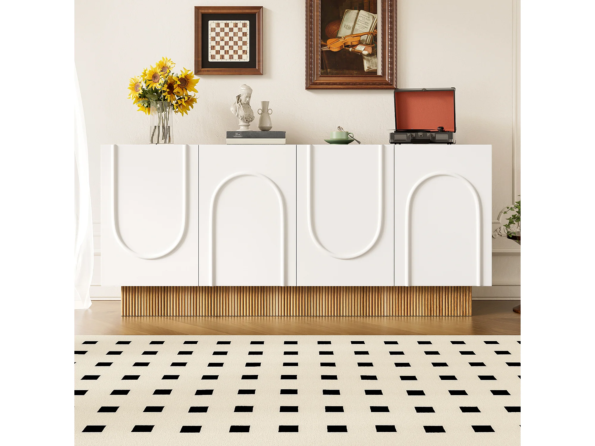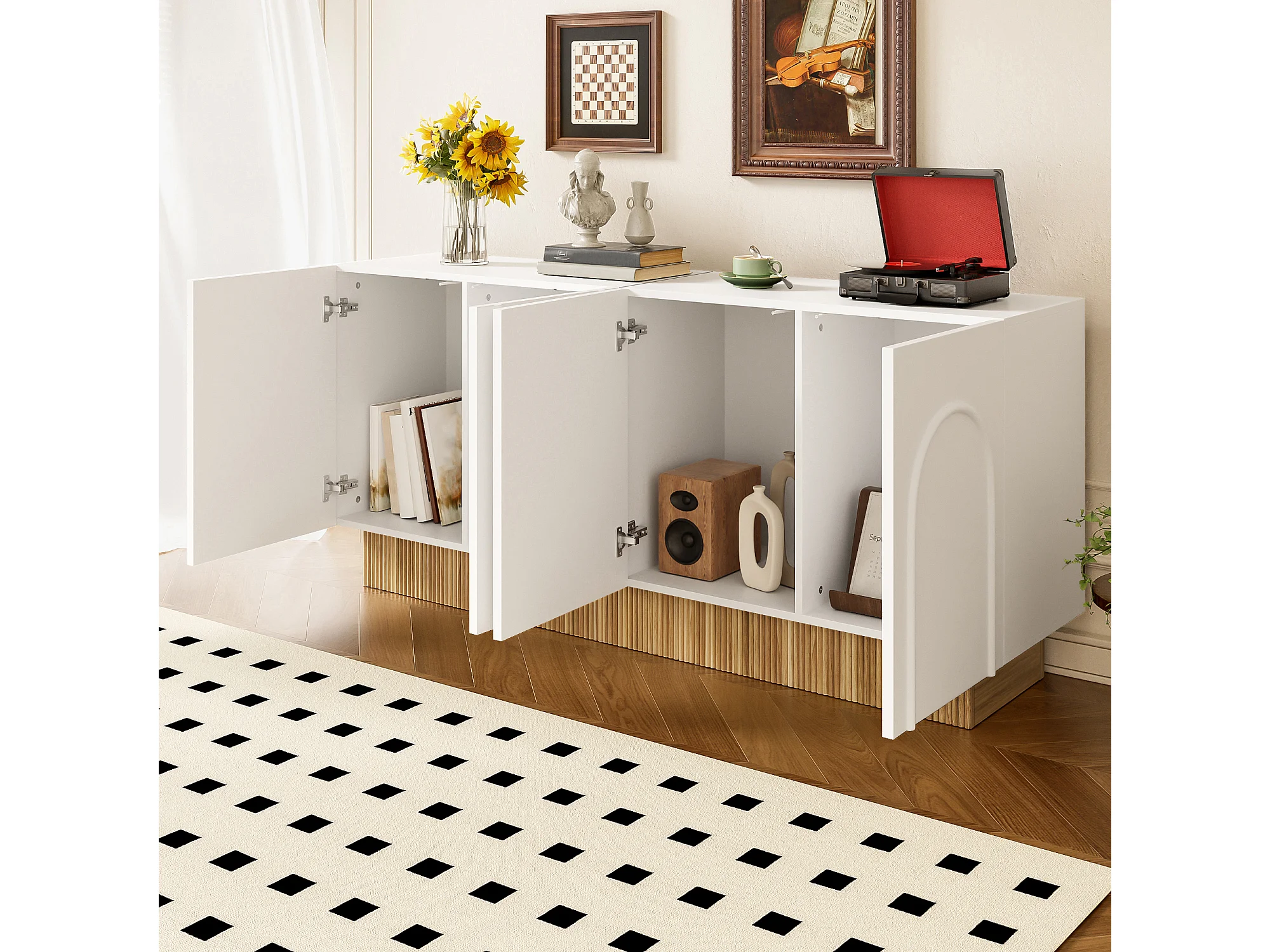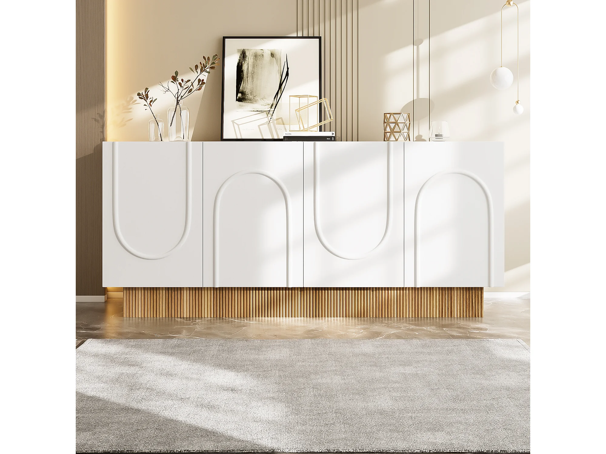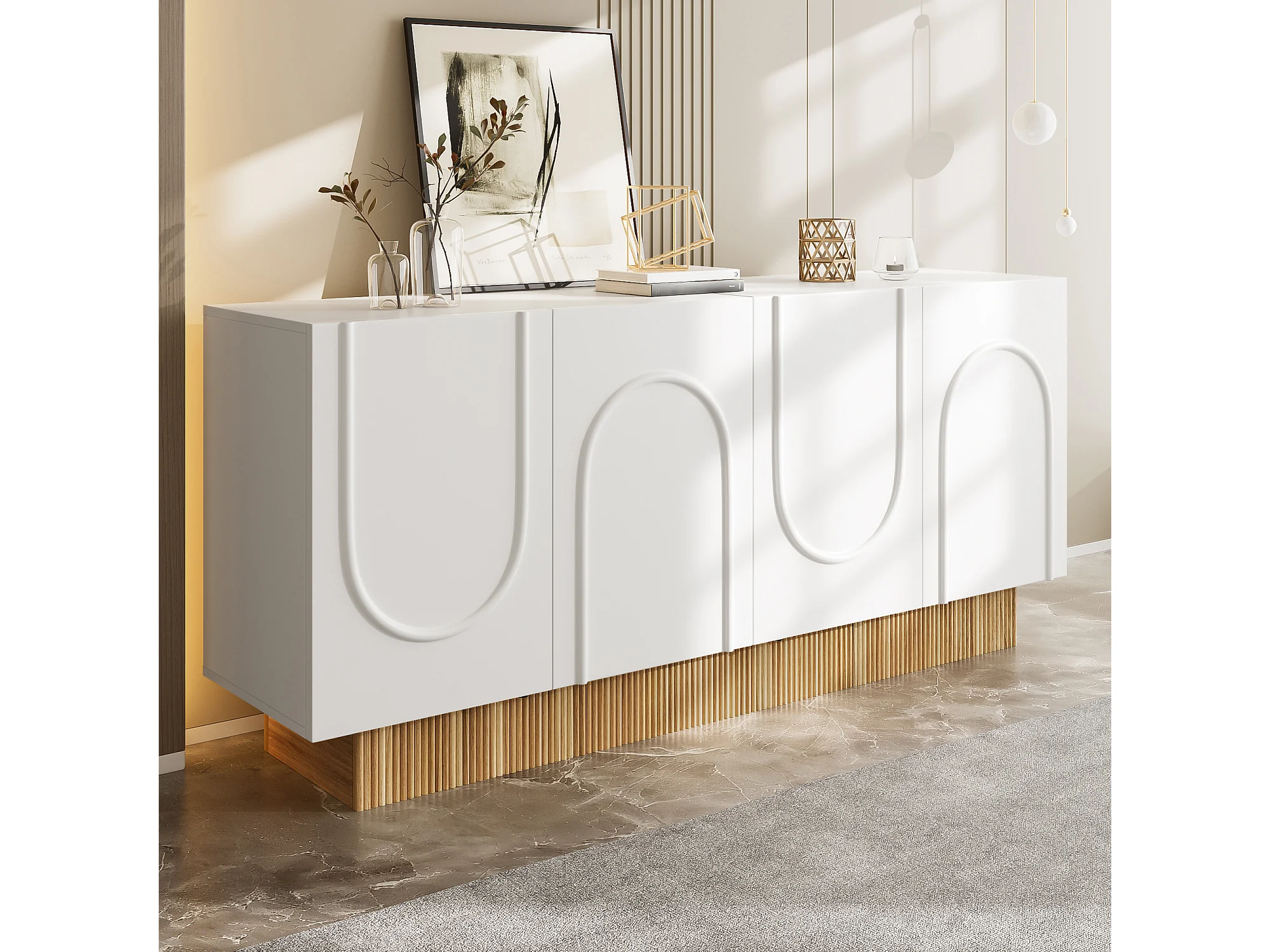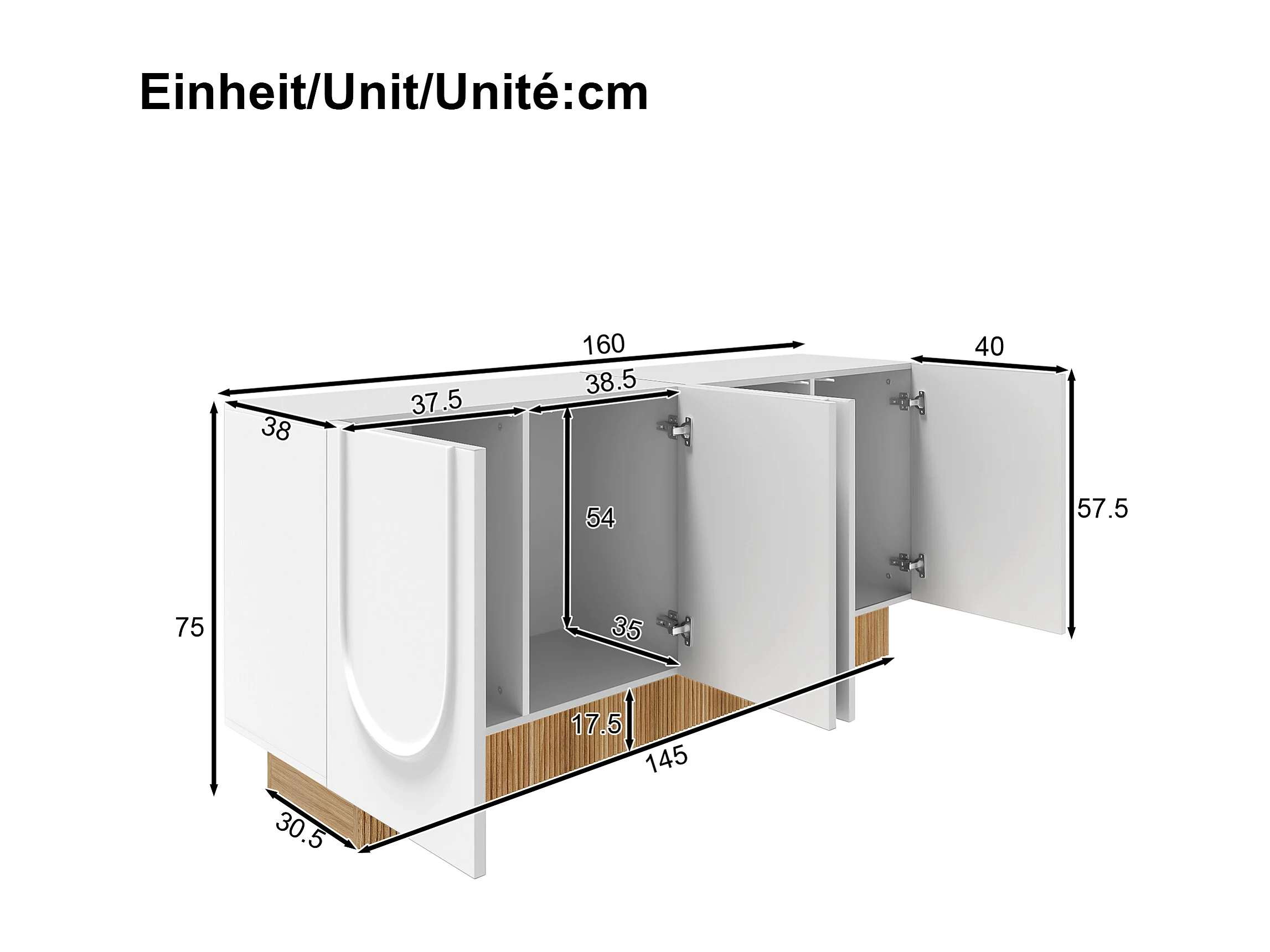 Buffet moderne pour salon et salle à manger - 160 x 75 x 38 cm - avec 4 portes - aggloméré - blanc + naturel