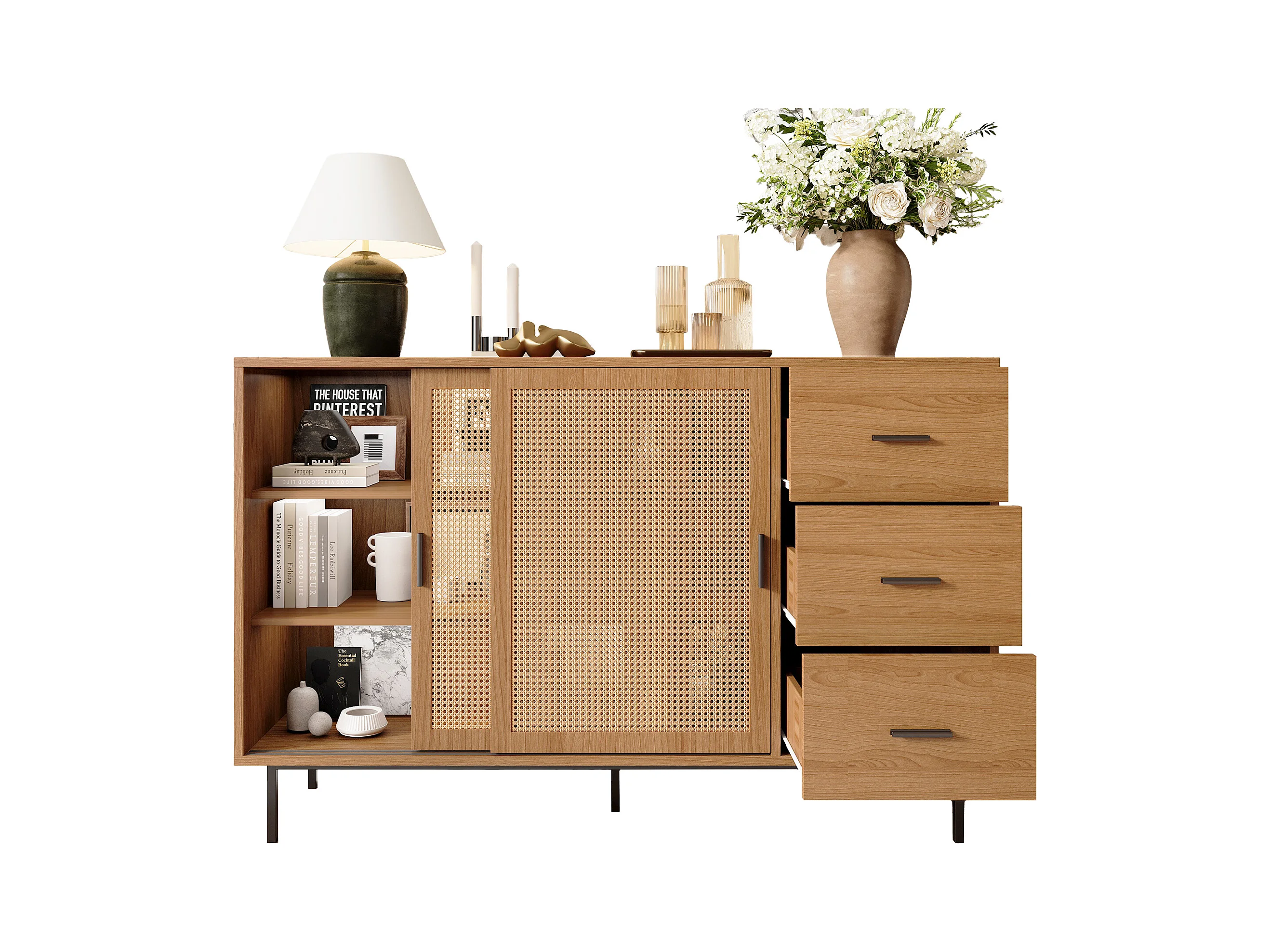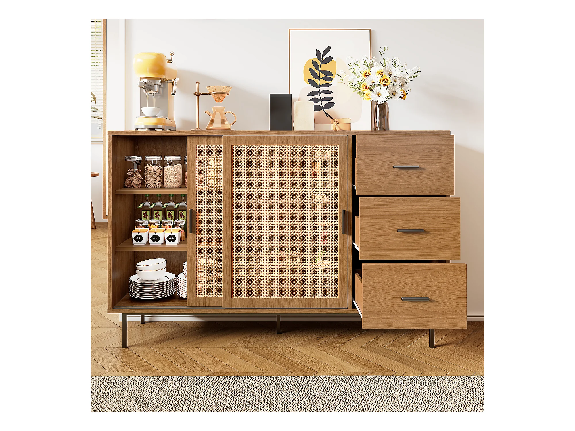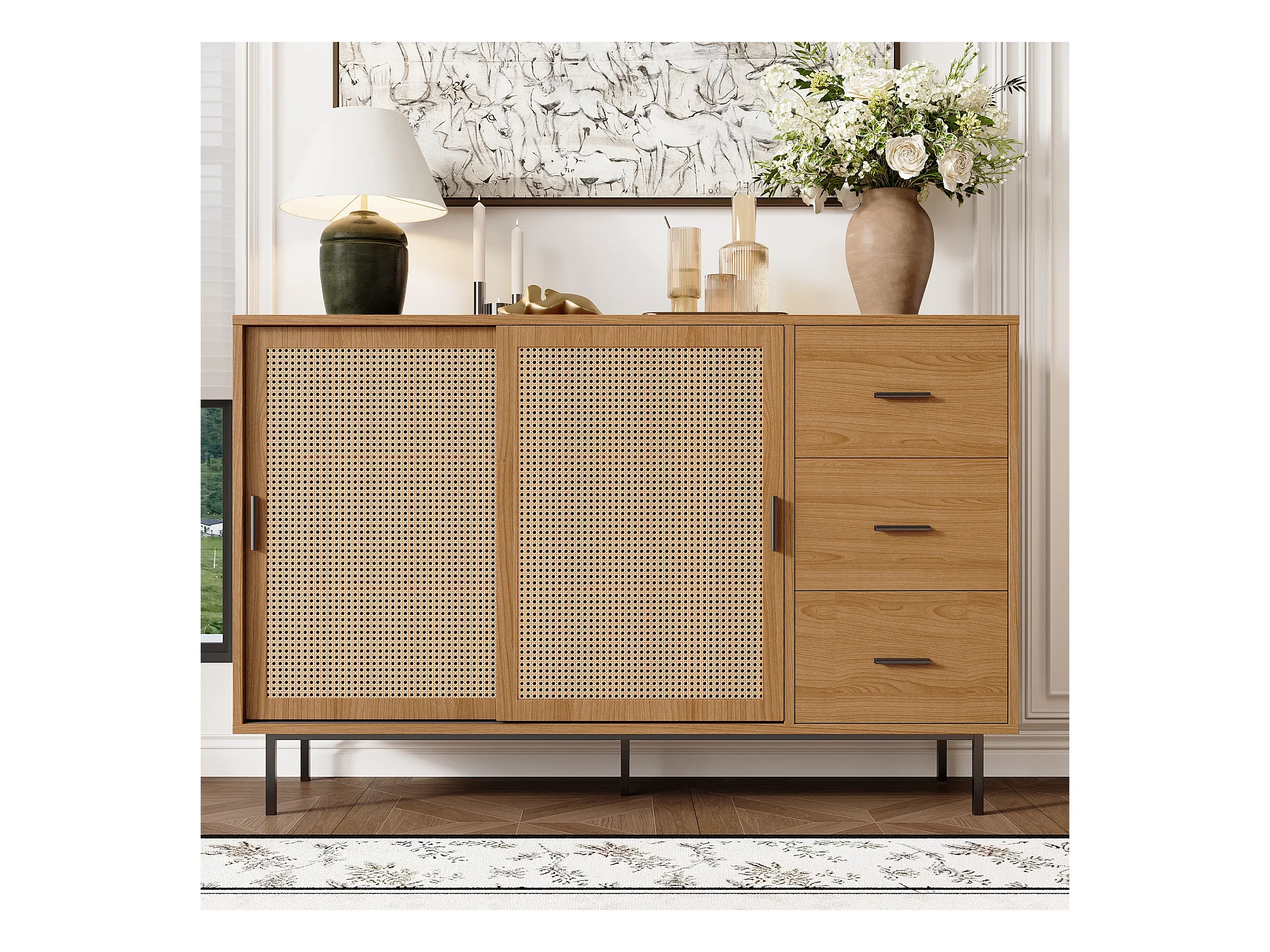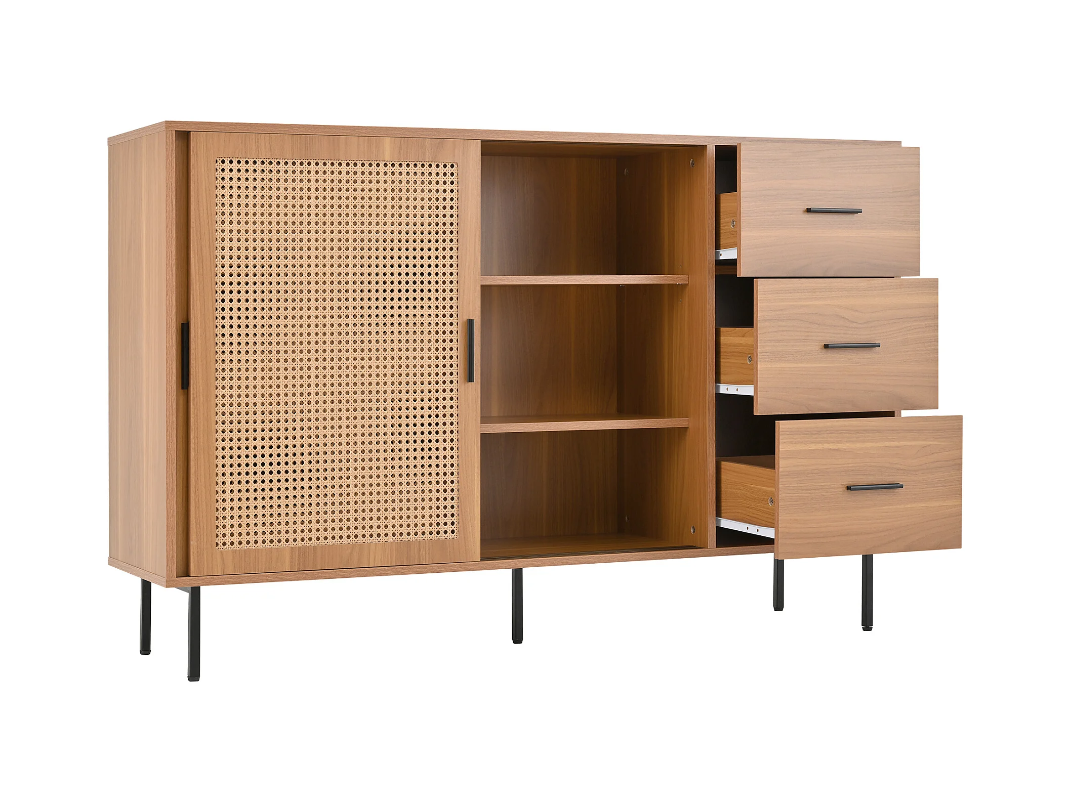 Buffet naturel avec 3 tiroirs et 2 portes en rotin, étagères réglables - poignées et pieds noirs