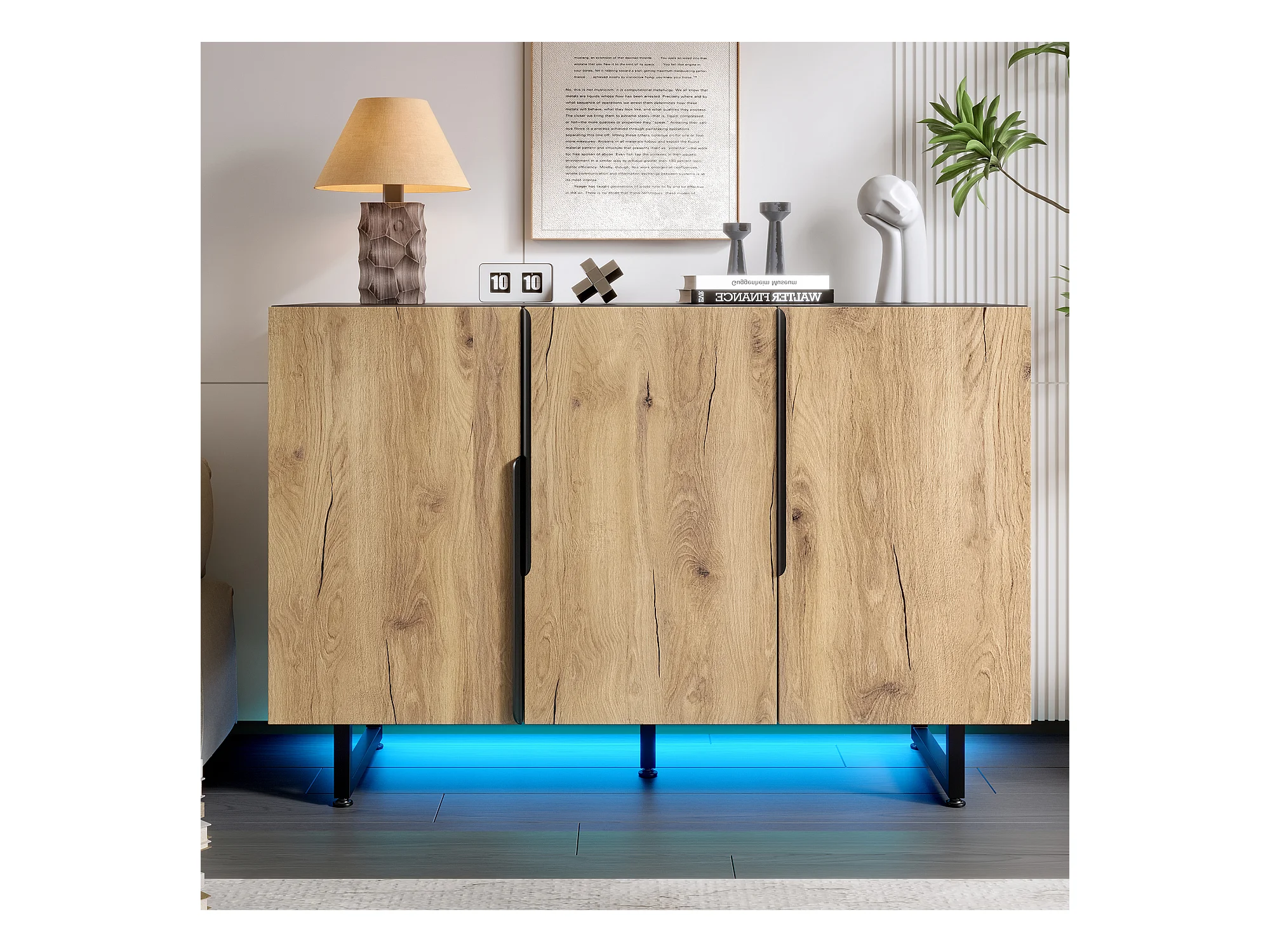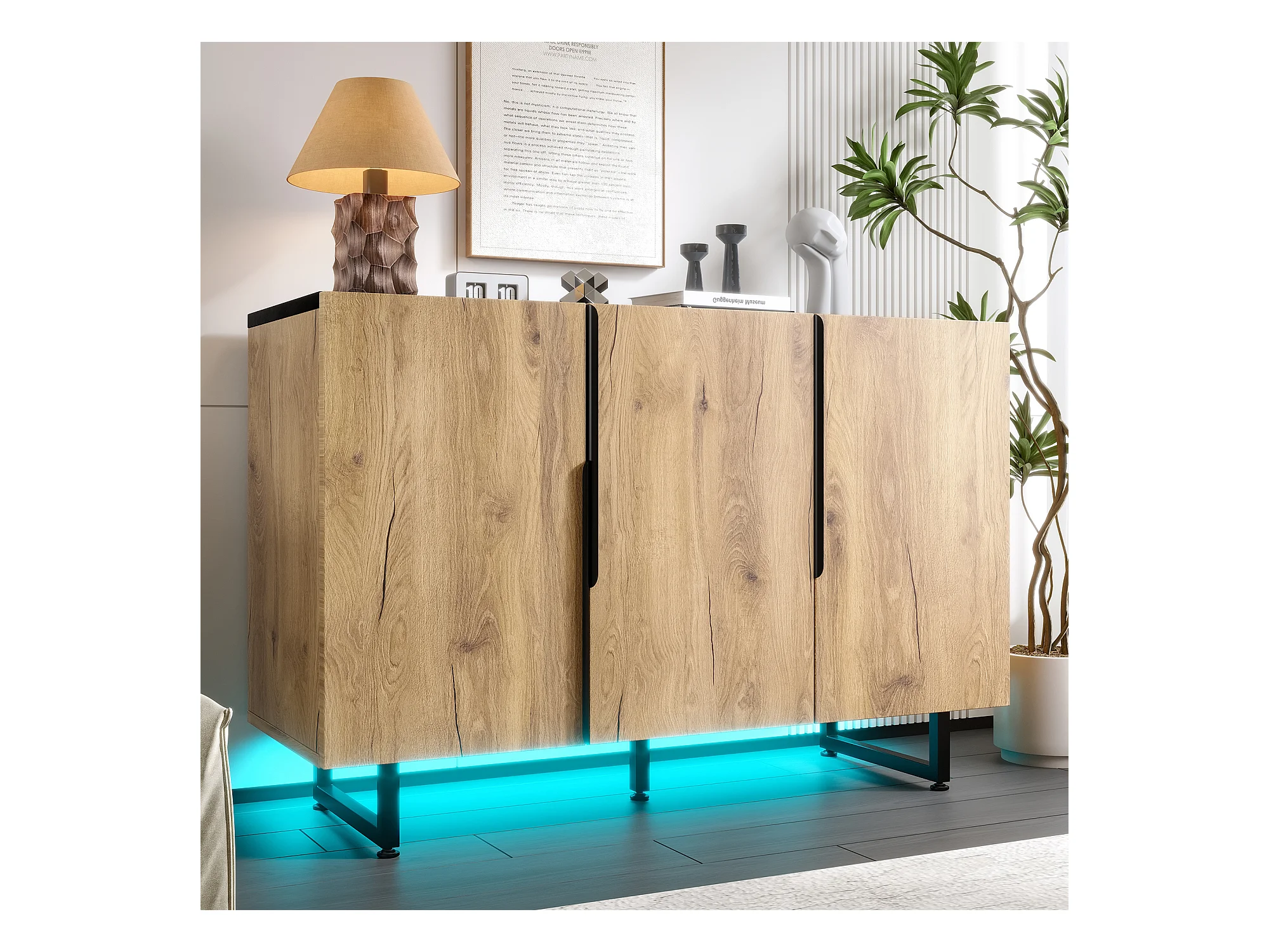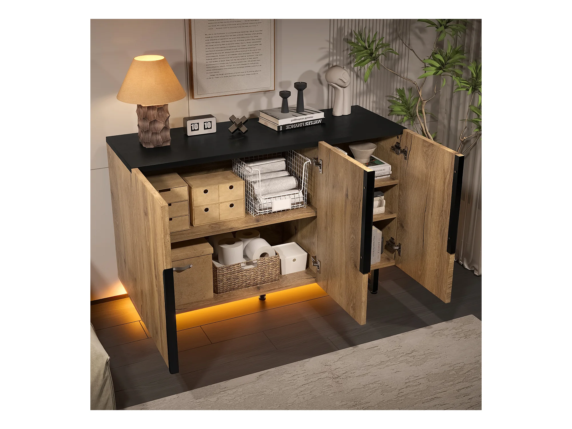 Buffet naturel avec pieds et étagères réglables, éclairage LED - plateau et poignées noirs