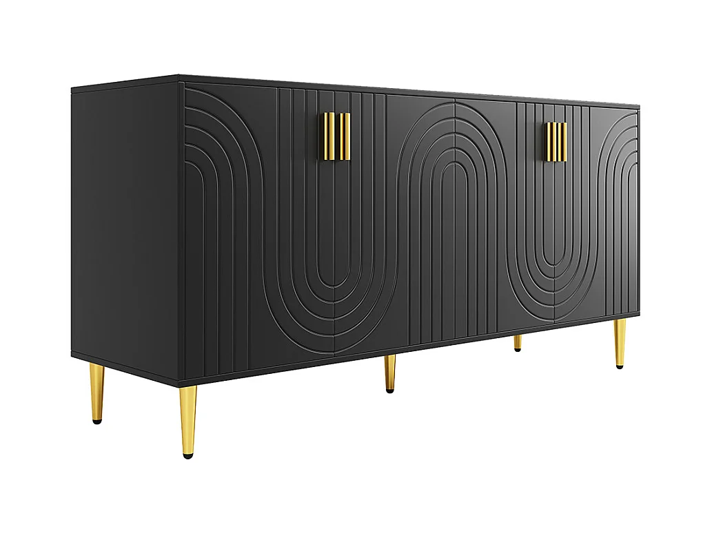 Buffet noir (152 x 40 x 75 cm), design unique en forme de vague, poignées et pieds dorés