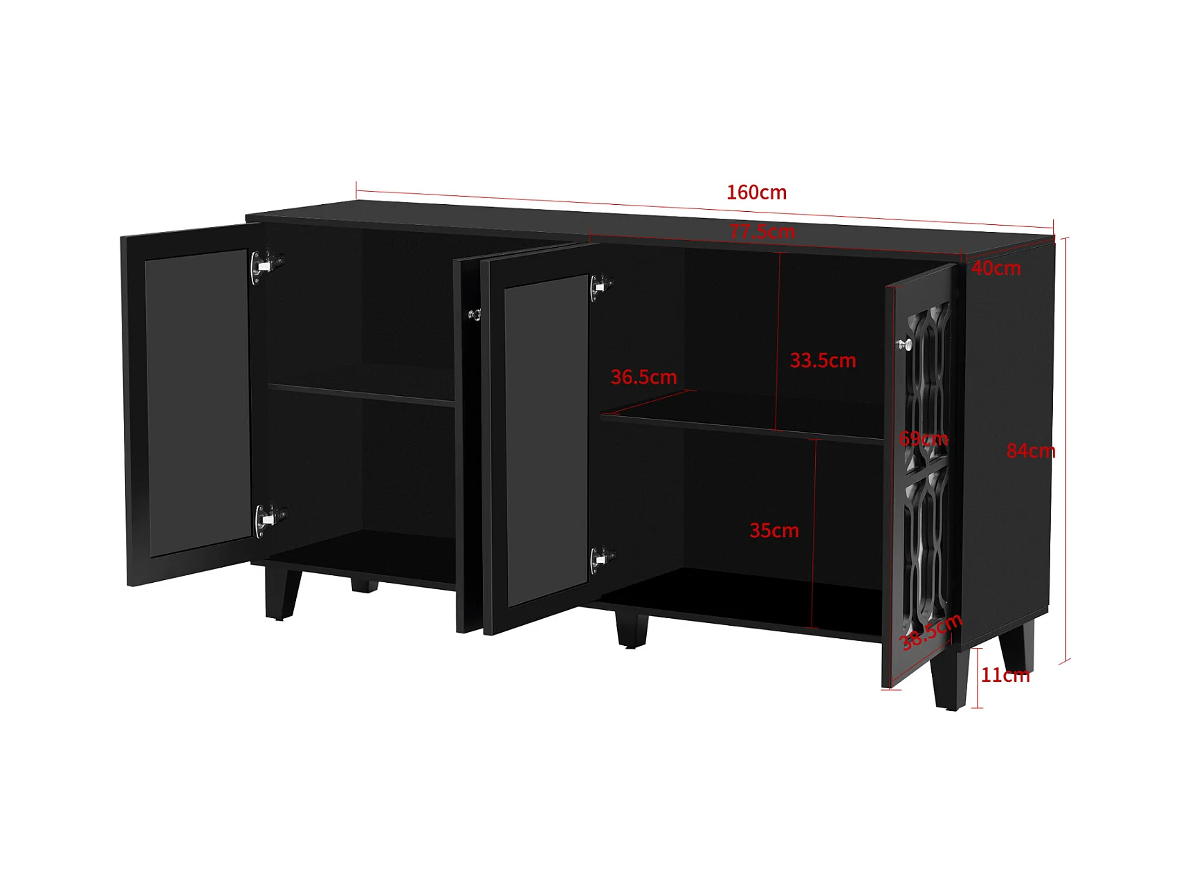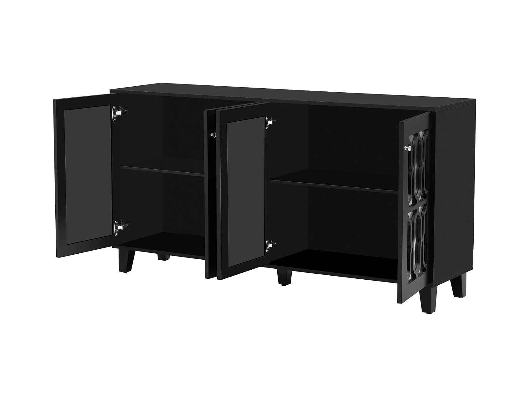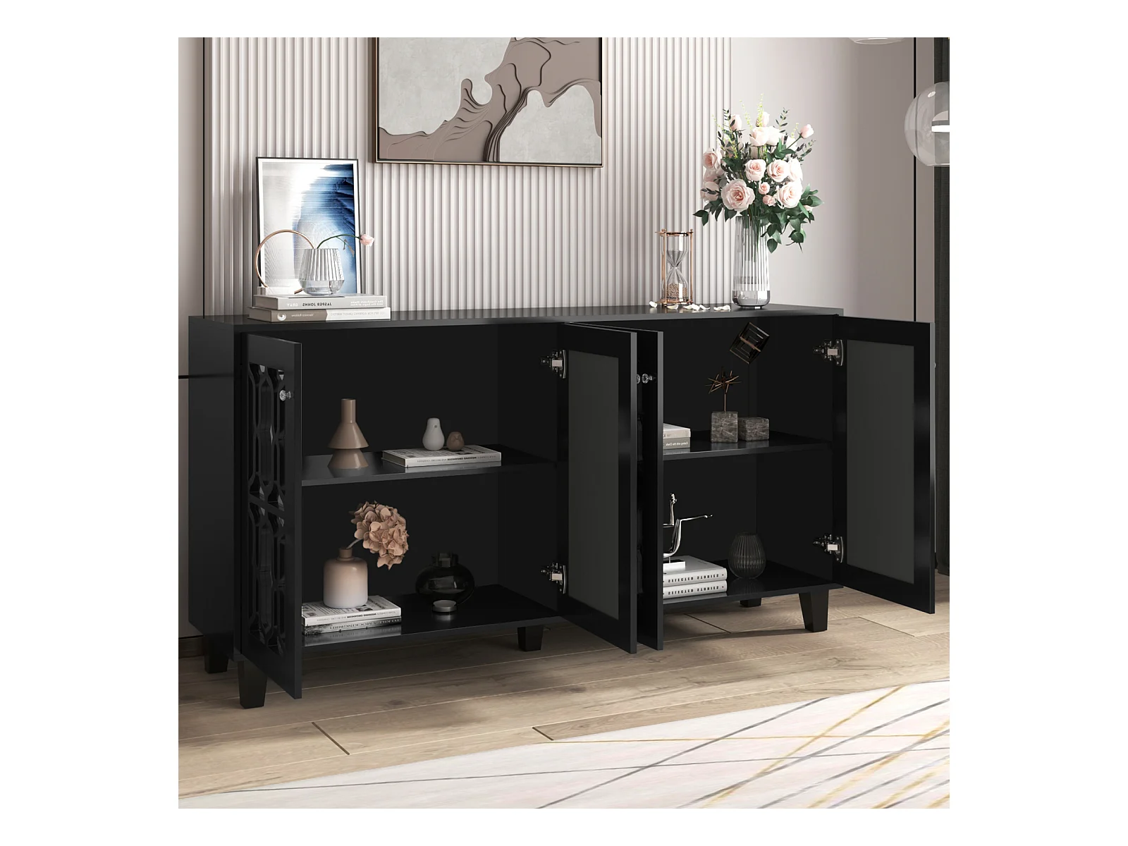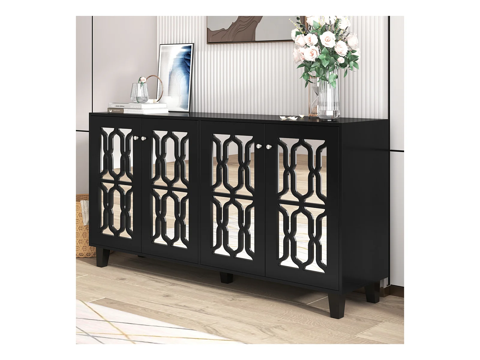 Buffet noir miroir 4 portes avec poignées en cristal et étagères amovibles – 160 x 40 x 84 cm, élégant et pratique pour salon et salle à manger