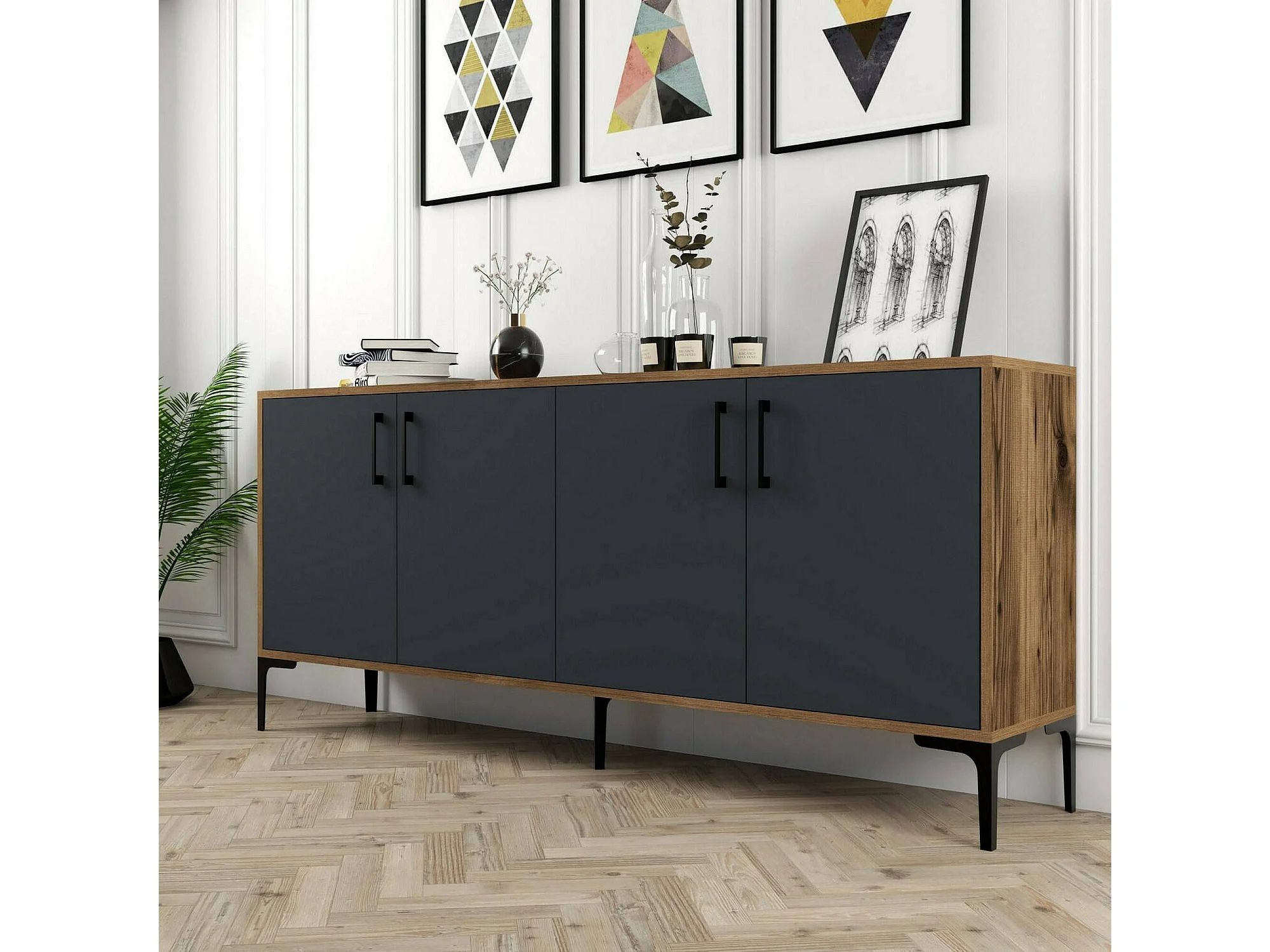 Buffet Orionis, Buffet du salon, Commode de salon, Garde-manger de cuisine, 180x35h78 cm, Noyer et Anthracite
