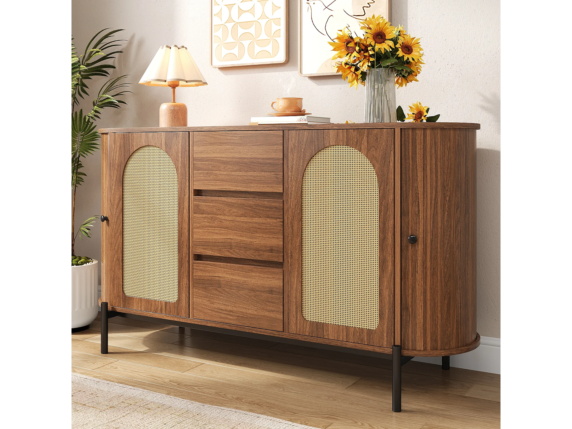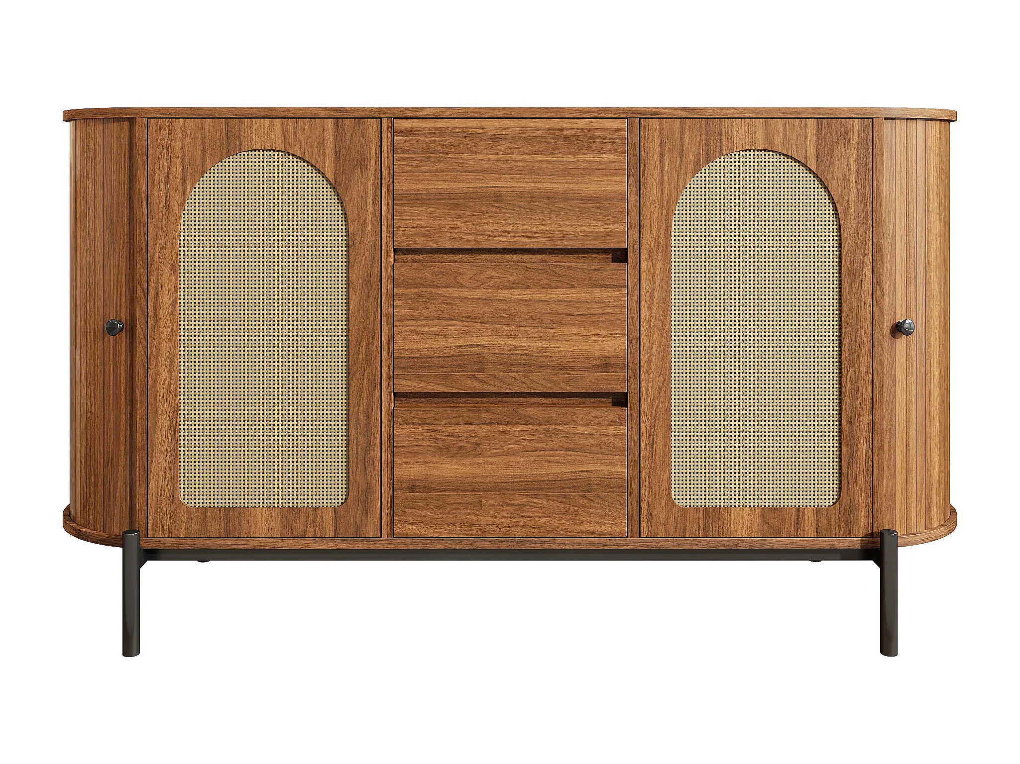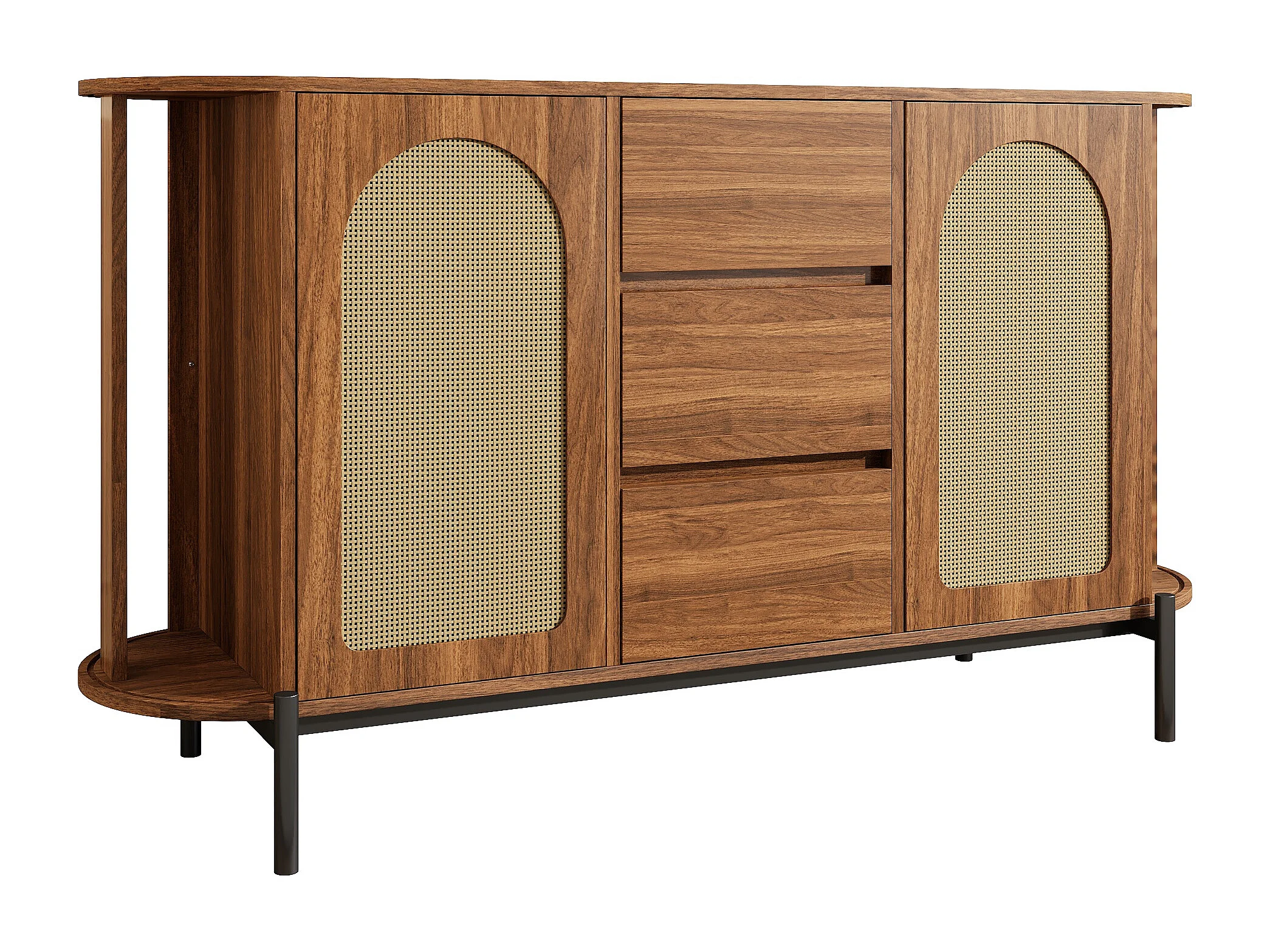Buffet ovale en rotin 140x38x77.5cm - 4 portes et 3 tiroirs - Finition imitation bois - Pieds en métal - MDF - Marron
