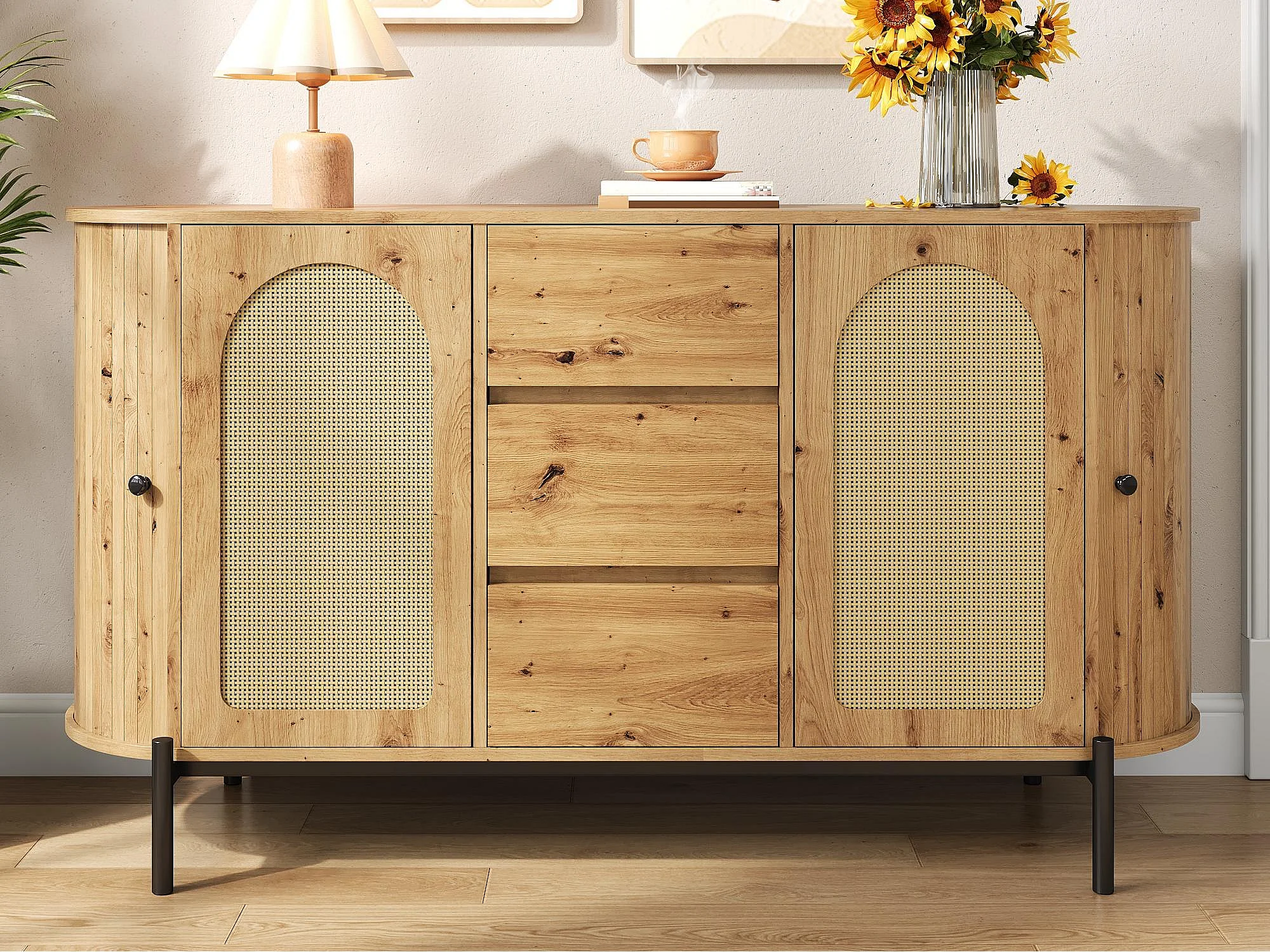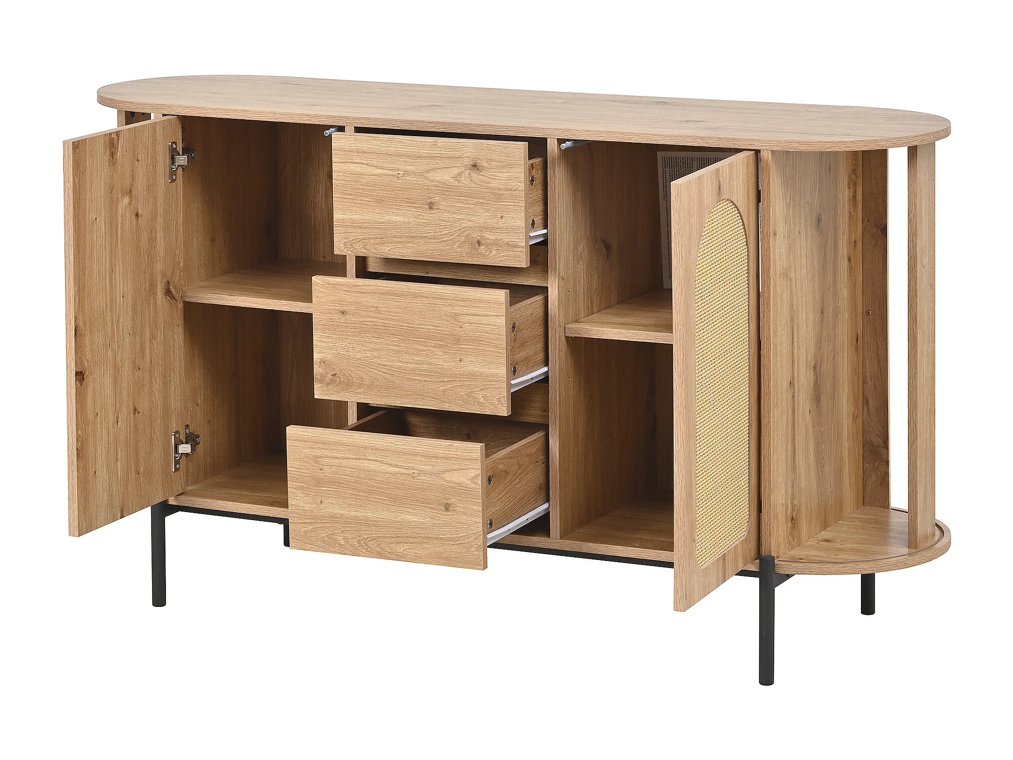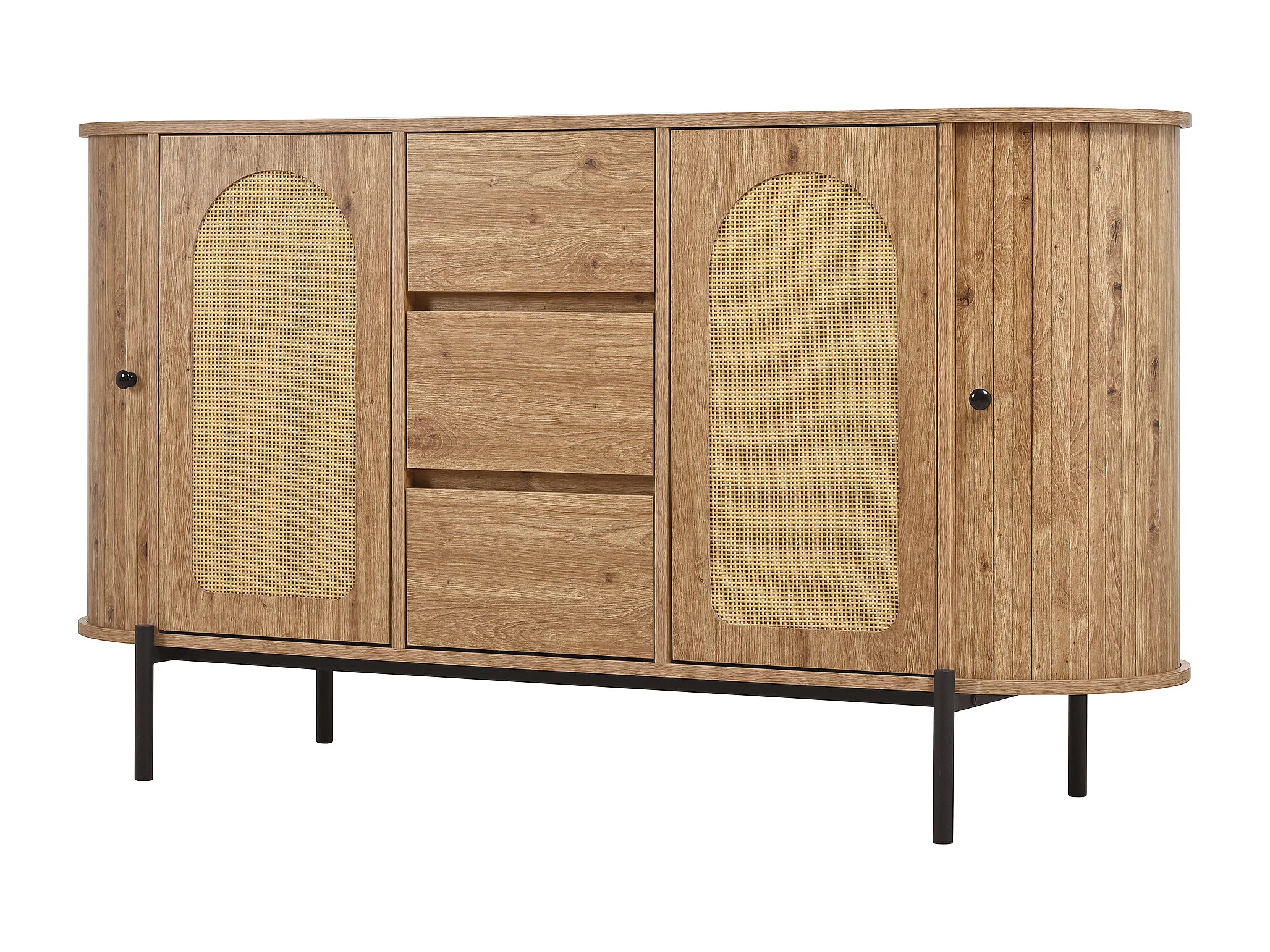 Buffet ovale en rotin 140x38x77.5cm - 4 portes et 3 tiroirs - Finition imitation bois - Pieds en métal - MDF - Naturel