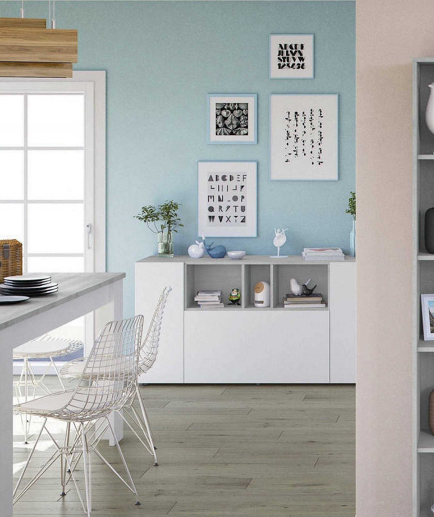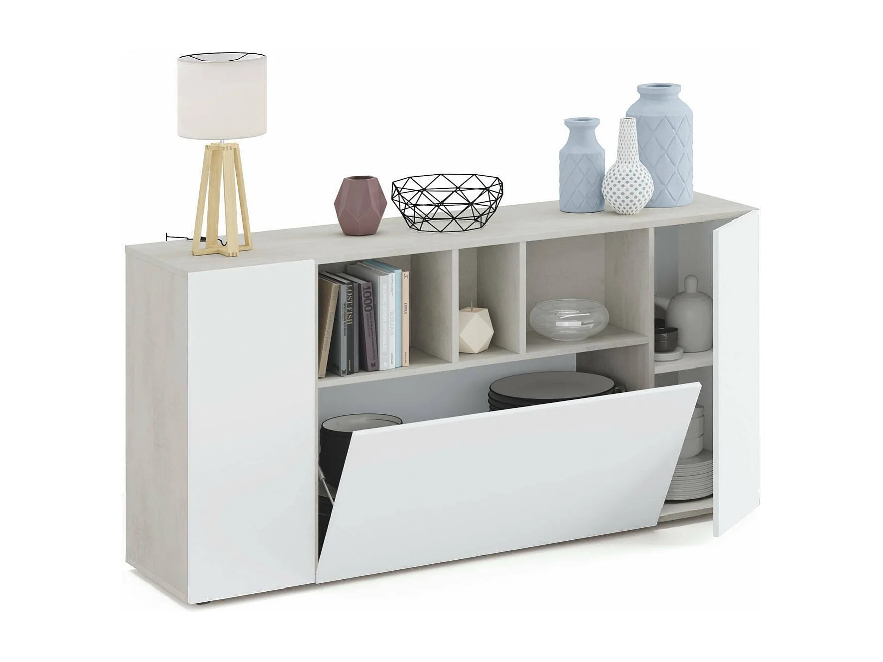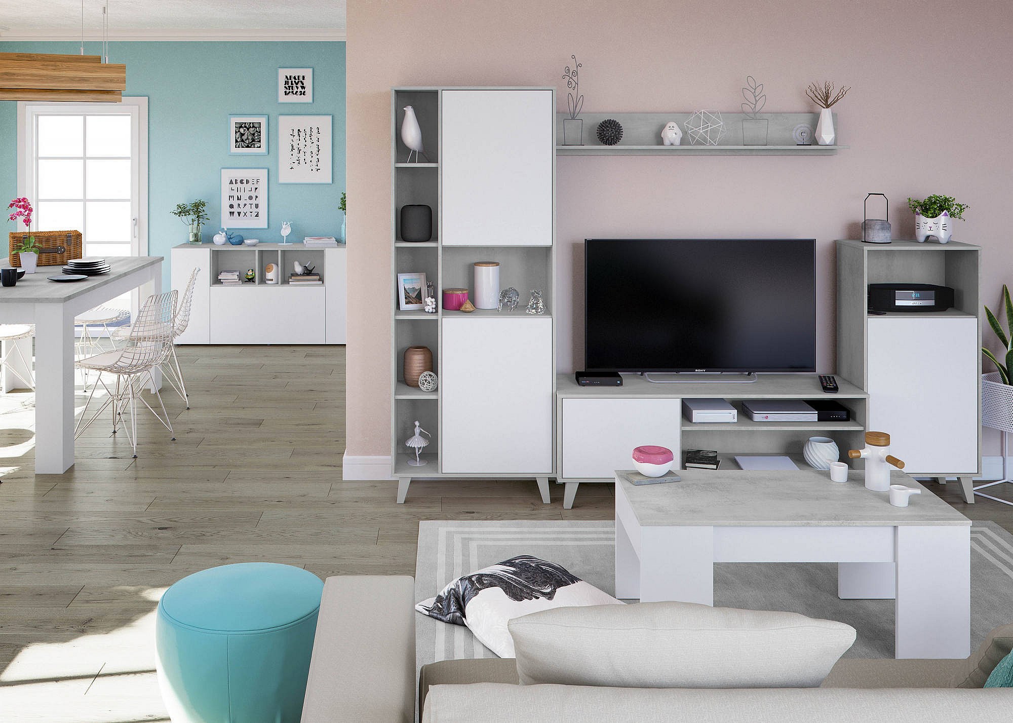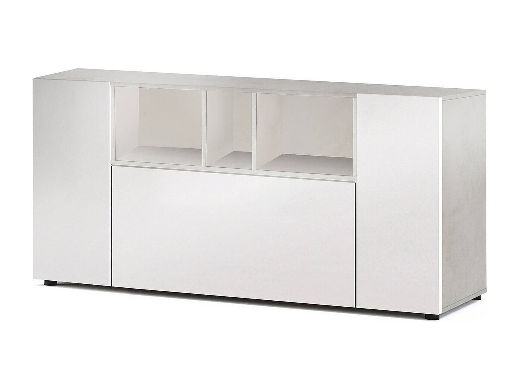 Buffet Paterson, Buffet de salon avec compartiments, Buffet de salon, Meuble TV, Armoire moderne avec 3 portes, 150x41h76 cm, Blanc et Ciment