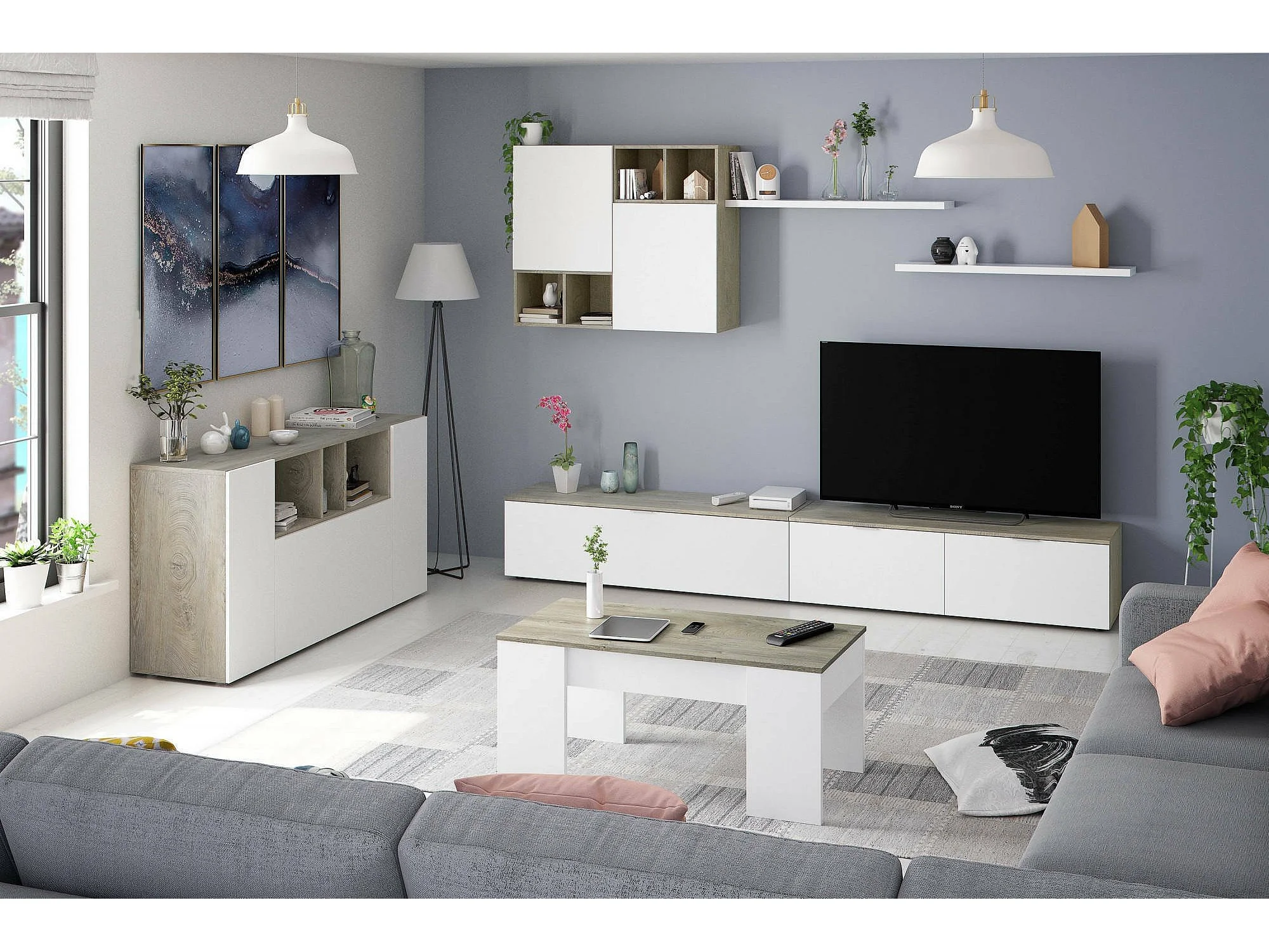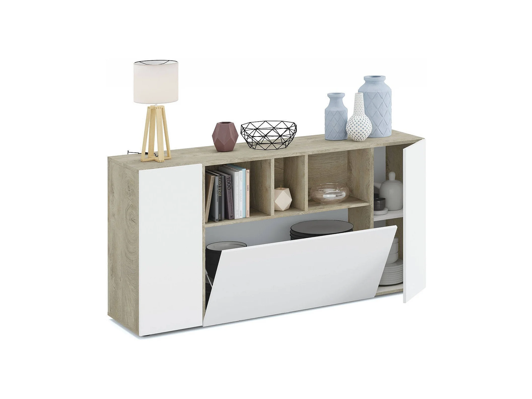 Buffet Paterson, Buffet de salon, Buffet de salon avec compartiments, Meuble TV, Armoire moderne avec 3 portes, 150x41h76 cm, Blanc et Chêne
