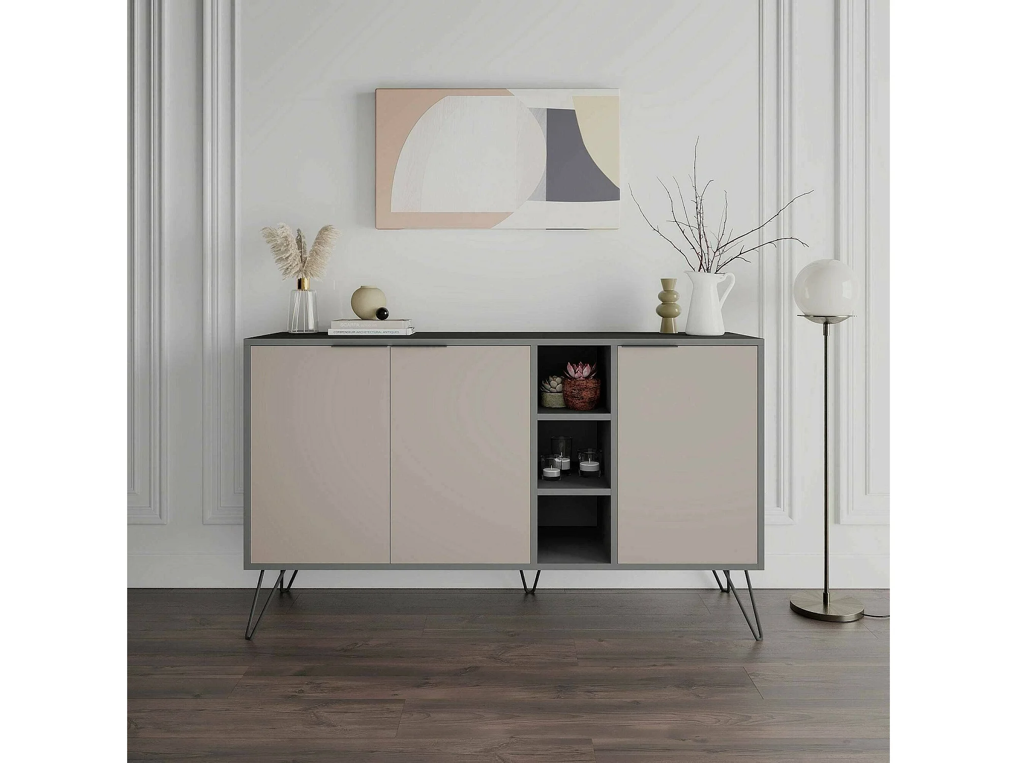 Buffet Perseus, Buffet du salon, Commode de salon, Garde-manger de cuisine, 142x36h83 cm, Anthracite et Beige