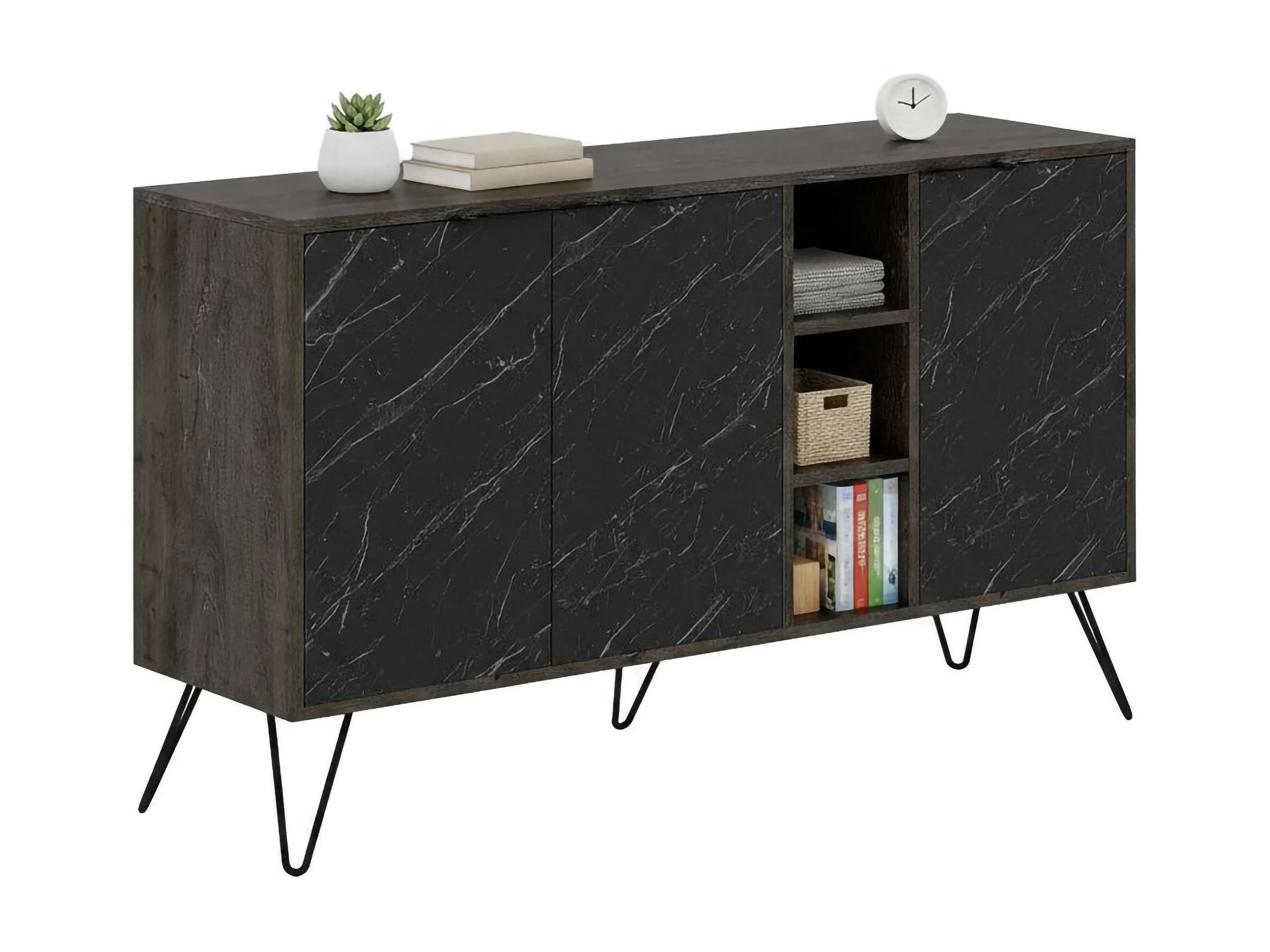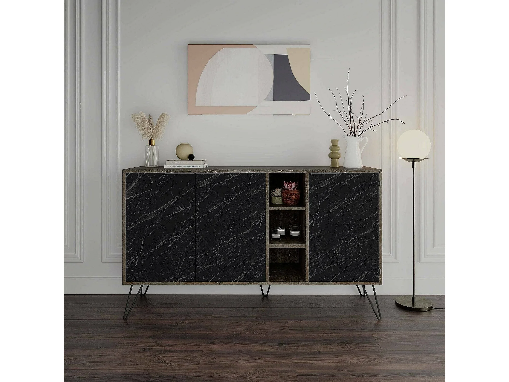 Buffet Perseus, Buffet du salon, Commode de salon, Garde-manger de cuisine, 142x36h83 cm, Marbre Noir