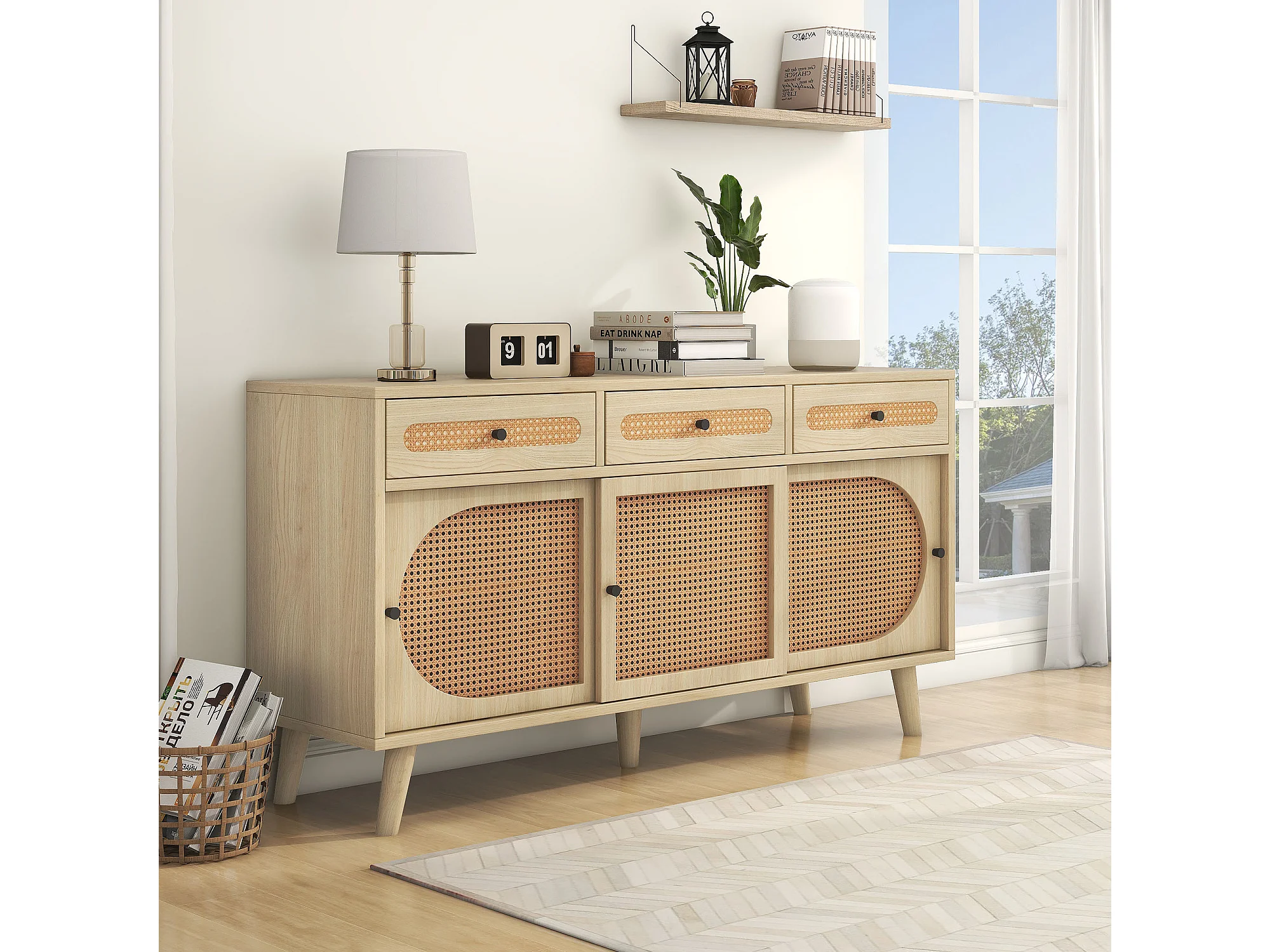 Buffet salle à manger 3 portes coulissantes en rotin 3 tiroirs - meuble de rangement en bois - chêne (140x40x78 cm)