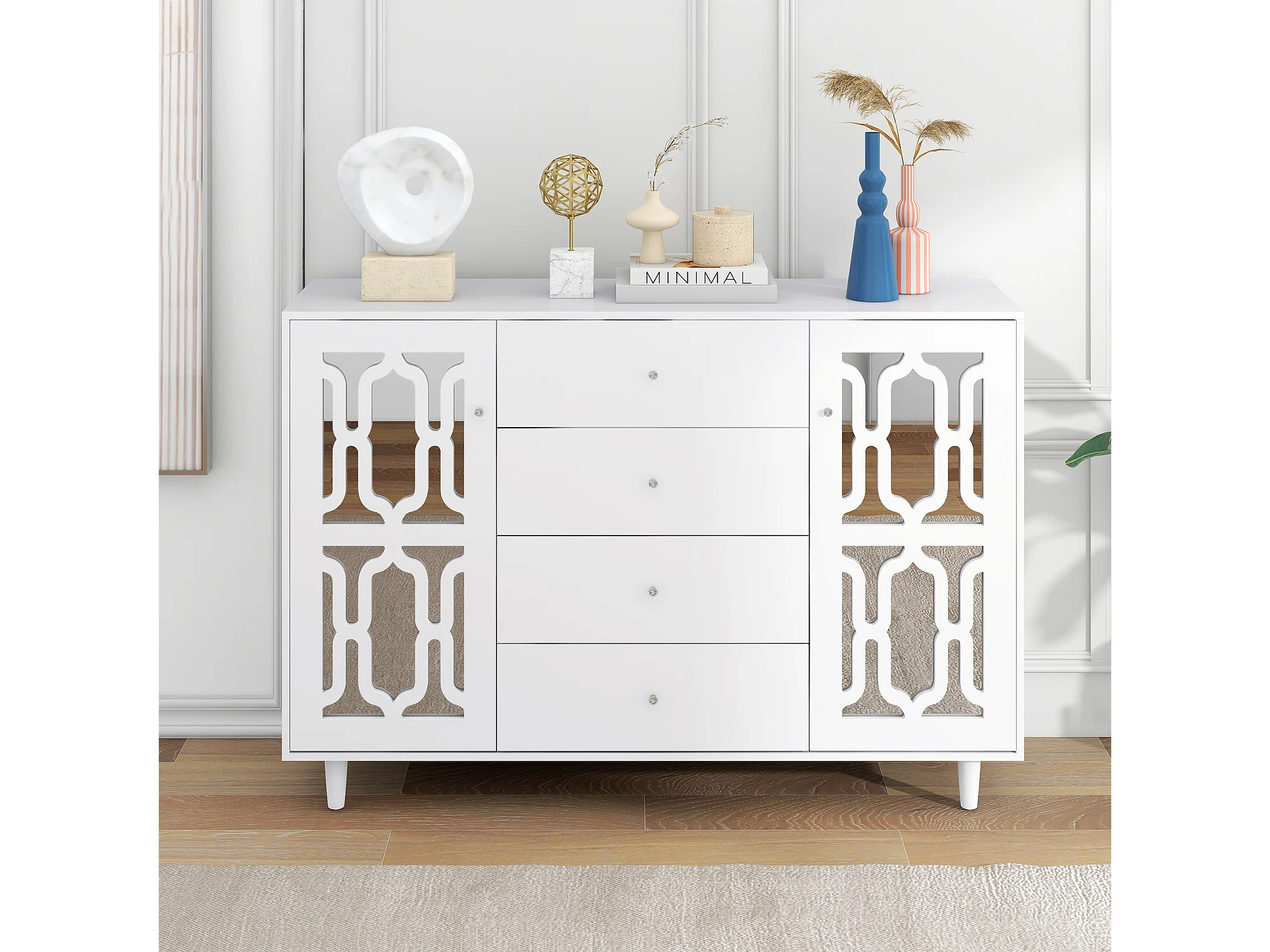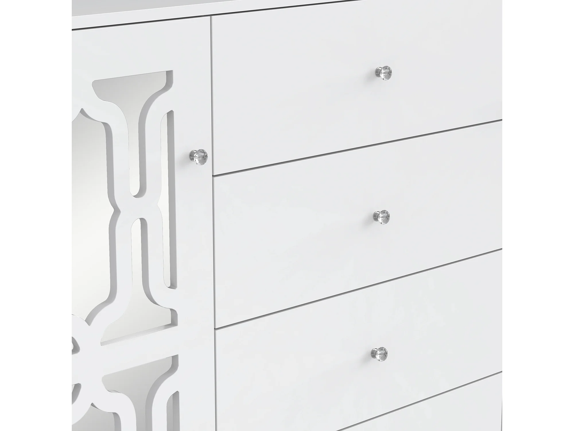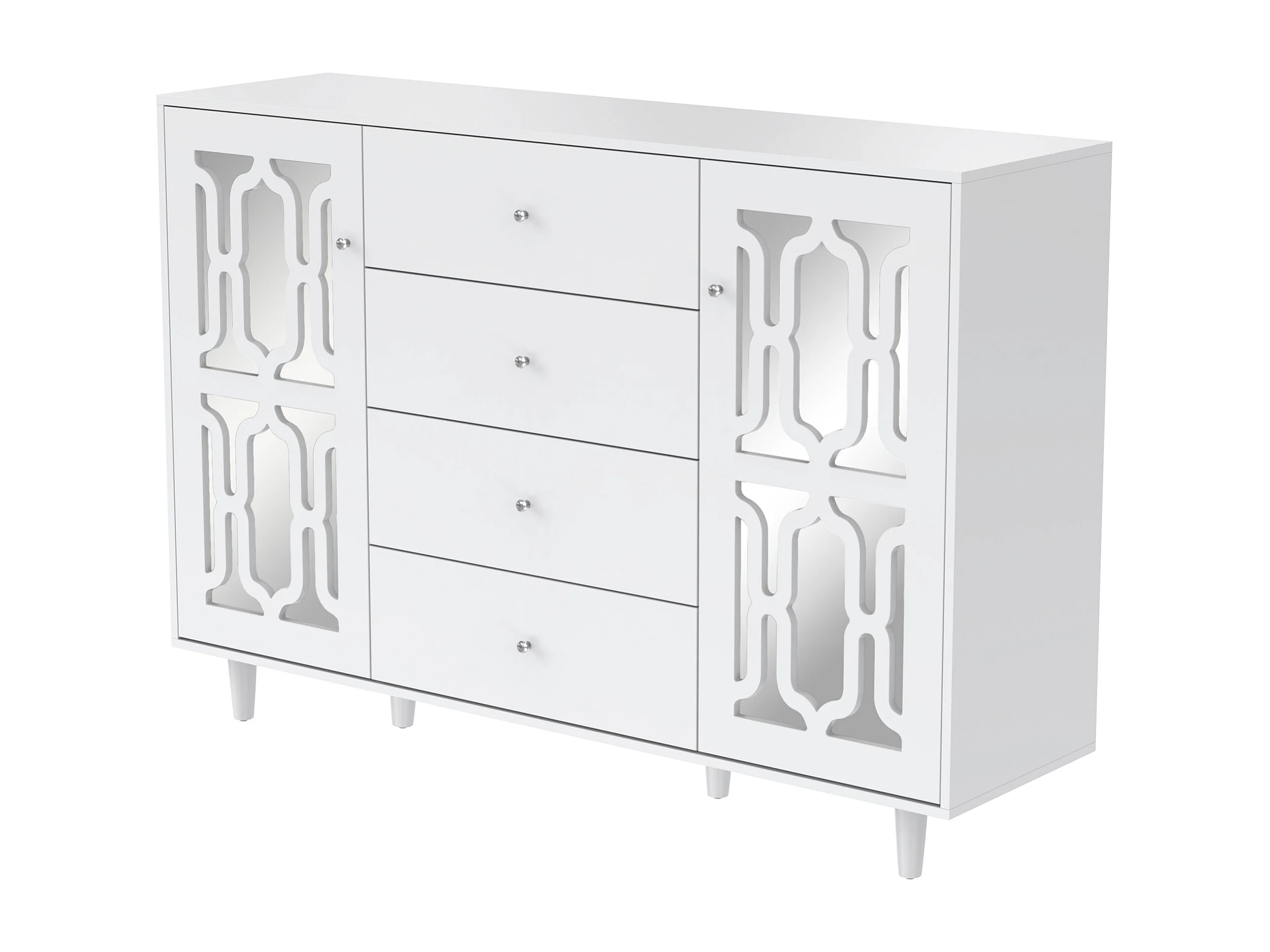 Buffet 147.5x40x102 cm, grand rangement, 2 portes et 4 tiroirs, plateau effet miroir, MDF blanc