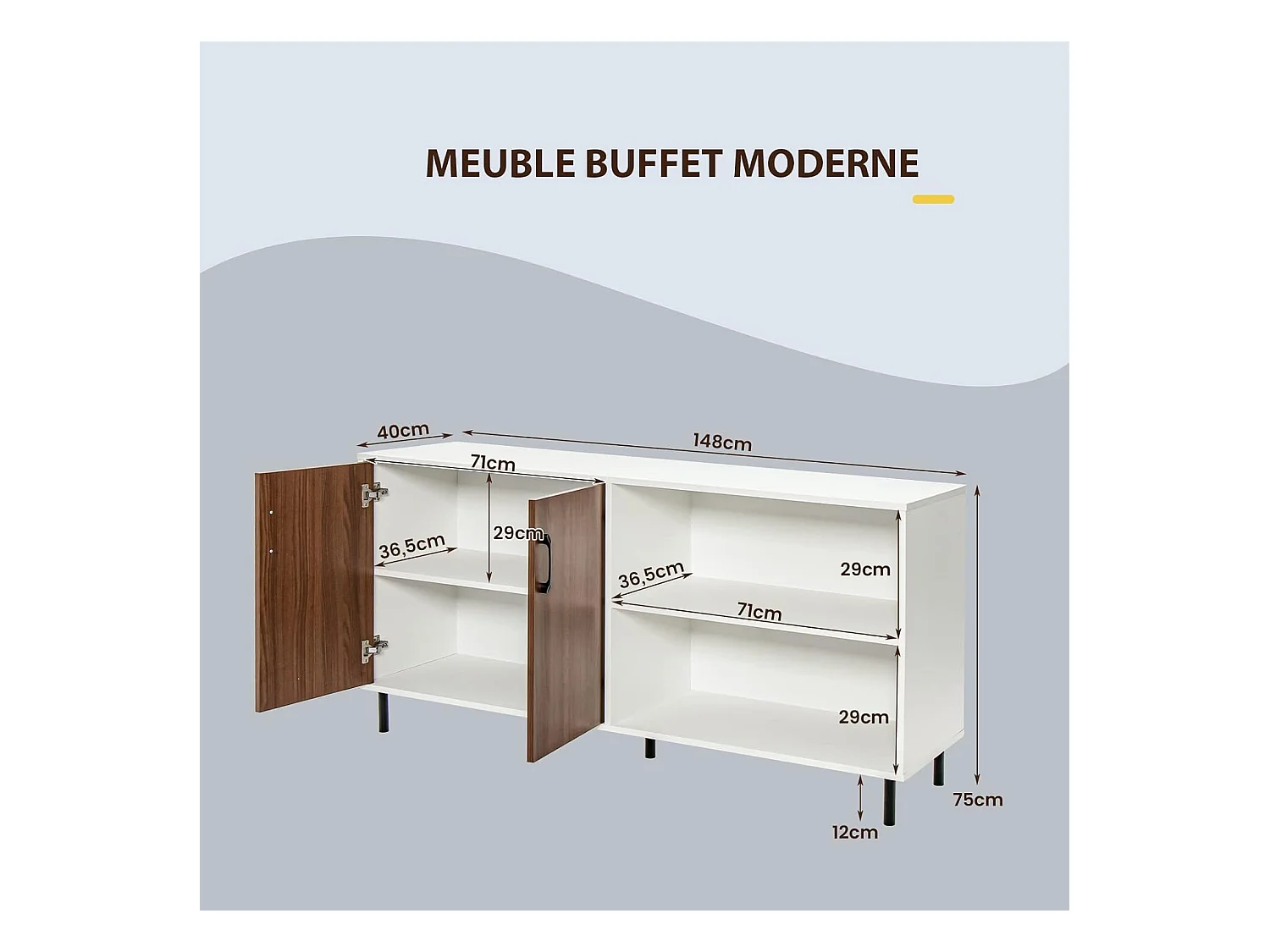 Buffet salon avec 2 portes et 2 compartiments, 4 pieds métalliques, 148 x 40 x 75 cm