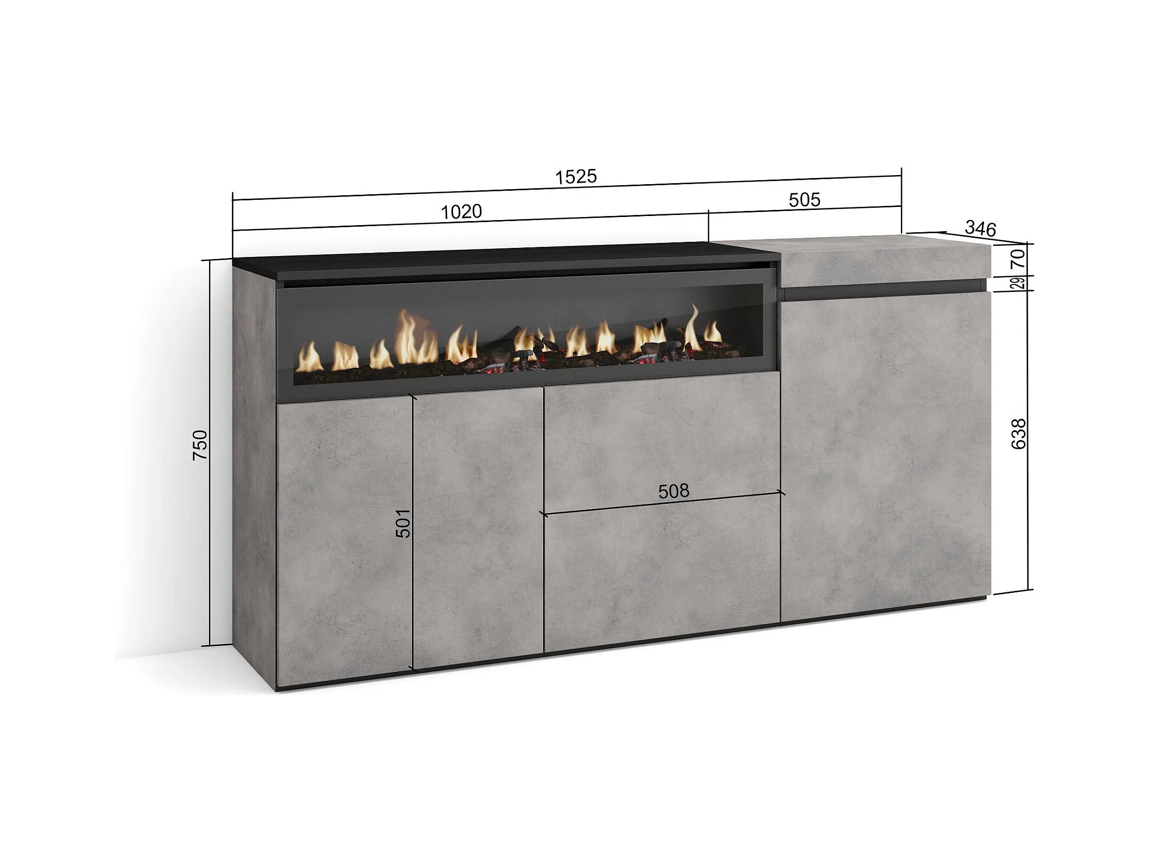 Buffet salon et cuisine, 150x35x87cm, 3 Portes, Cheminée électrique, Design industriel, Ciment