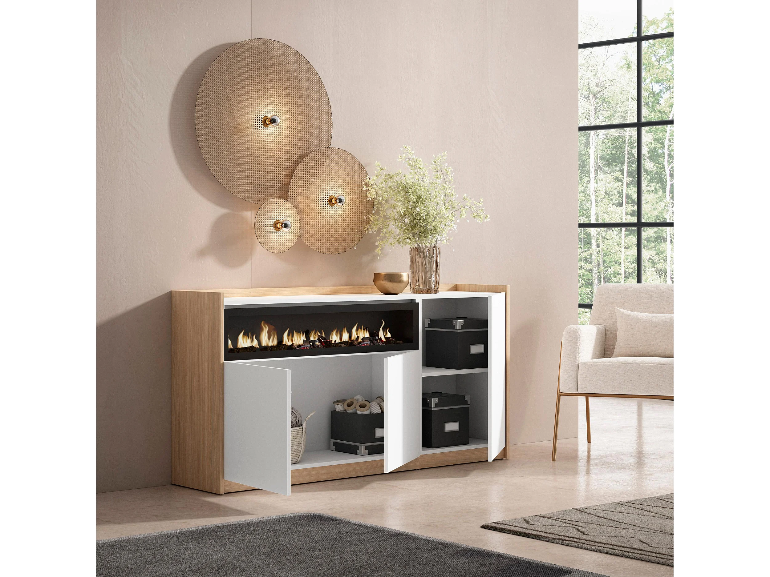 Buffet salon et cuisine, 156x80x37 cm, 3 Portes, Cheminée électrique, Blanc et Chêne Soft
