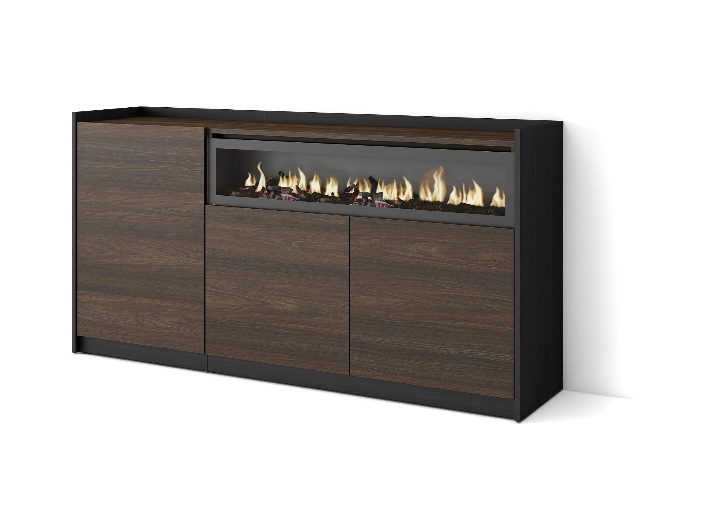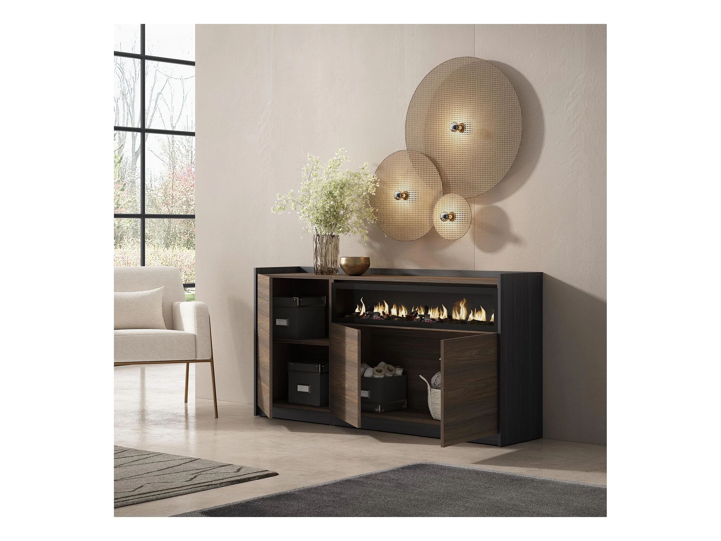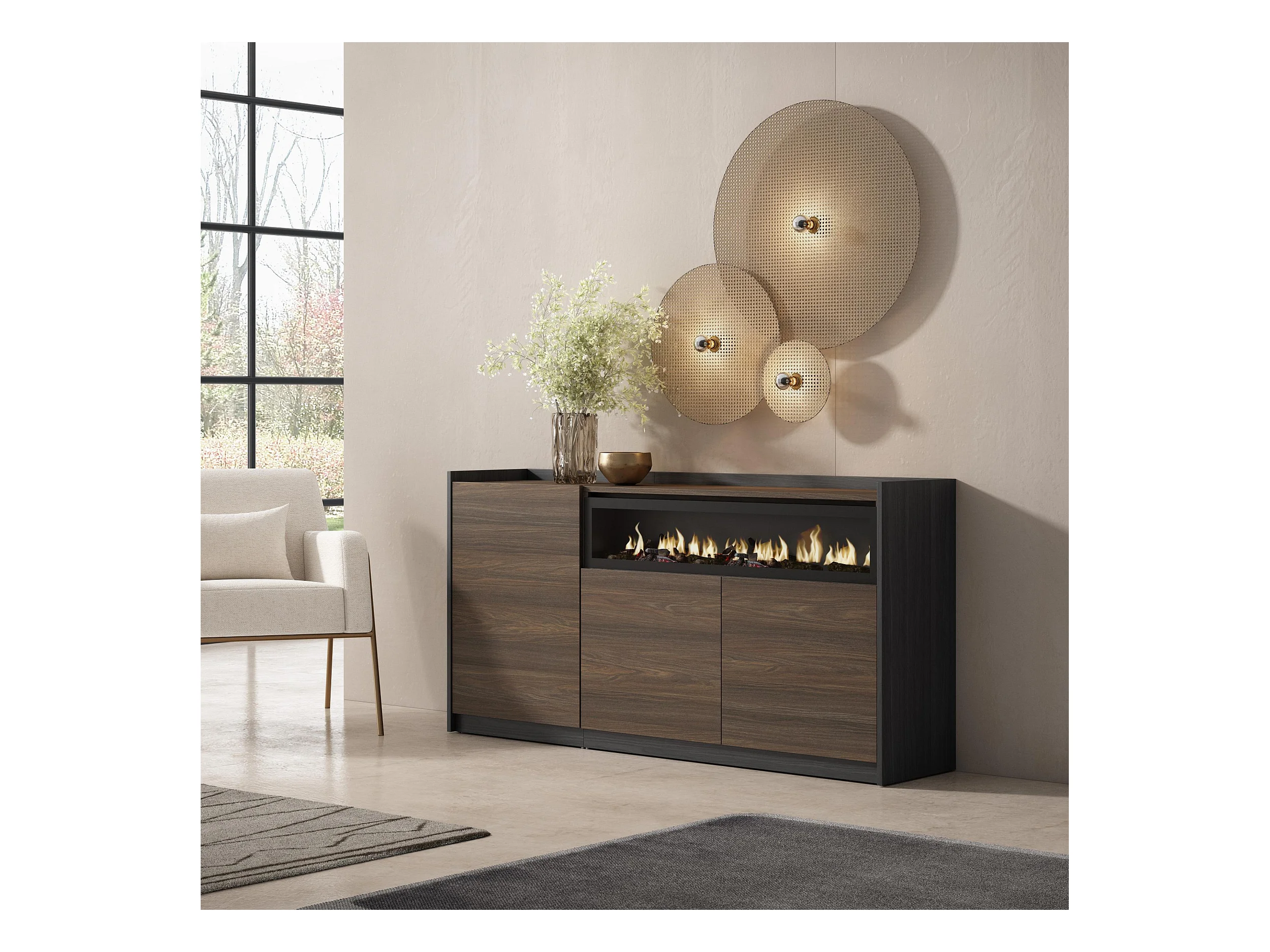 Buffet salon et cuisine, 156x80x37 cm, 3 Portes, Cheminée électrique, Chêne foncé et Noir