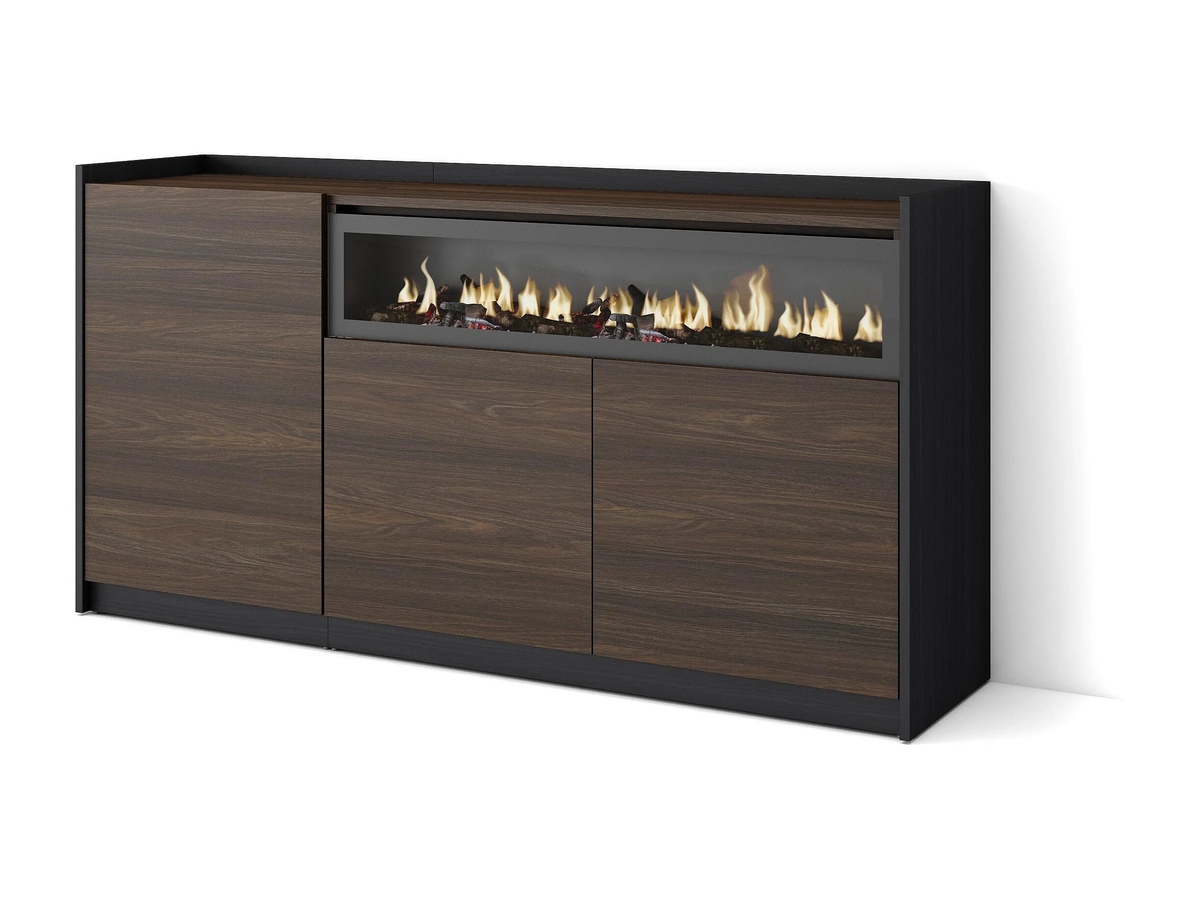 Buffet salon et cuisine, 156x80x37 cm, 3 Portes, Cheminée électrique, Chêne foncé et Noir