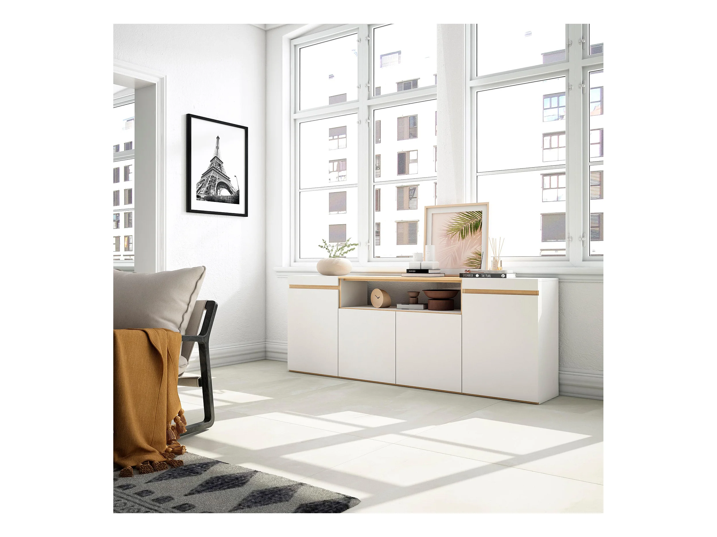 Buffet salon et cuisine, 200x35x87cm, 4 Portes, Design industriel, Blanc et Chêne Soft