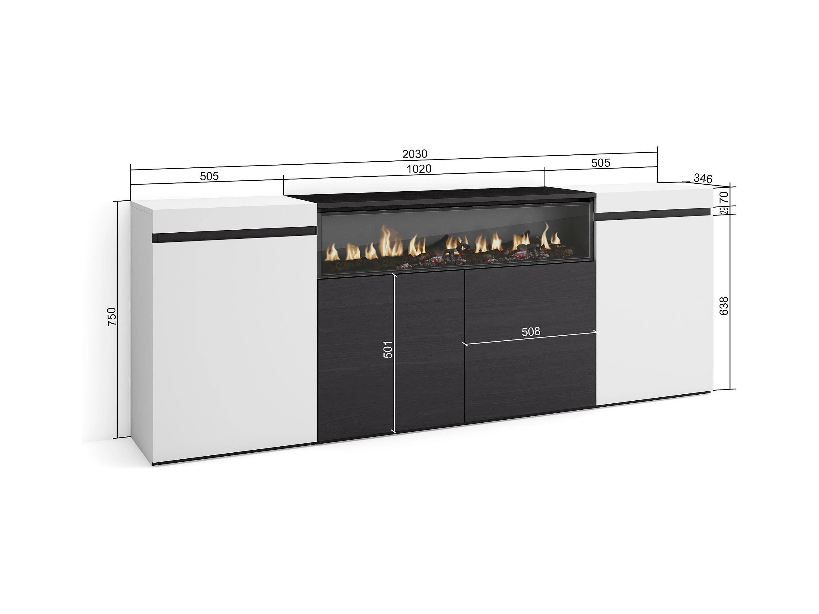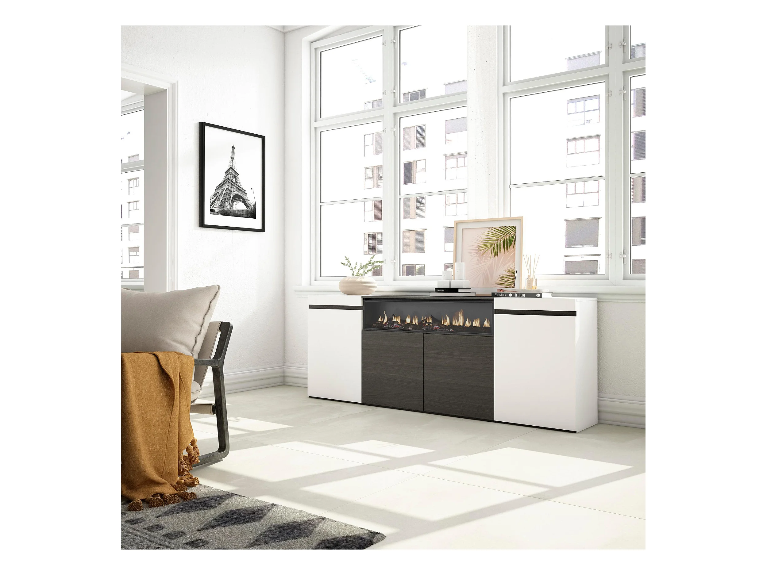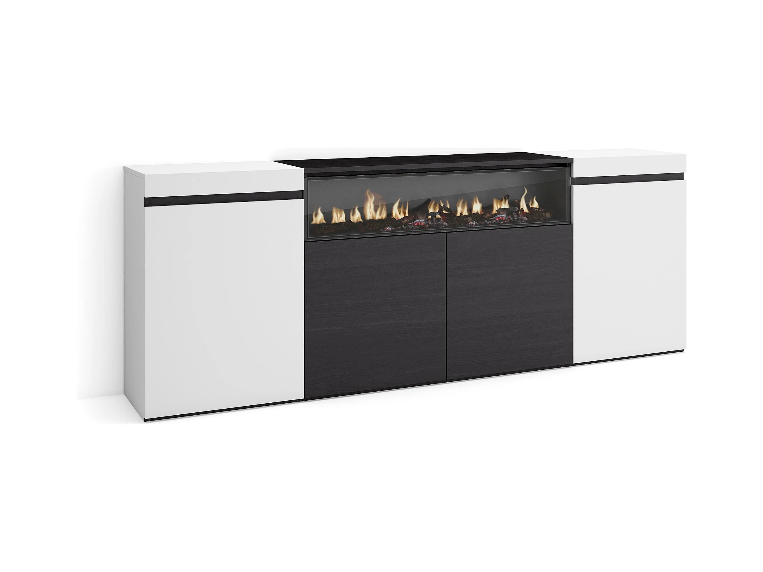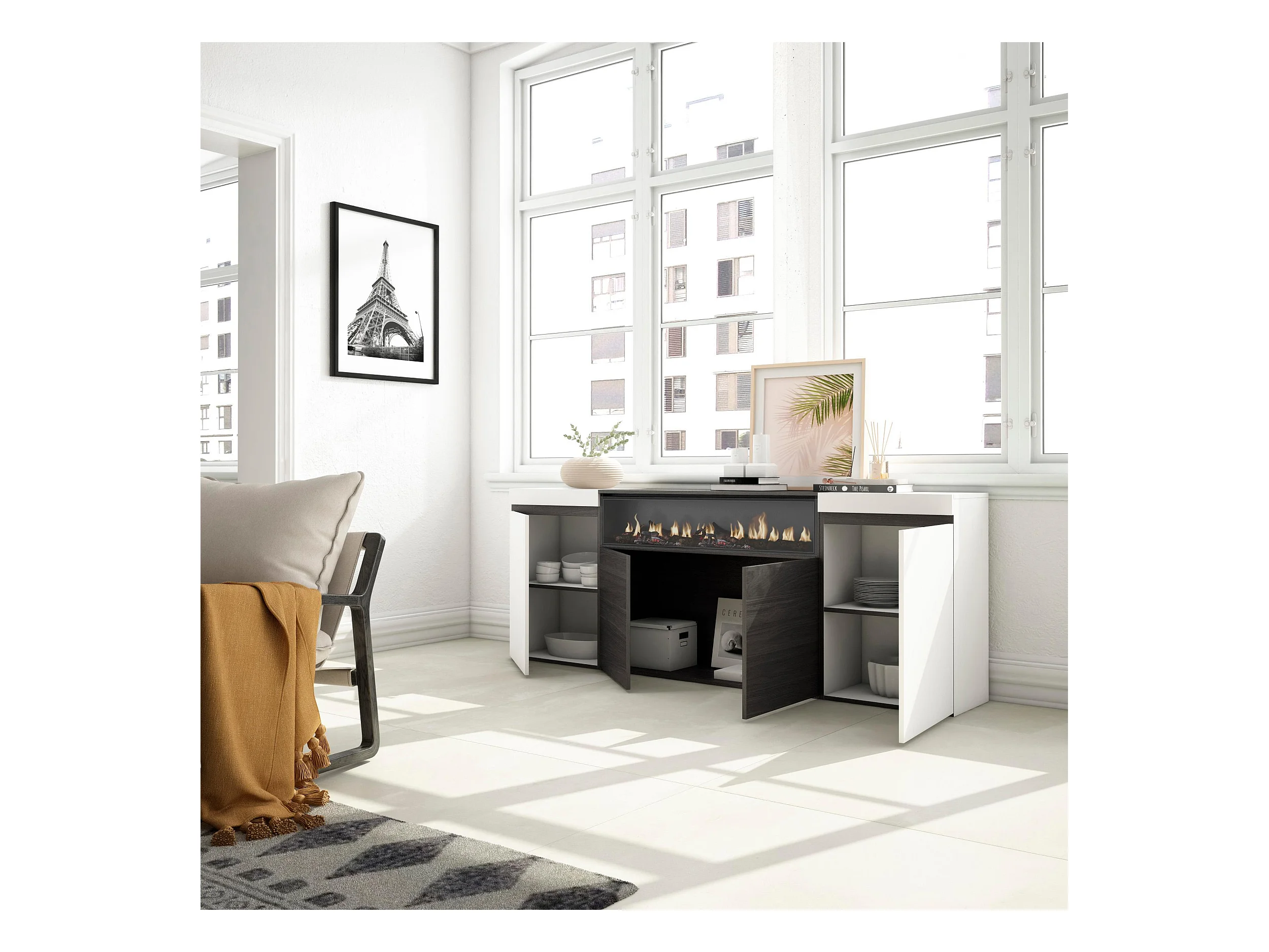 Buffet salon et cuisine, 200x75x35cm, 4 Portes, Cheminée électrique, Blanc et noir
