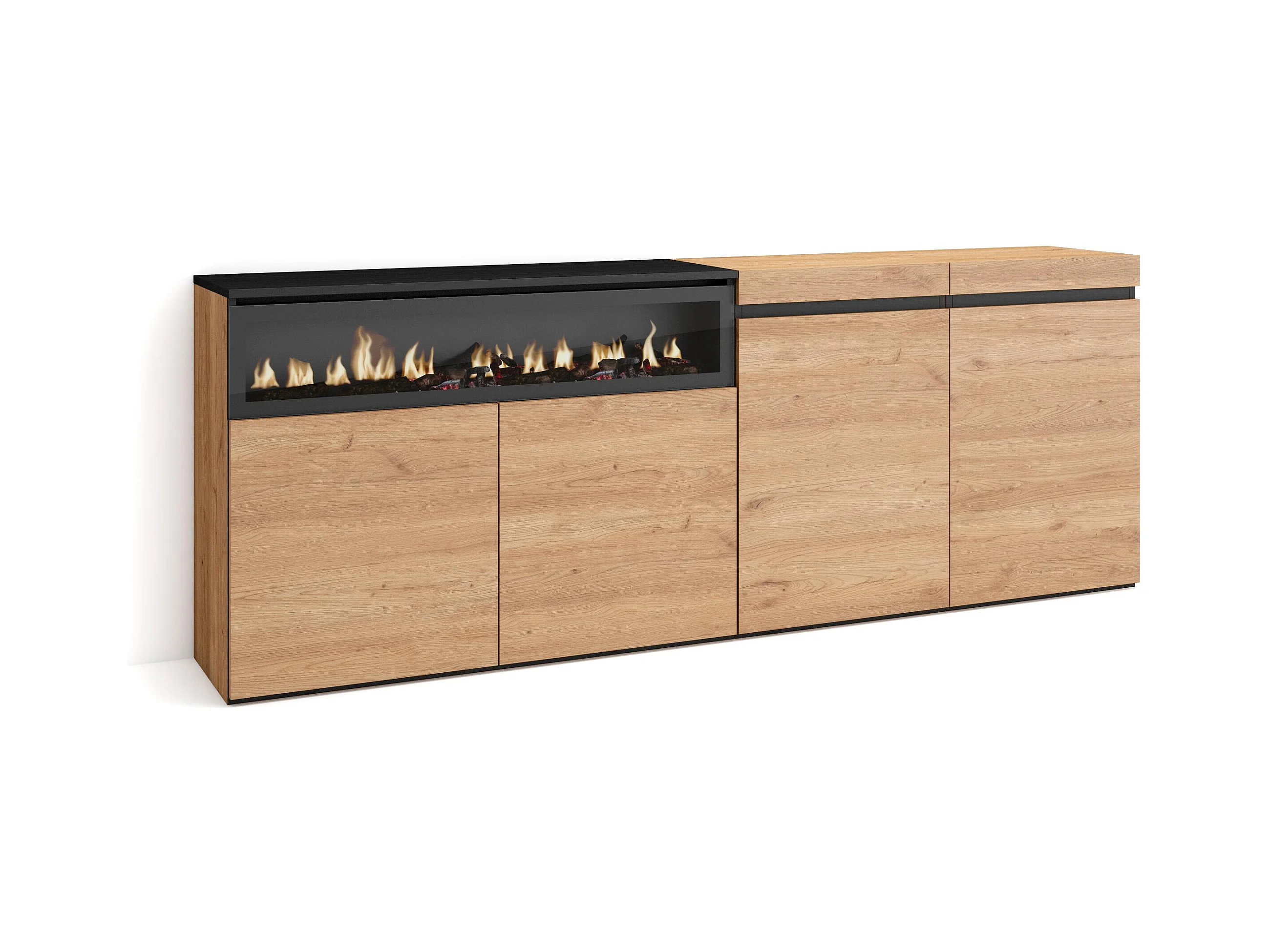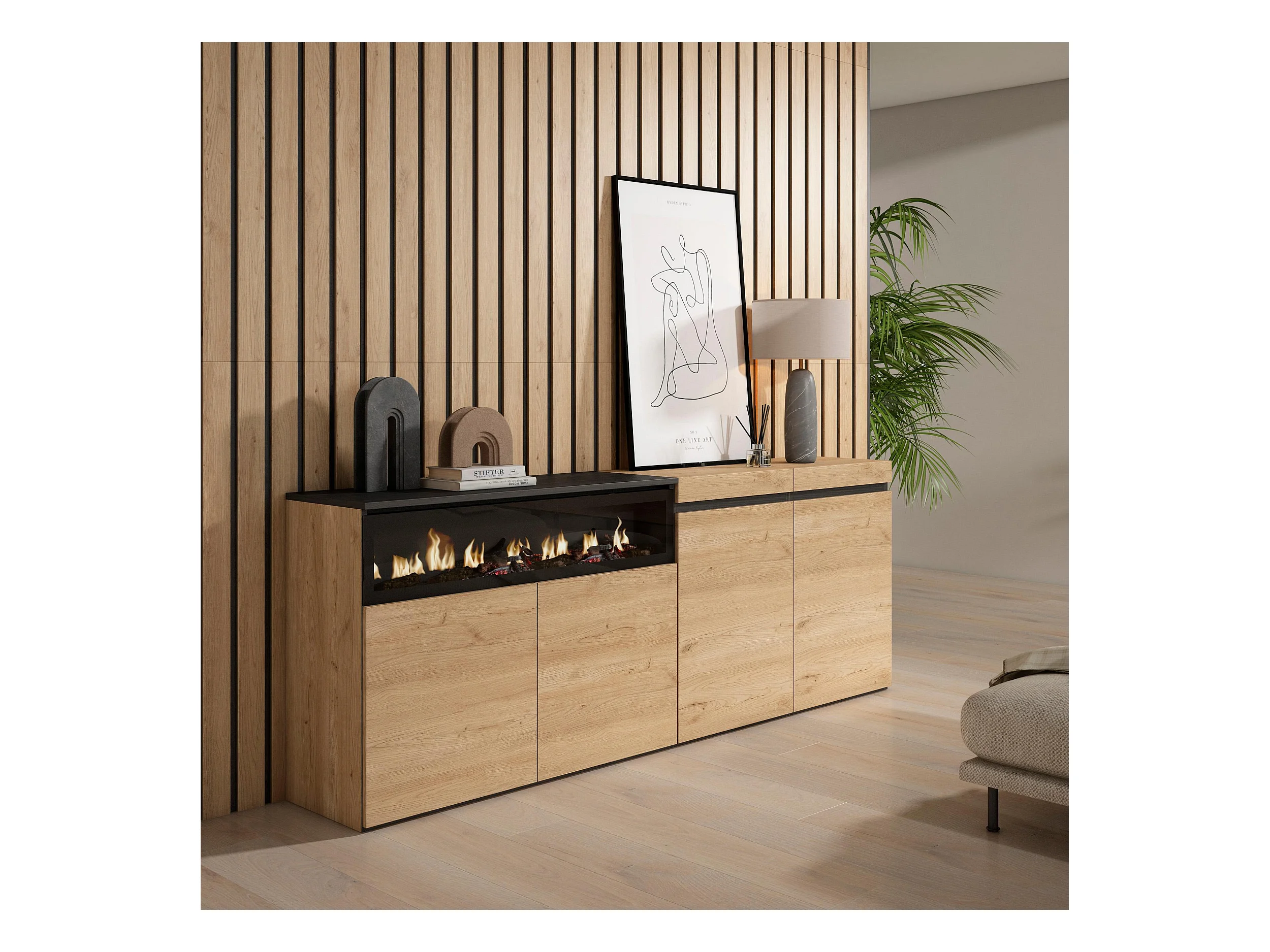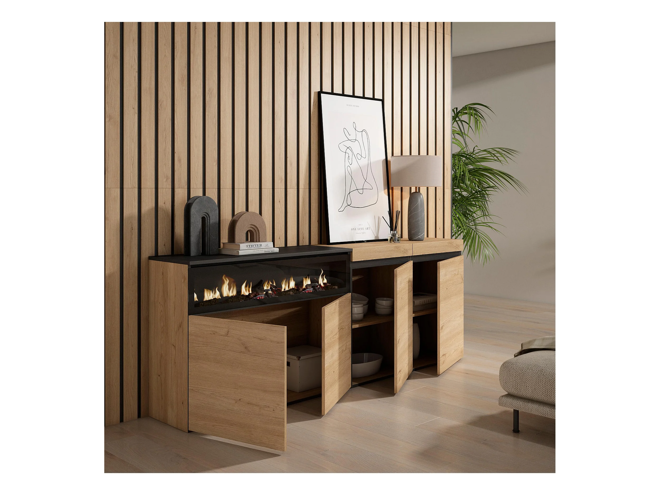 Buffet salon et cuisine, 200x75x35cm, 4 Portes, Cheminée électrique, Chêne et noir