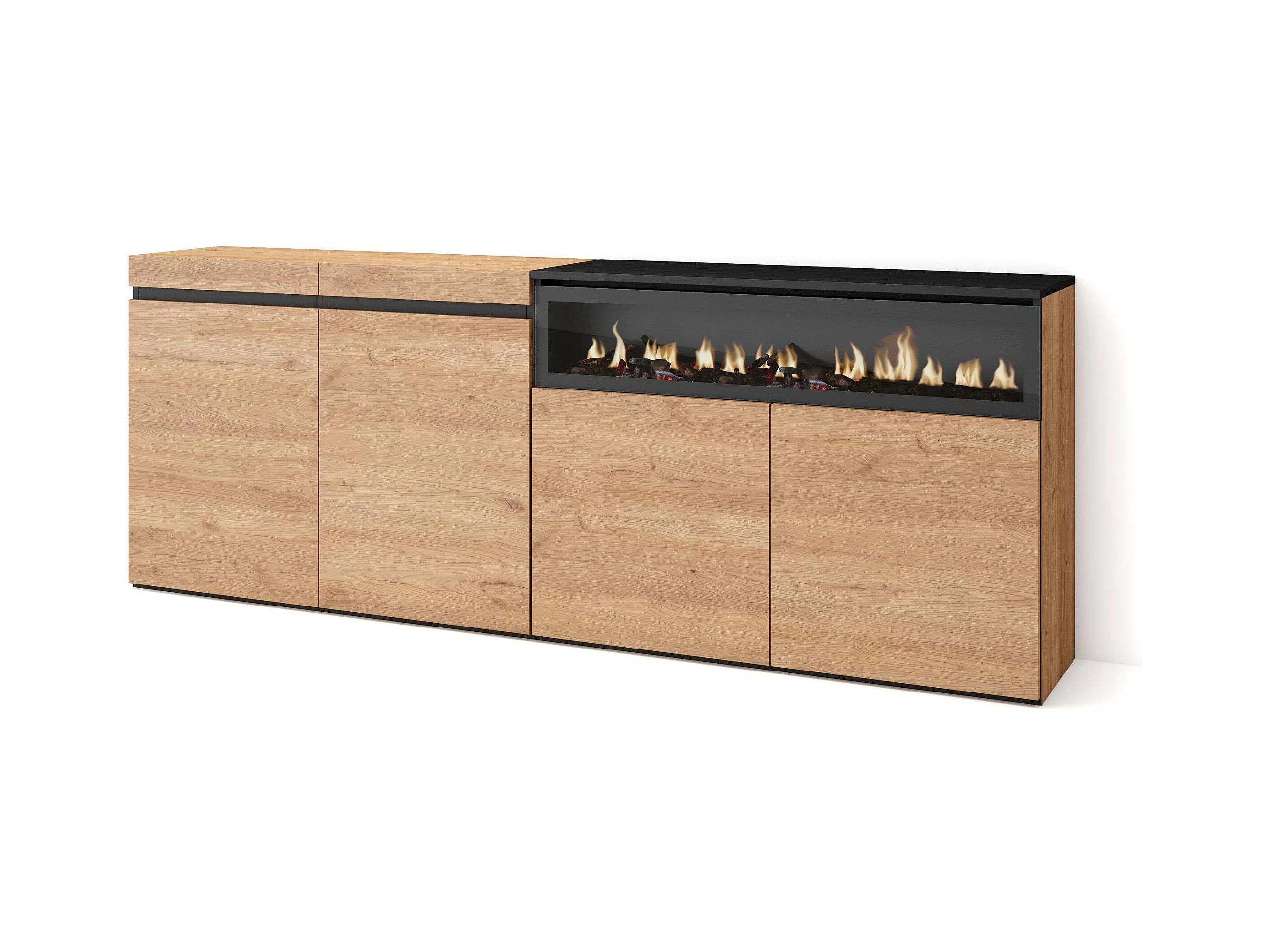 Buffet salon et cuisine, 200x75x35cm, 4 Portes, Cheminée électrique, Chêne et noir