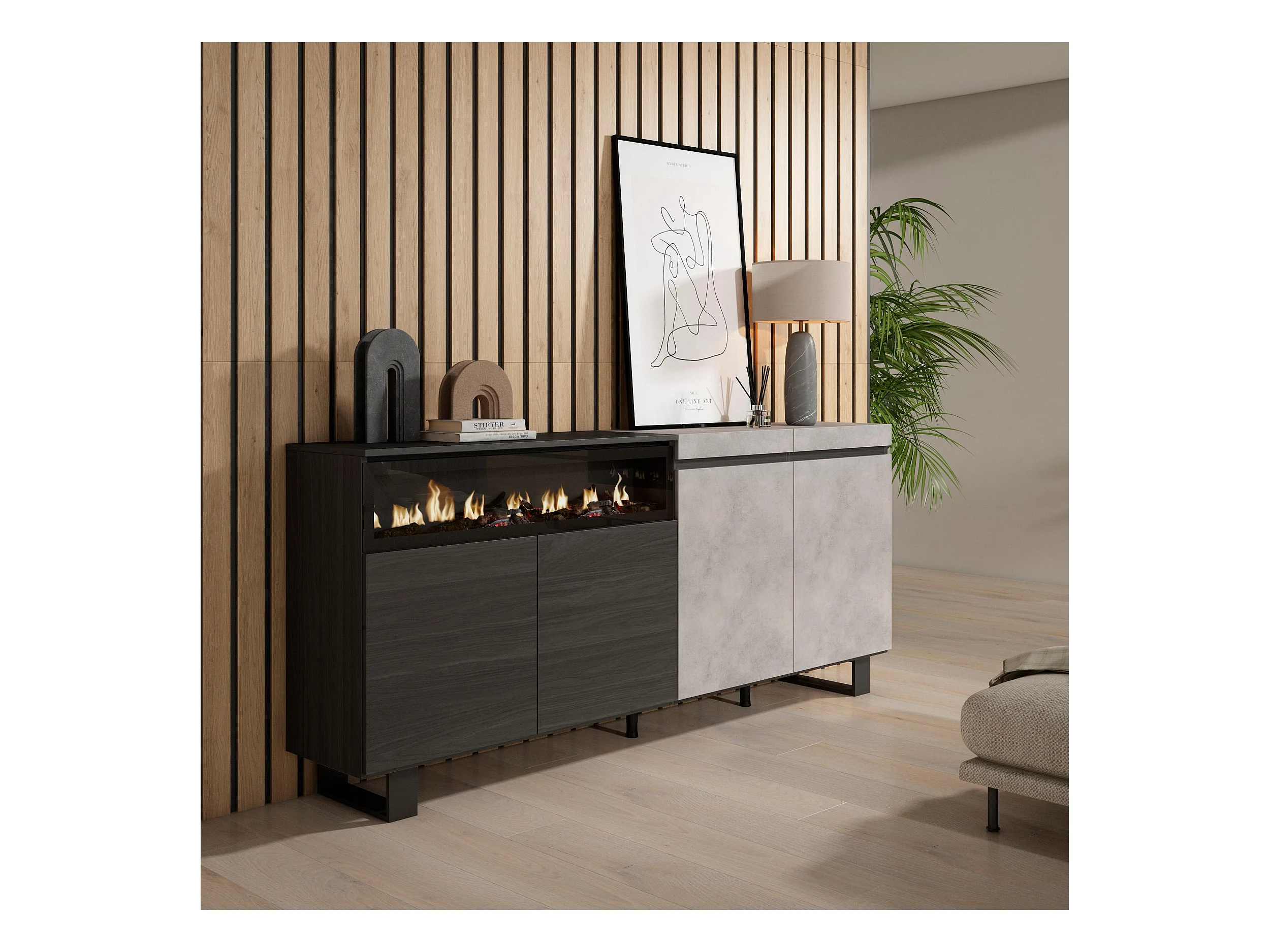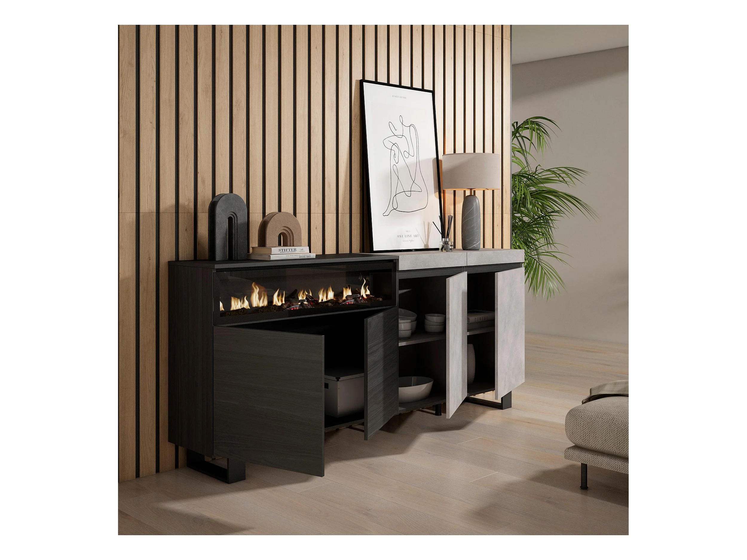 Buffet salon et cuisine, 200x35x87cm, 4 Portes, Cheminée électrique, Design industriel, Ciment